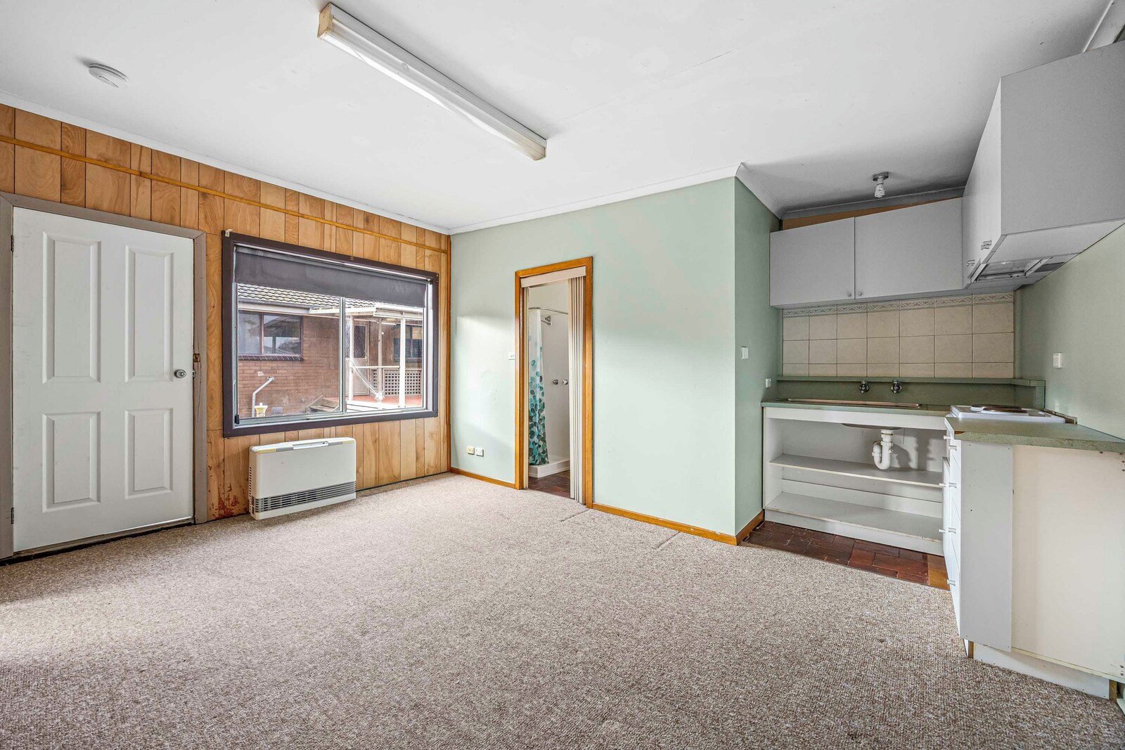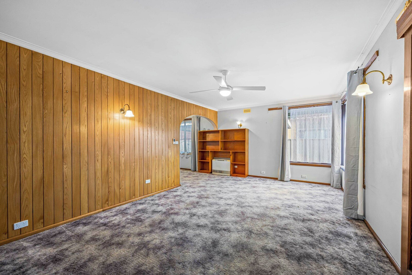 - Lounge room with wall heater & ceiling fan
