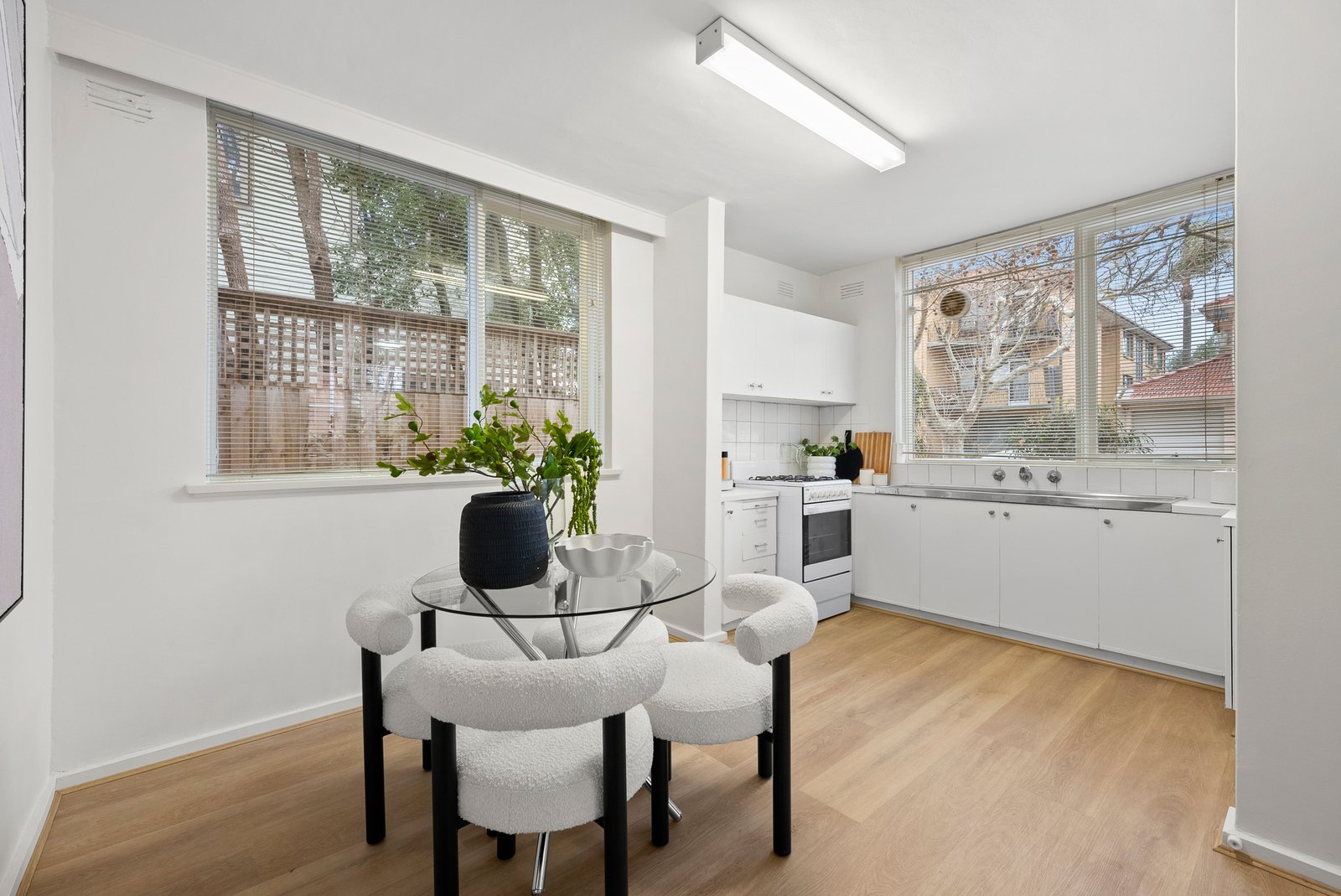 Positioned perfectly between the beach and Elwood Village, this boutique two-bedroom apartment delivers an enviable lifestyle with effortless low-maintenance appeal. Situated at the front of the block, the central hallway leads to a spacious living area, bathed in natural light. Flowing seamlessly into the generously sized, separate kitchen and meals area, with brand new floating floors throughout. Bedrooms feature built-in robes and share a central bathroom that includes a shower, vanity, laundry facilities, and a separate toilet.