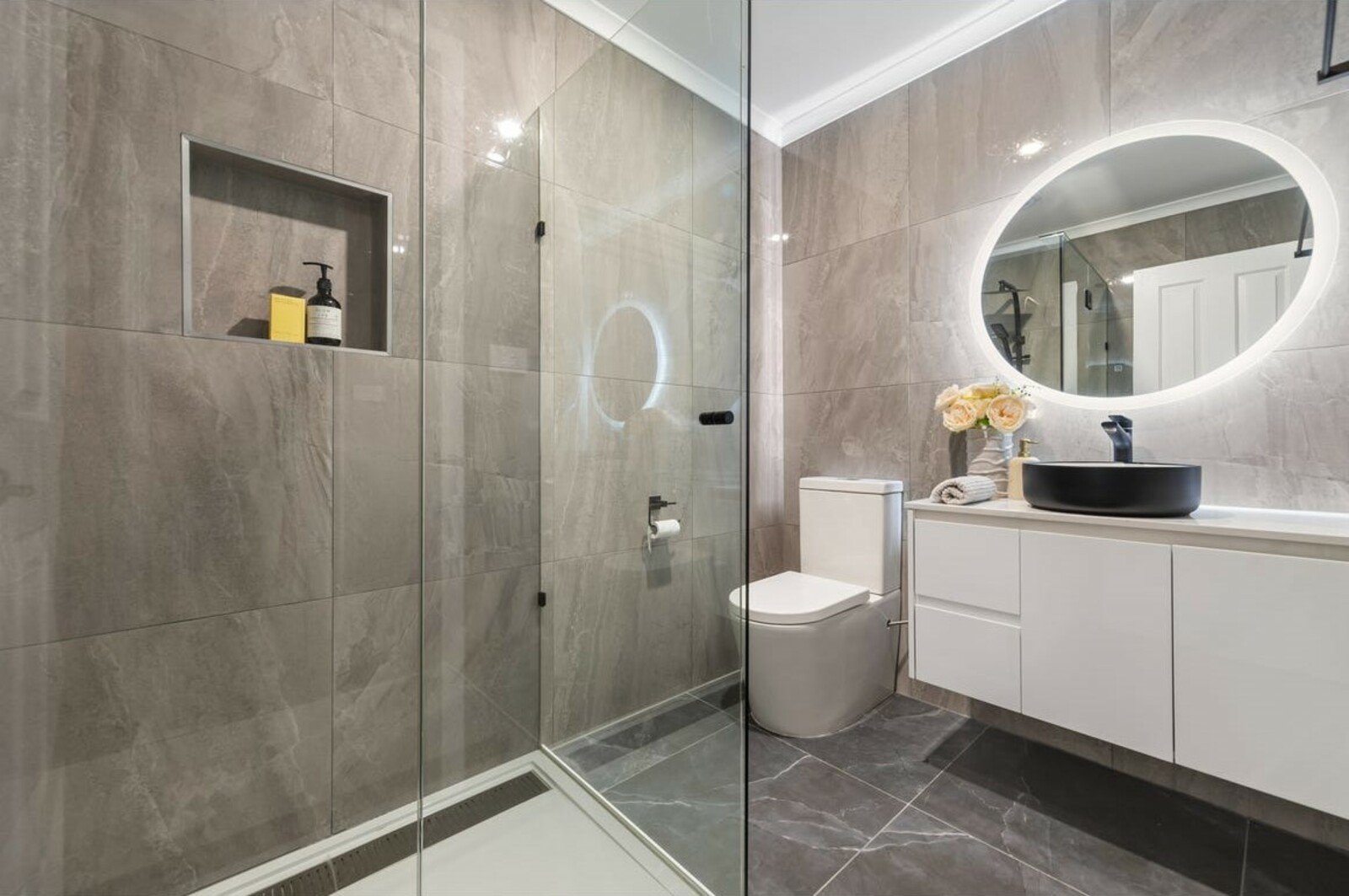 • Contemporary bathroom with sleek fixtures and floor-to-ceiling tiles