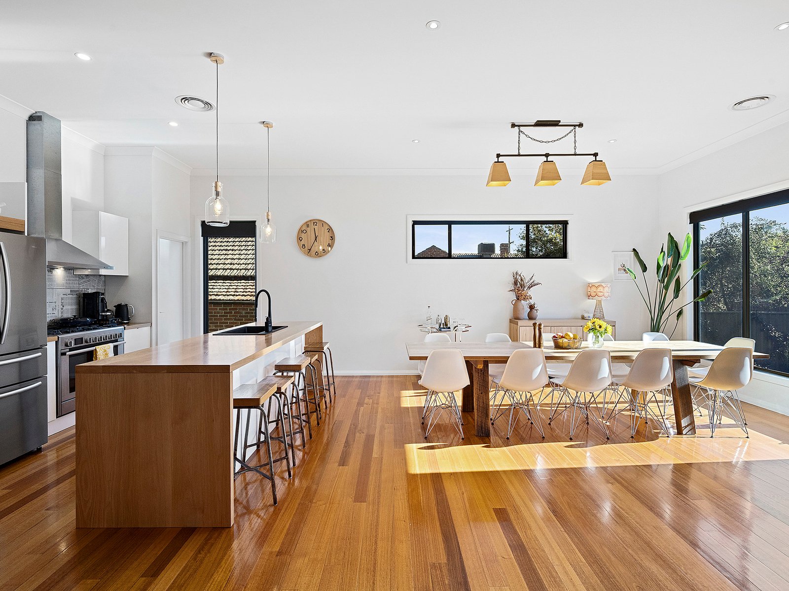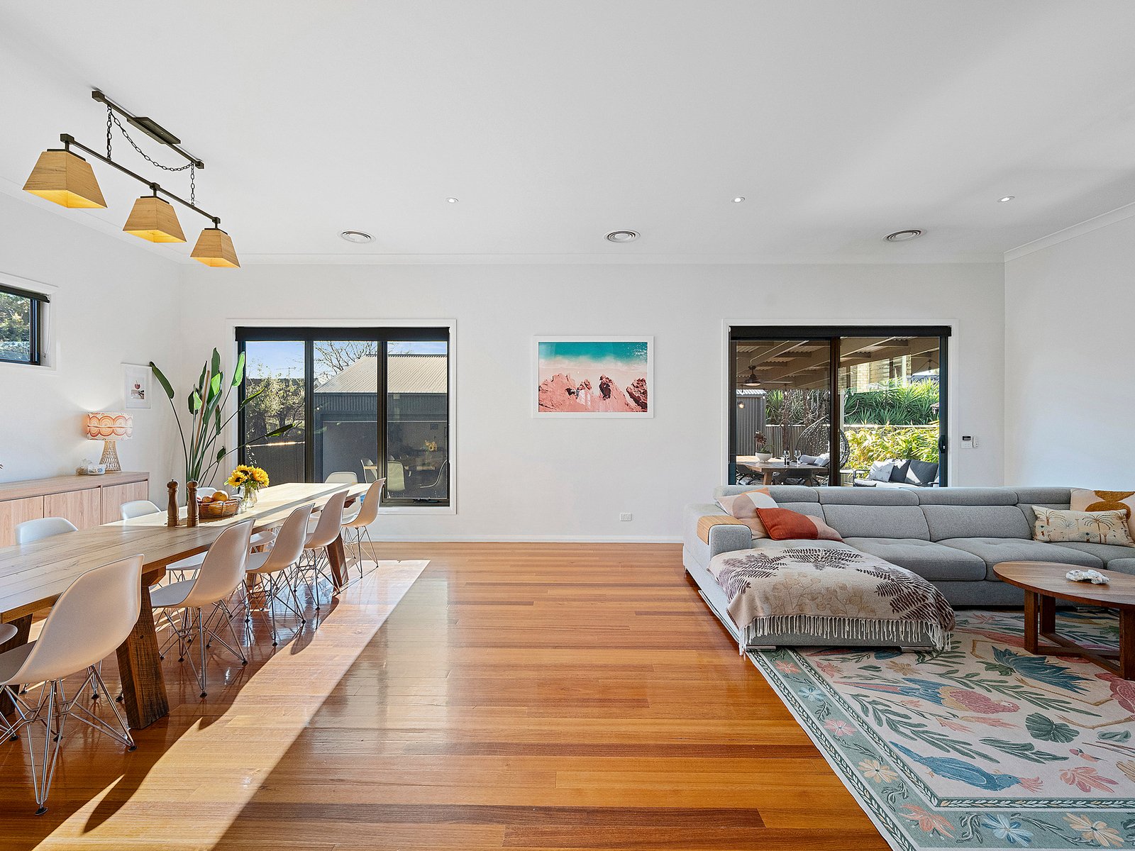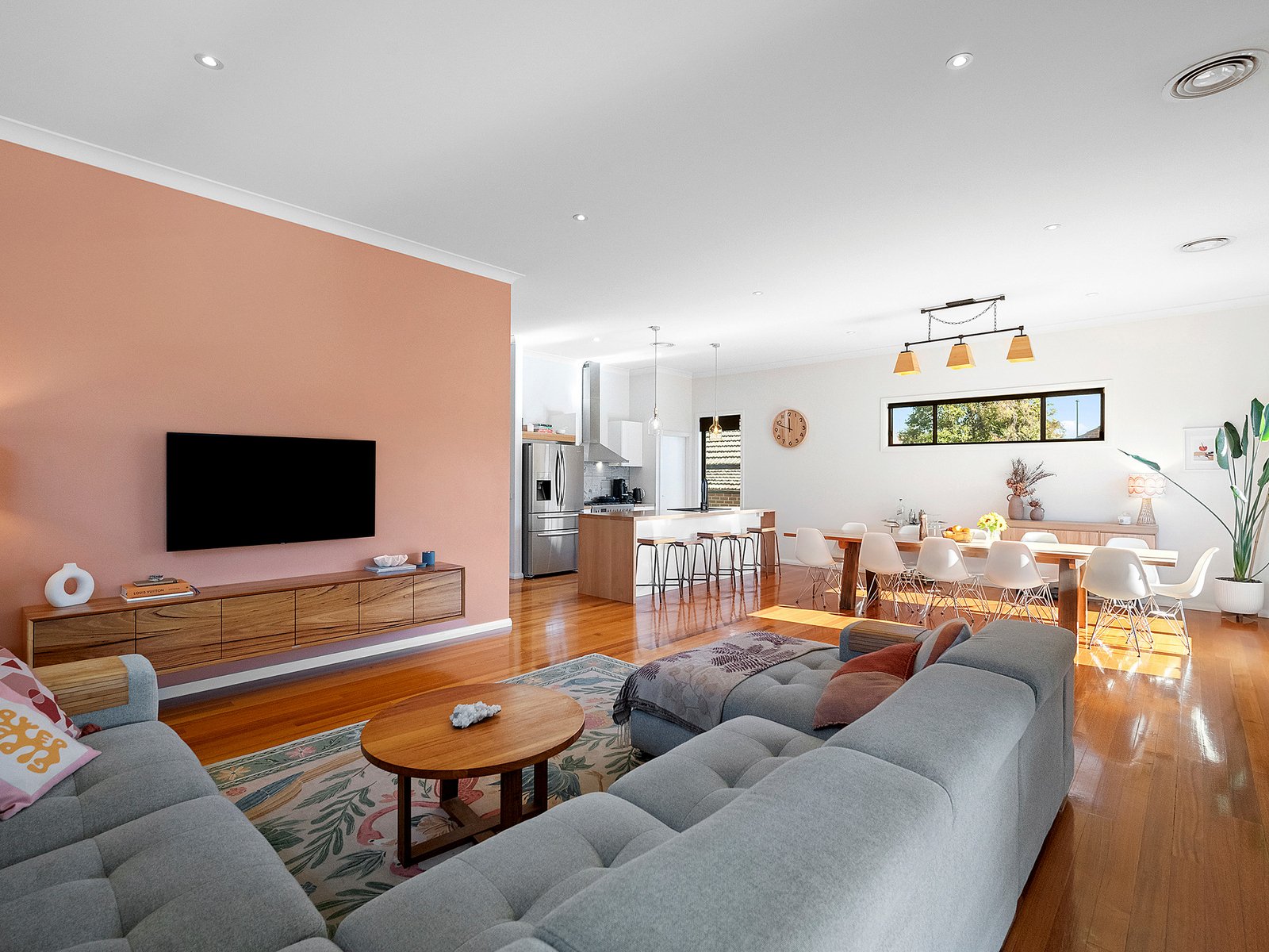 Step down into the heart of the home - an open-plan kitchen, living and meals area designed for modern living. Enjoy polished hardwood floors, quality appliances, and warm timber benchtops, with built-in cabinetry and abundant natural light enhancing the living zone.