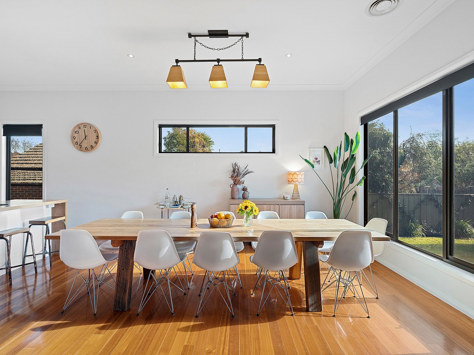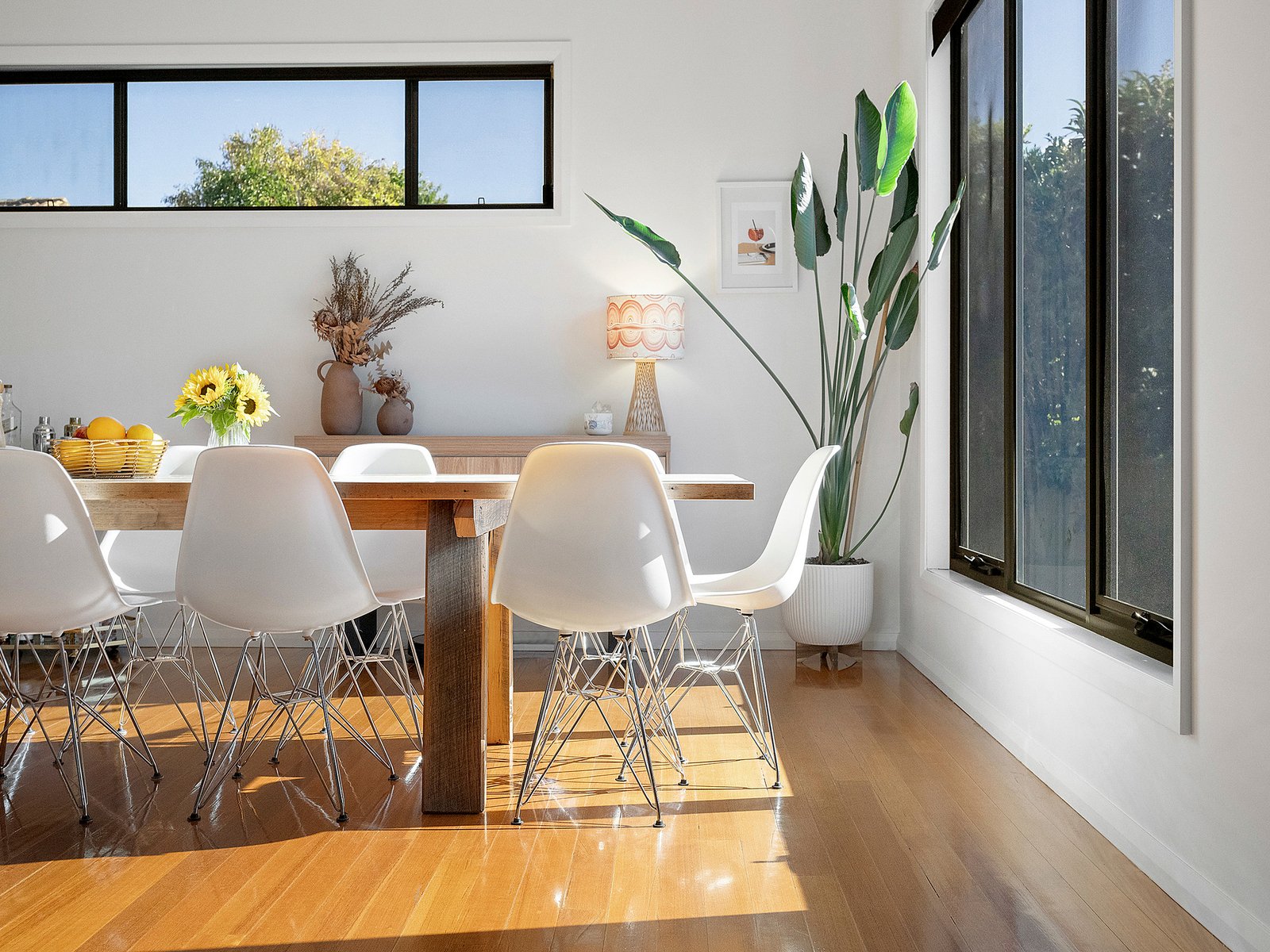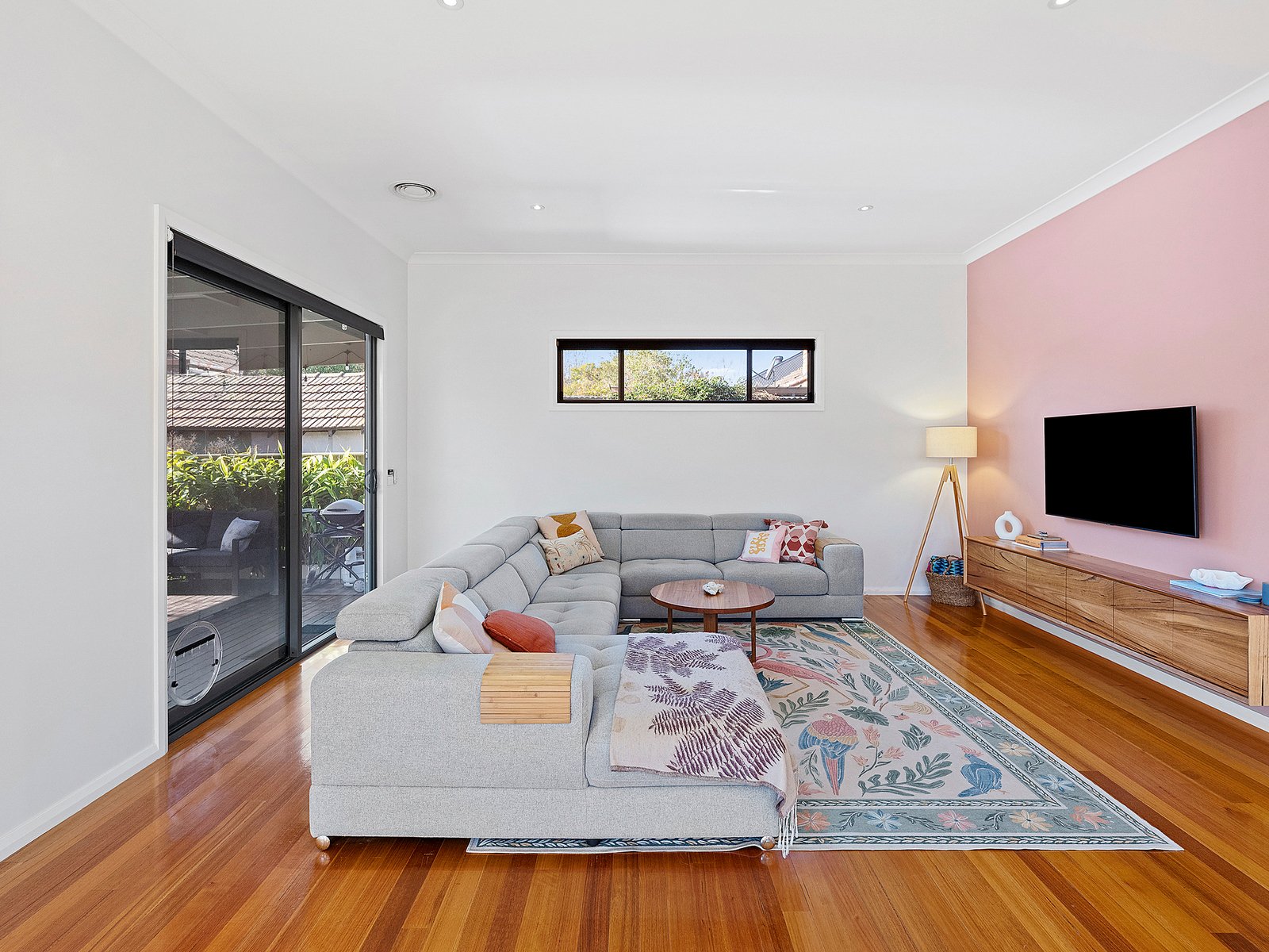 Step down into the heart of the home - an open-plan kitchen, living and meals area designed for modern living. Enjoy polished hardwood floors, quality appliances, and warm timber benchtops, with built-in cabinetry and abundant natural light enhancing the living zone.