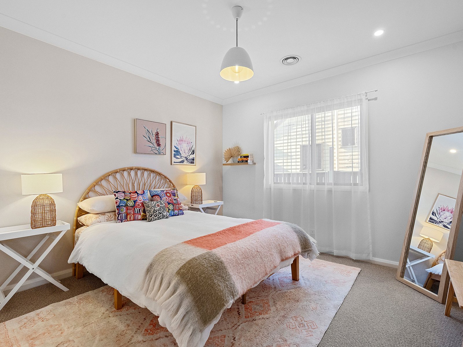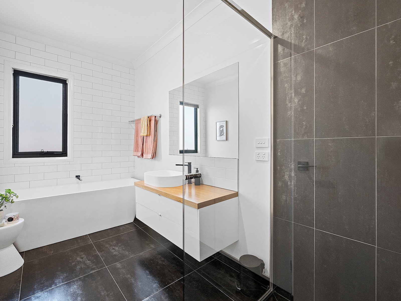 Featuring four or five spacious bedrooms, the main includes a private ensuite and built-in robes, while the remaining rooms include walk in and built in robes. The central bathroom is sleek and stylish, with quality tiled finishes and a full-size bath. Additional conveniences include a European laundry, powder room, ducted heating, reverse cycle cooling, and ceiling fans for year-round comfort.