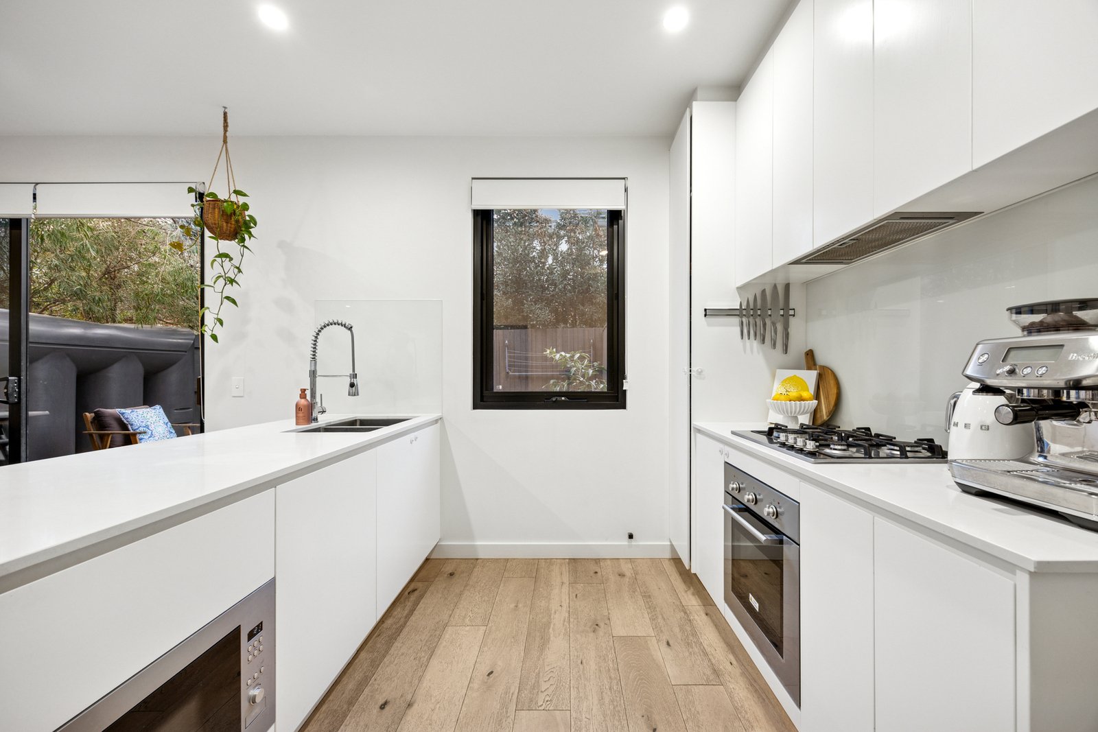 Whisper-quiet thanks to quality double glazing throughout, the accommodation is anchored around an open plan living and dining zone with chic wide-board oak flooring that leads into the sleek kitchen boasting quality appliances and silky stone benchtops. Extending the living space out into the northern sun, the alfresco area offers scope to entertain outdoors as well as enough secure space for little ones or furry friends.