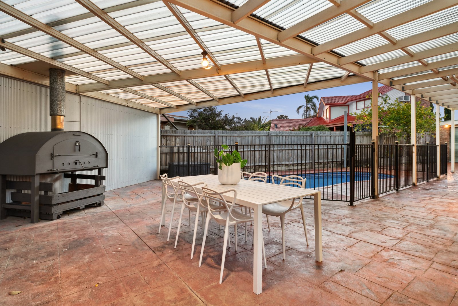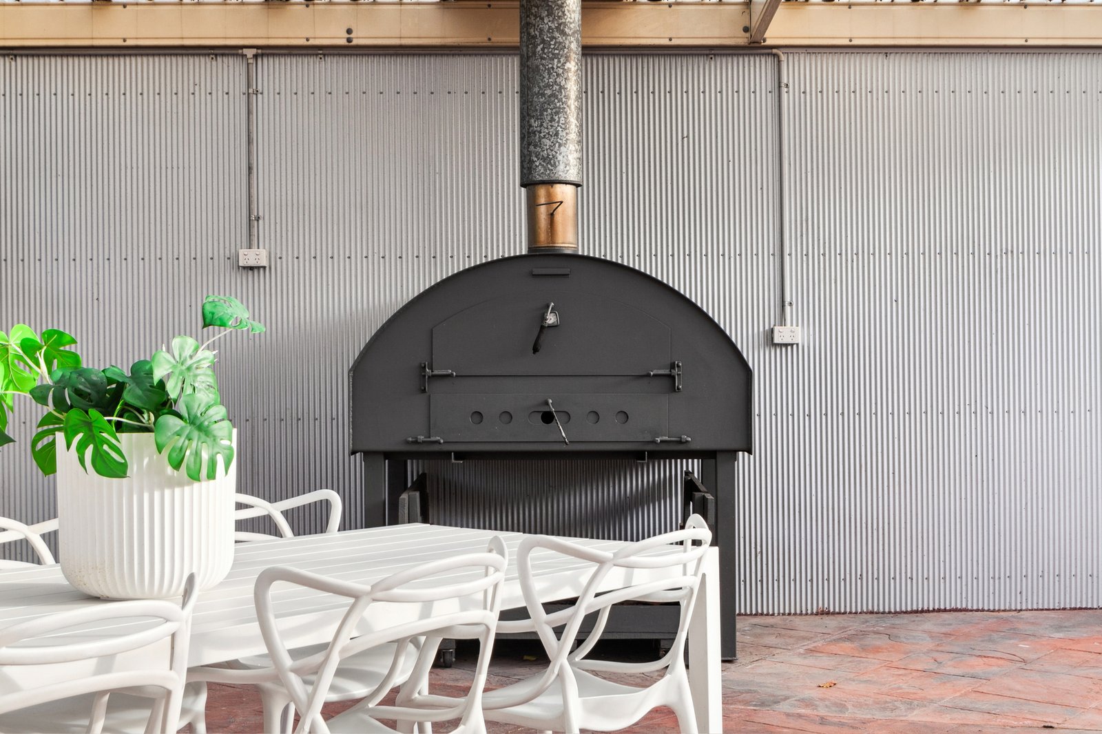 Entertainers will be drawn to the fabulous living zone at the rear that connects seamlessly with the stunning hosts’ kitchen boasting premium shaker-style cabinetry and luxe appliances all topped with chic stone benchtops. Taking in views of the fully-tiled pool, this is perfectly positioned to cater for loved ones inside or out on the sheltered alfresco terrace where you can also light up the wood-fire pizza oven.