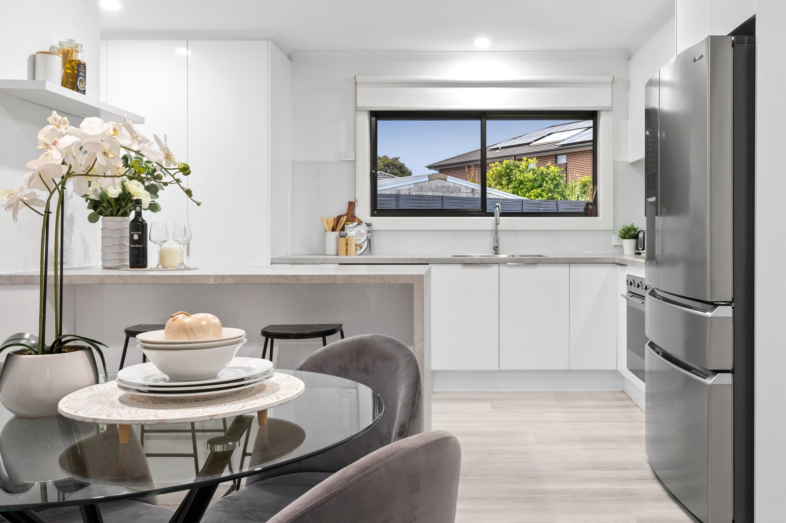 At the heart of the home, the light-filled living area flows effortlessly into the kitchen and dining space, creating a welcoming environment for everyday living and entertaining. The well-appointed kitchen is a chef’s delight, boasting premium Smeg appliances including an oven, cooktop, and dishwasher, all complemented by stylish cabinetry and ample bench space.