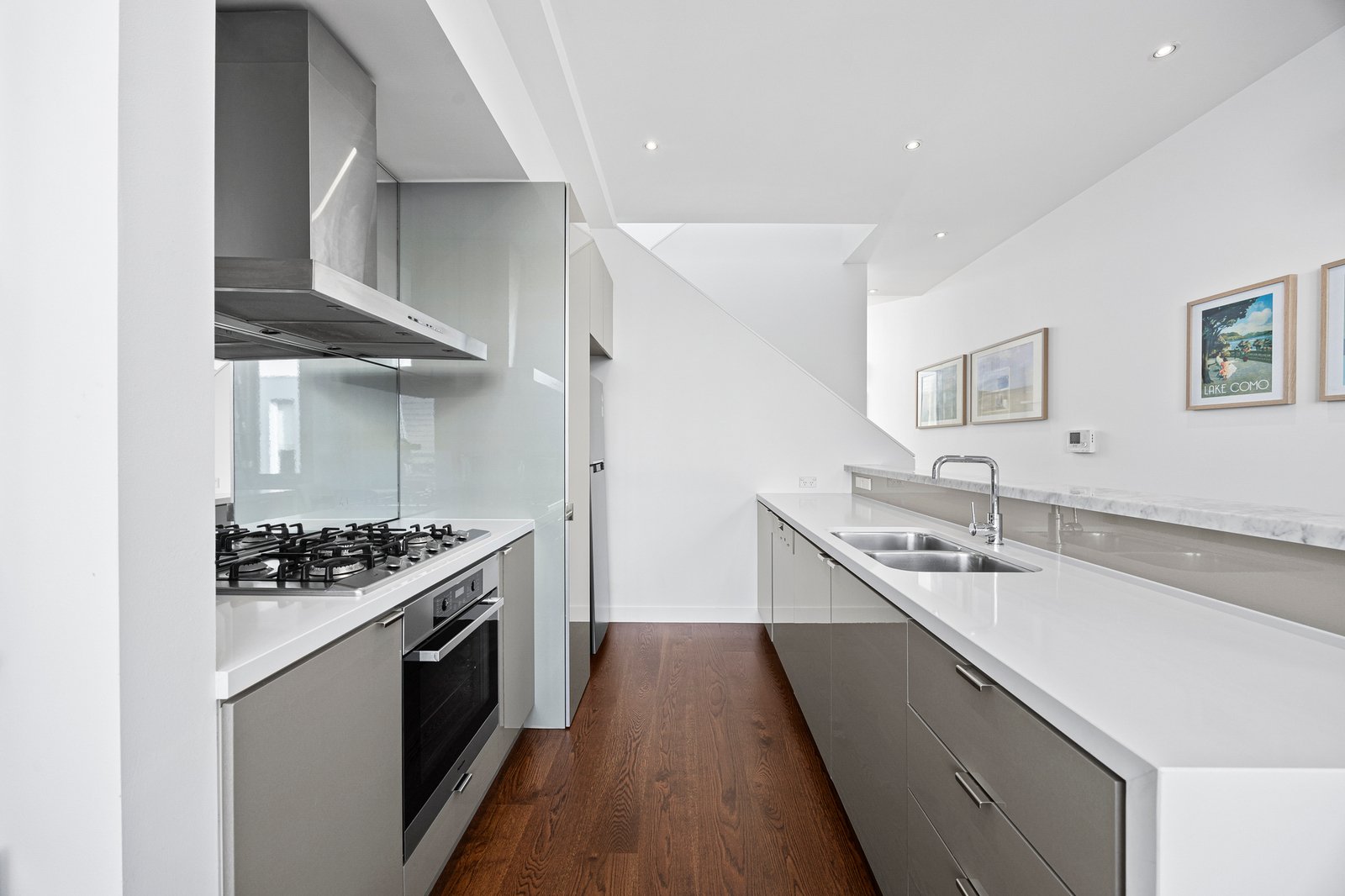 Architectural by design with a sleek marble-detailed Miele kitchen at the heart of the home (and open-plan dining and a lofty vaulted-ceilinged lounge either side), this tall townhouse makes every day a holiday with a private ensuite, custom cabinetry including a media unit for living, and a dual-workstation home-office fit-out for the third bedroom.