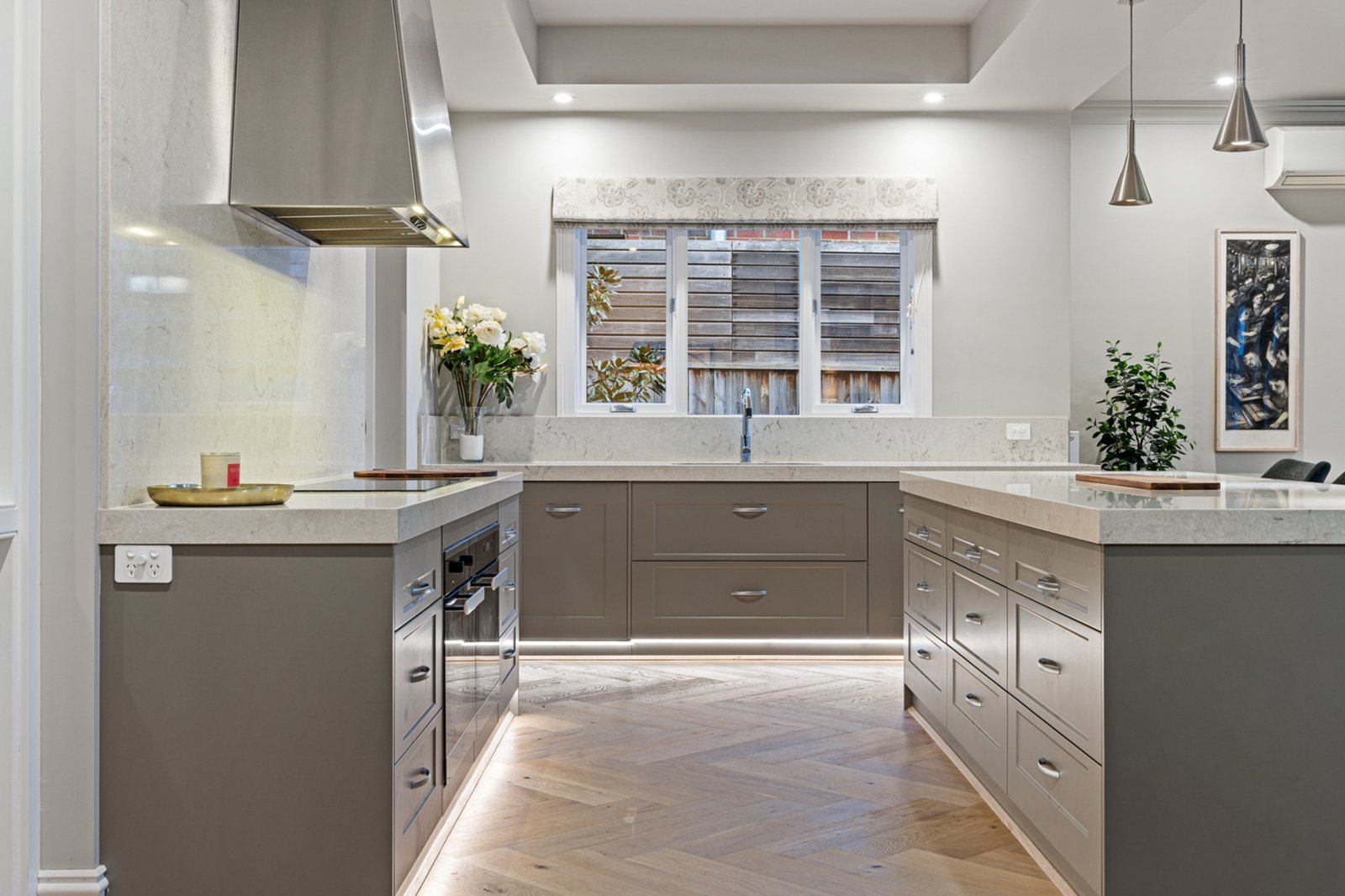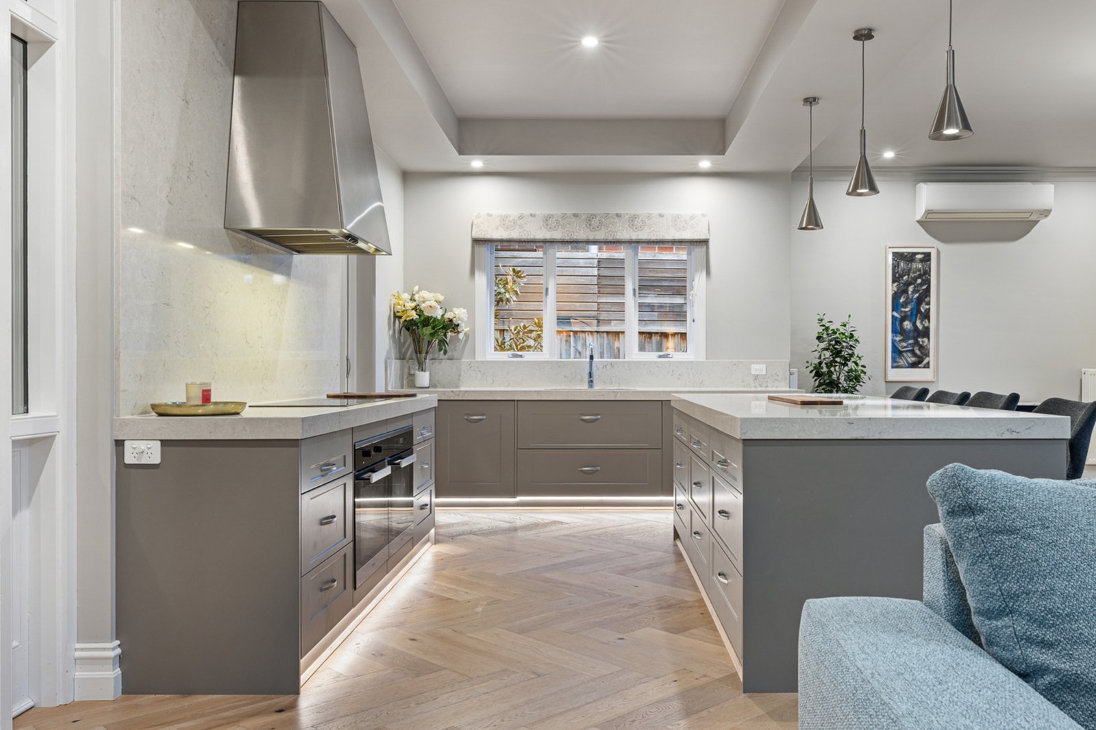 Outside, the home continues to impress with a private, fully landscaped rear garden perfect for entertaining or enjoying peaceful moments in the sun. Additional highlights include herringbone timber flooring, hydronic heating, double glazed windows, a full-sized laundry with joinery, a linen room, and a double lock-up garage accessed via an automated gate and circular driveway.