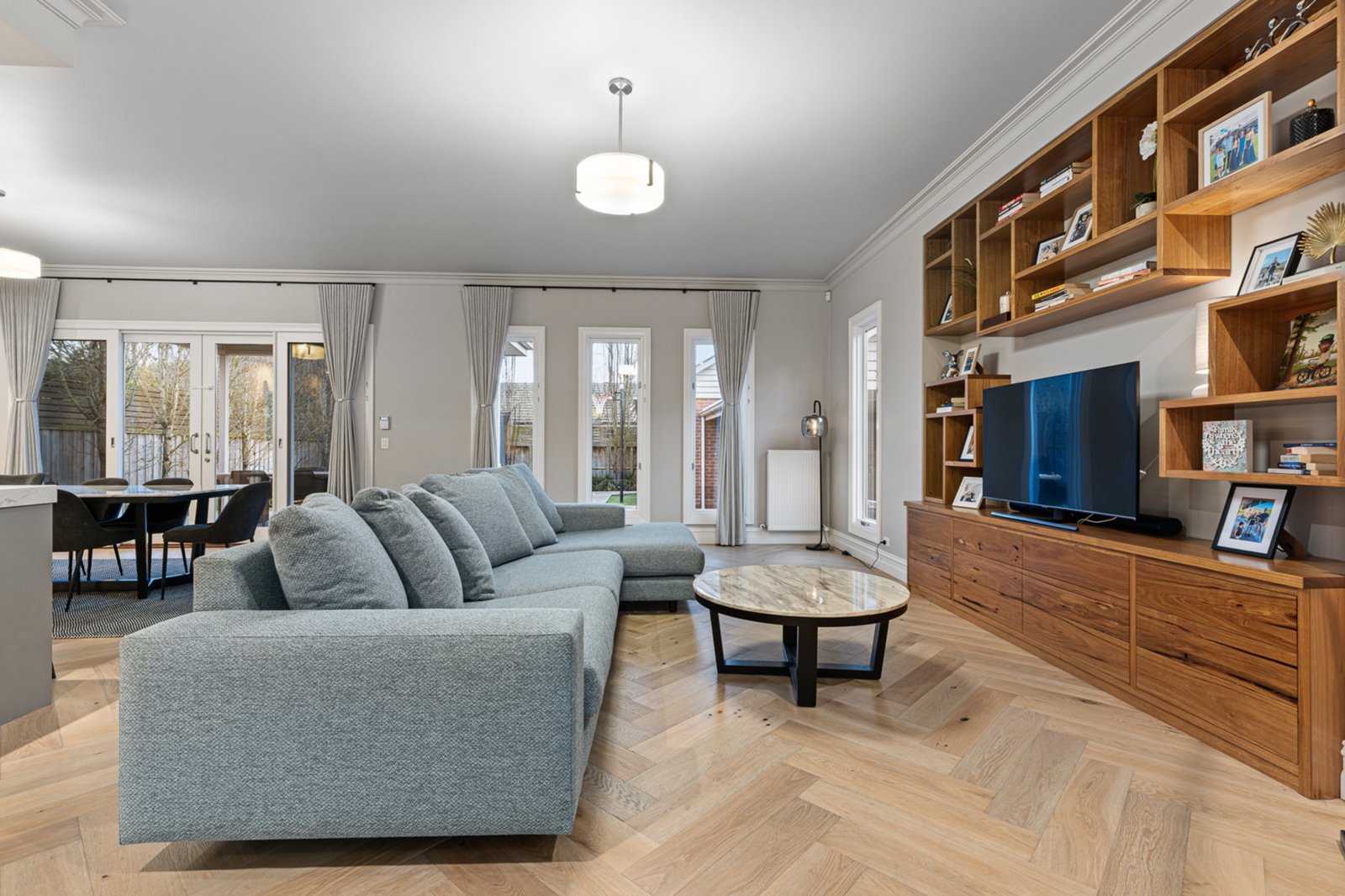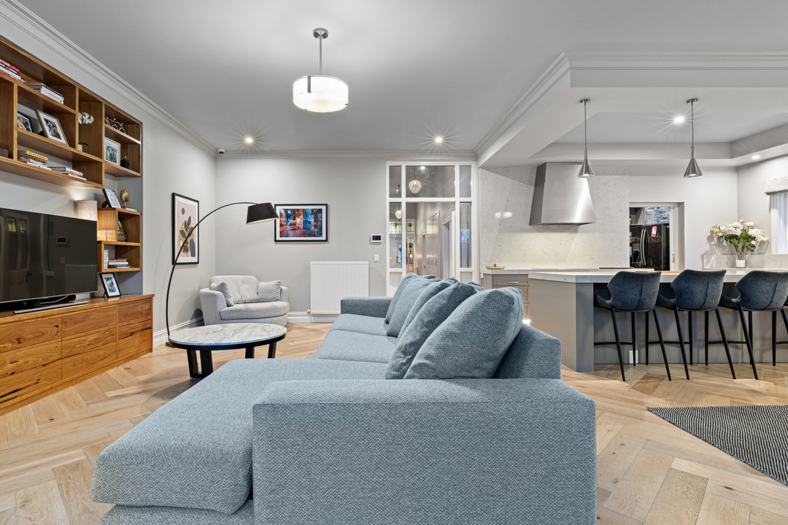The formal lounge captures beautiful garden vistas, while the expansive family living area at the rear offers warmth and comfort with bespoke timber joinery and a gas log fire. Entertainers will fall in love with the high-end chef’s kitchen, featuring luxurious granite benchtops, Miele appliances, a spectacular butler’s pantry, and handcrafted cabinetry – all designed to cater to both everyday living and grand-scale entertaining.