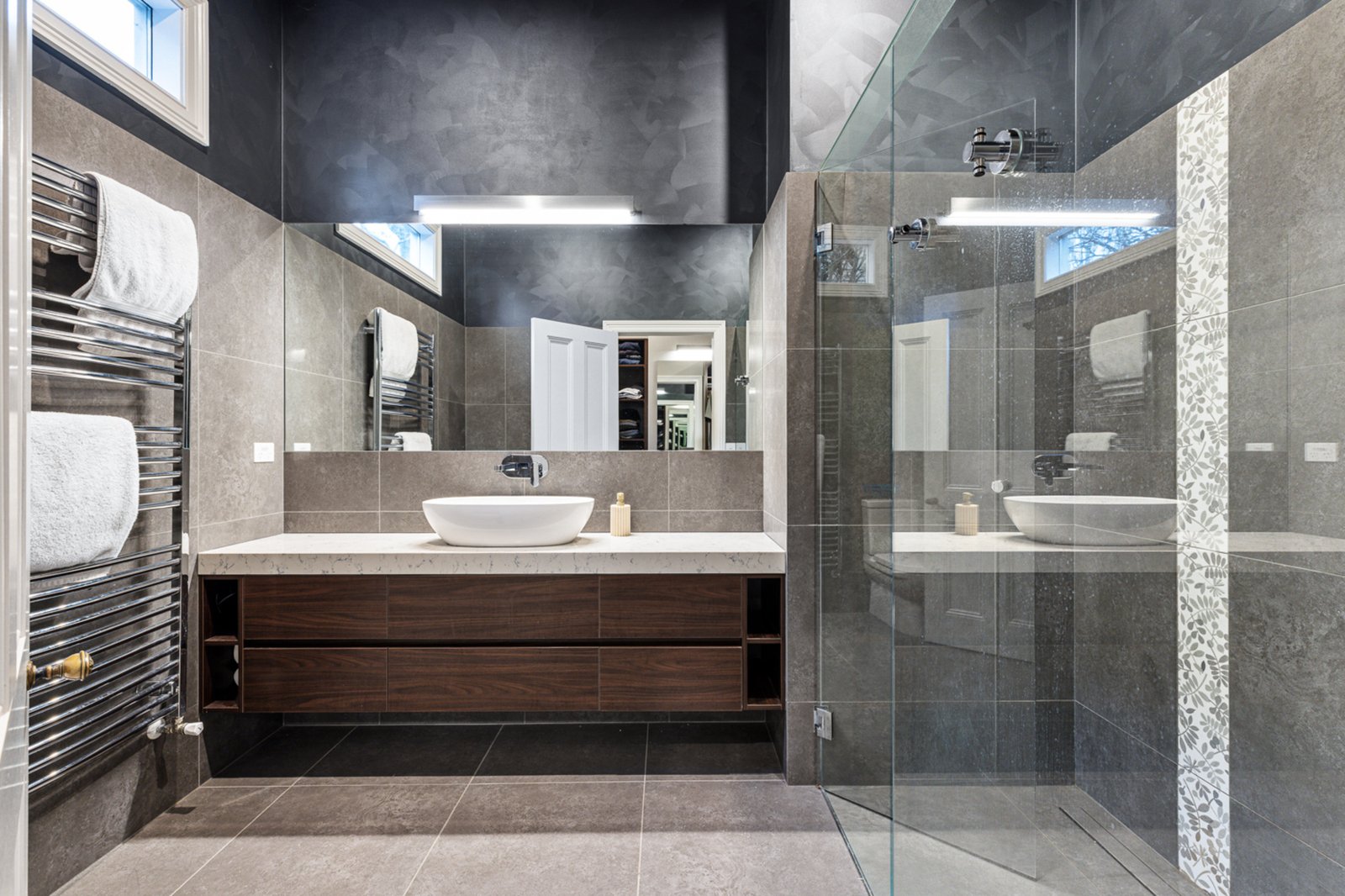 All bedrooms are generously proportioned, comfortably accommodating king-sized beds, and offer ample built-in storage. The showstopping master suite boasts a walk-through robe and a stunning private ensuite with marble finishes. A glamorous central bathroom services the additional bedrooms and includes a feature bathtub and frameless shower. A fifth bedroom or home office, complete with custom cabinetry, adds further flexibility for families or professionals working from home.