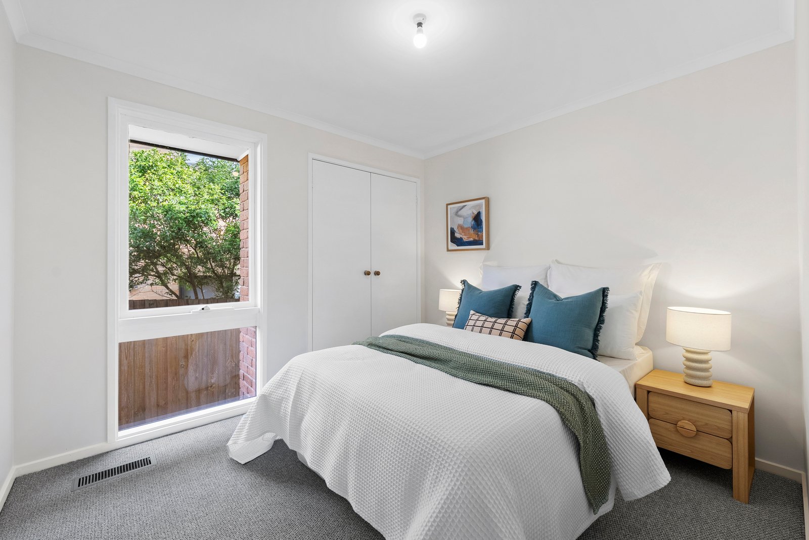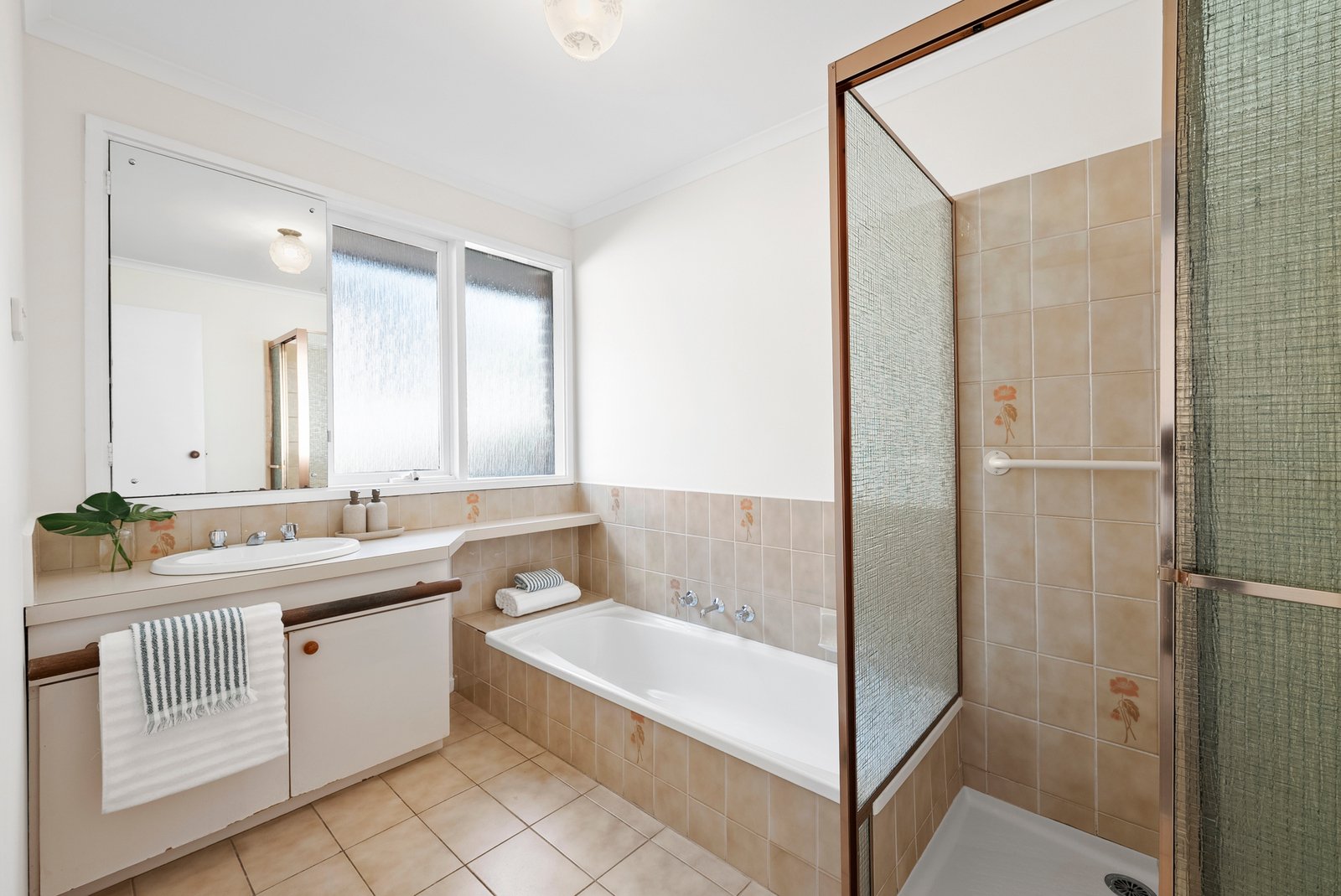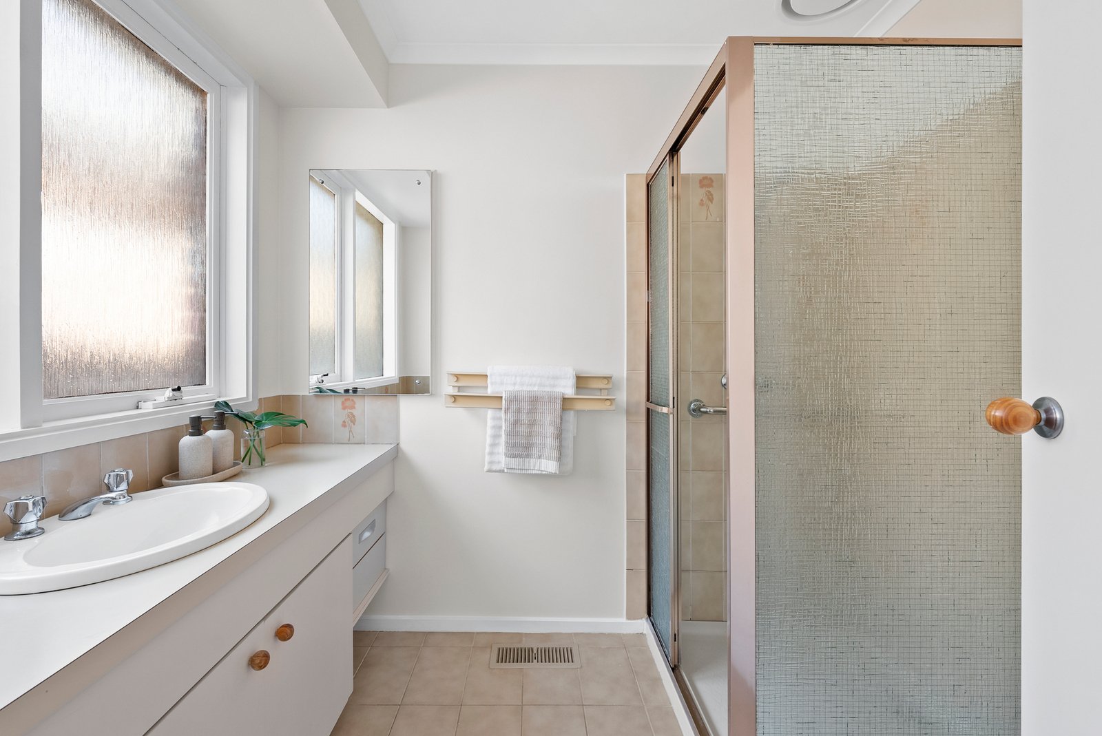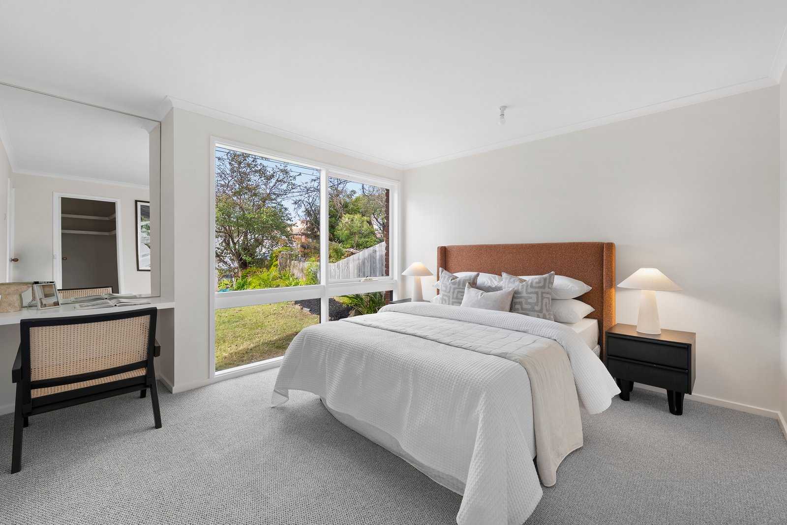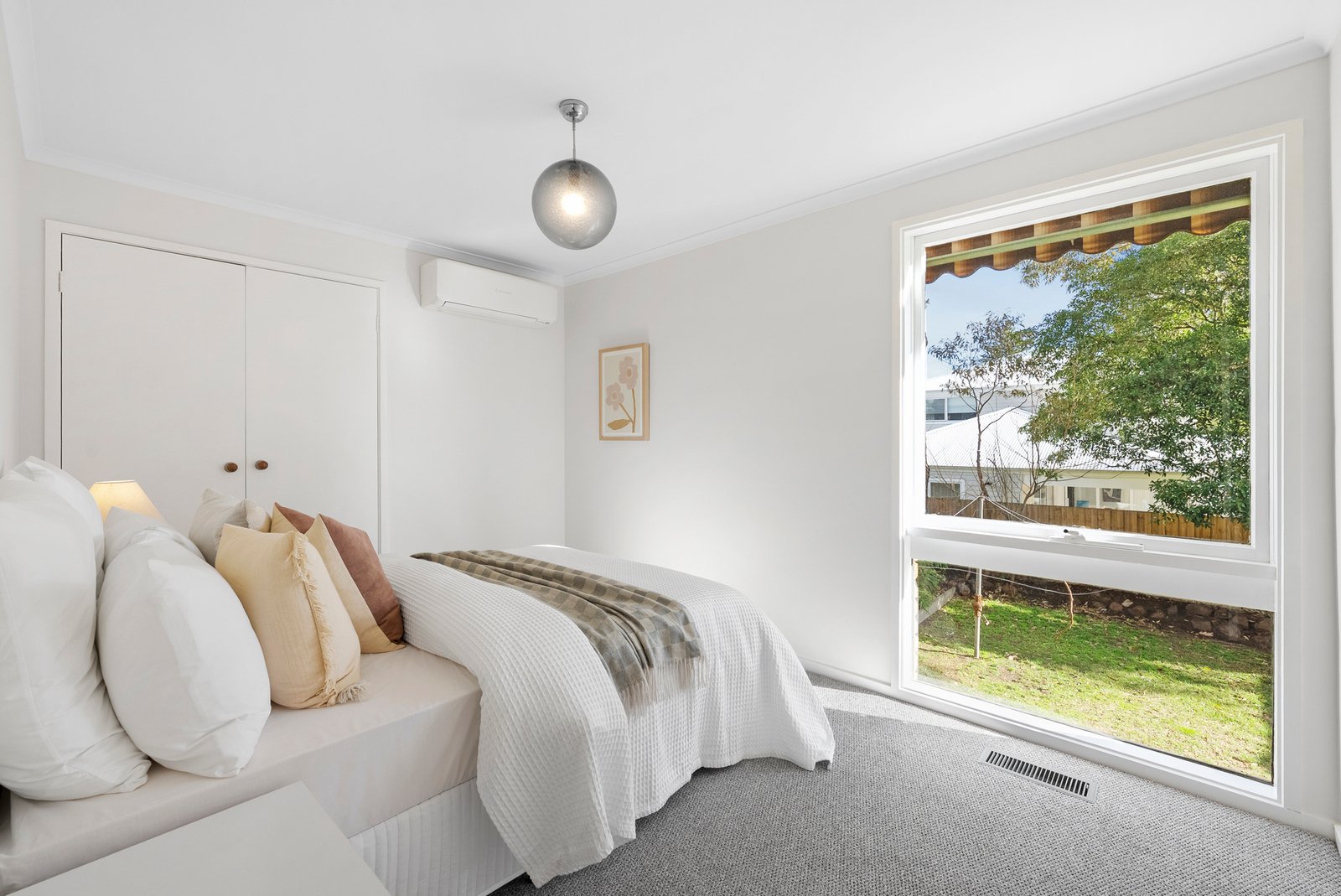 Introduced by a welcoming entry hall, the upper level reveals four bedrooms where leafy outlooks and natural light create a calm and inviting atmosphere. The master bedroom enjoys front garden aspects, a walk-in robe and a stylish ensuite, while three additional bedrooms, each with built-in robes, and one with a split system, are well served by a bright central bathroom with separate bath and shower.