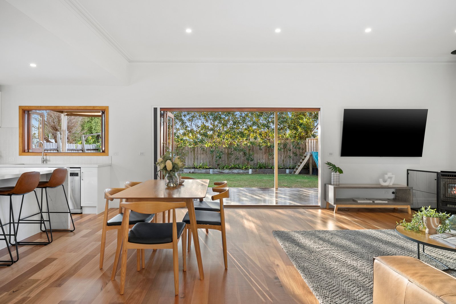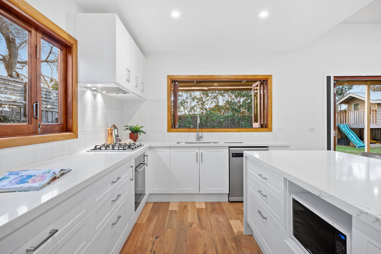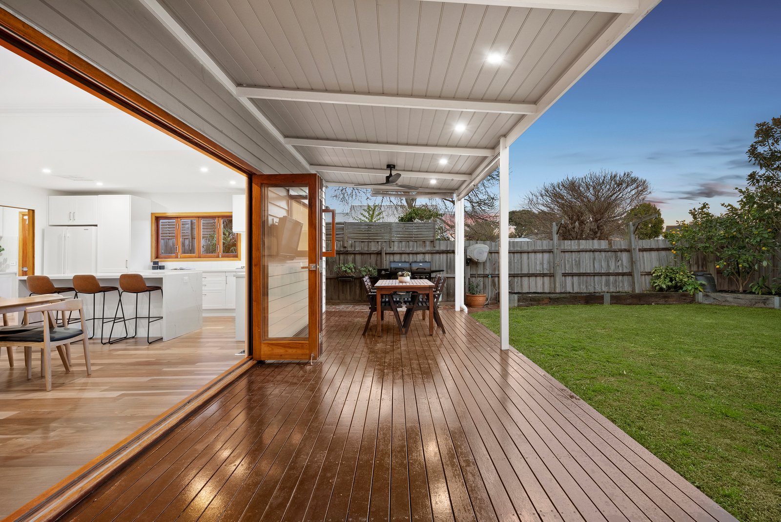 Bifold doors and a clever kitchen servery window seamlessly link the interiors with a stunning undercover al fresco deck, complete with ceiling fans for year-round comfort. Beyond, a lush, low-maintenance northern garden stretches deep, offering ample lawn for children and pets.