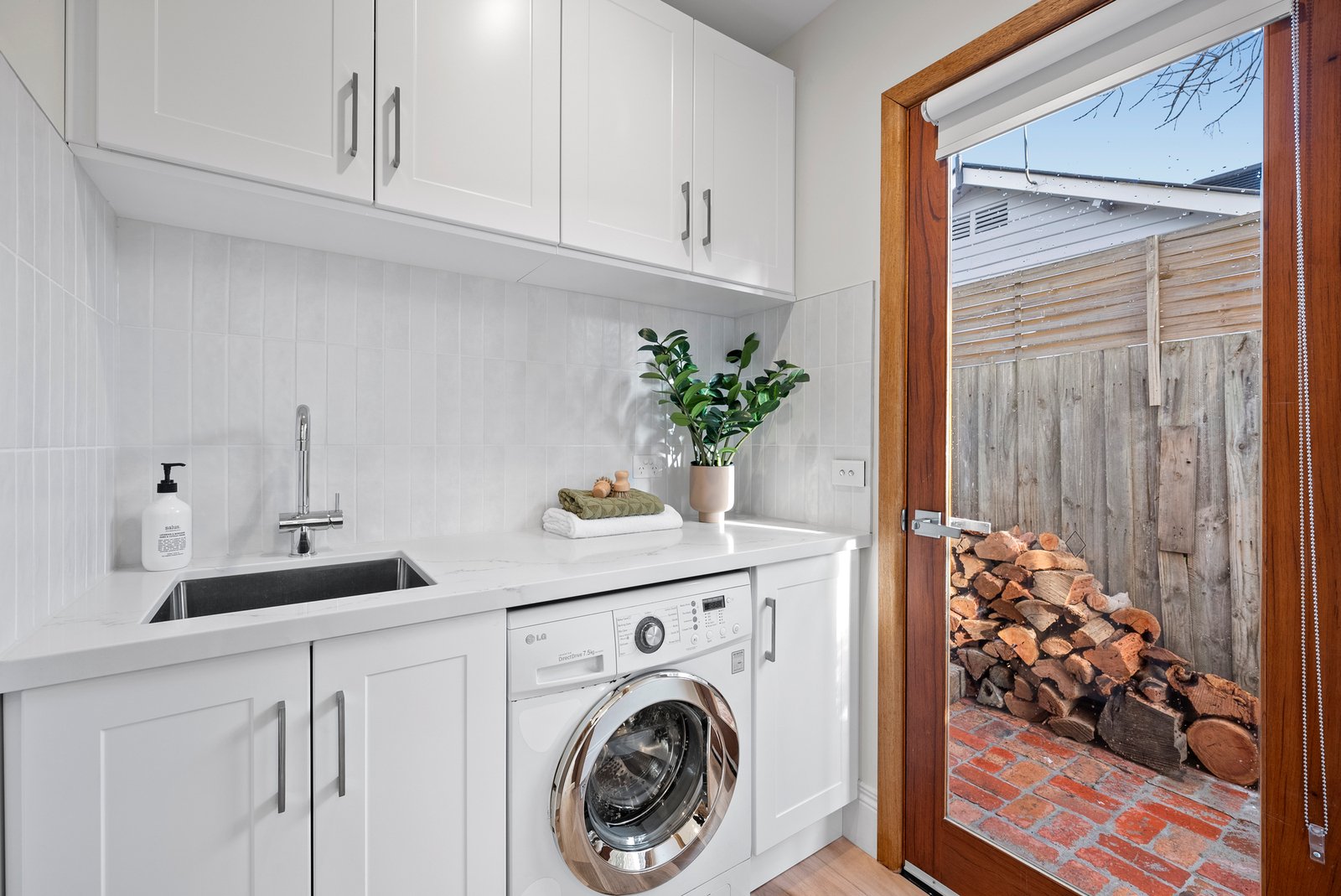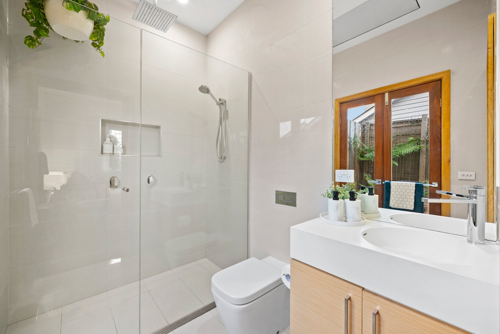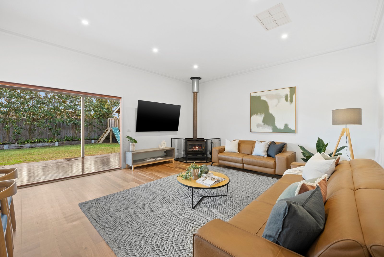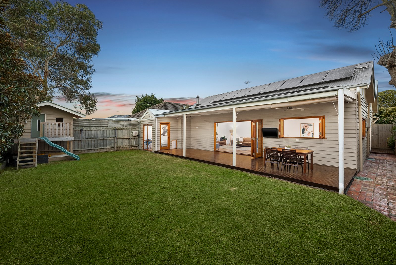 Bifold doors and a clever kitchen servery window seamlessly link the interiors with a stunning undercover al fresco deck, complete with ceiling fans for year-round comfort. Beyond, a lush, low-maintenance northern garden stretches deep, offering ample lawn for children and pets.