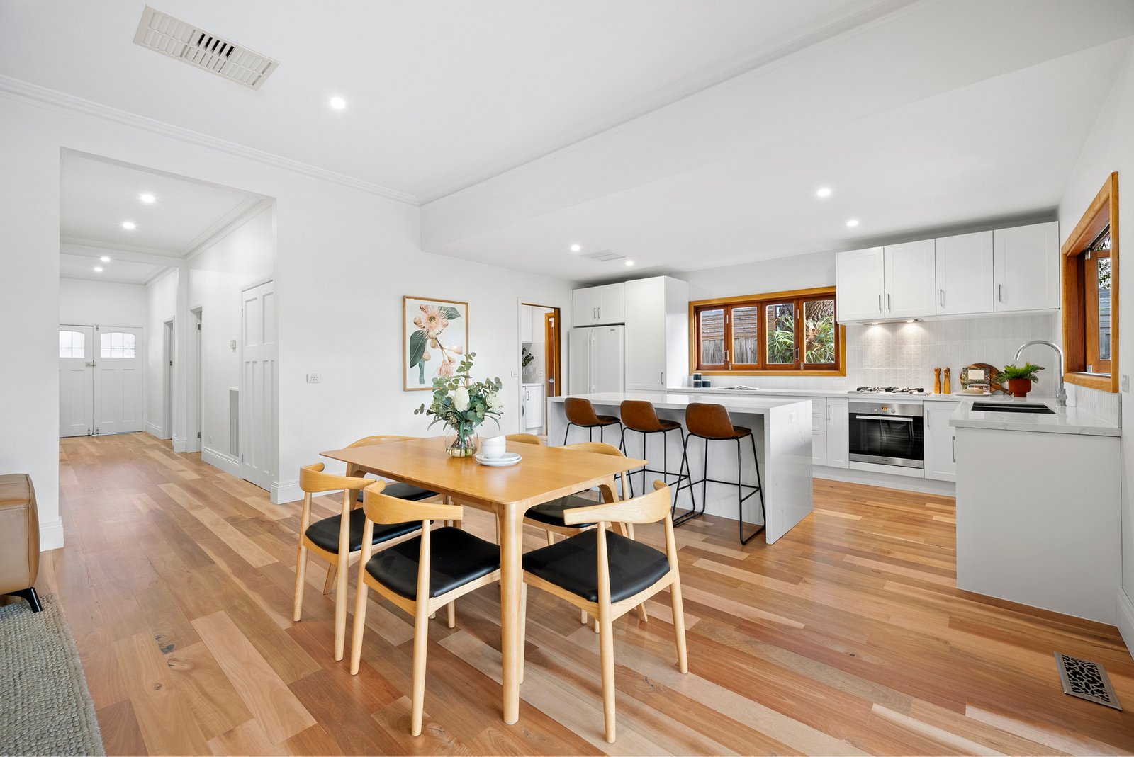 Introduced by a wide entrance hall with high ceilings and warm timber floors, the home’s inviting ambience is immediately apparent.