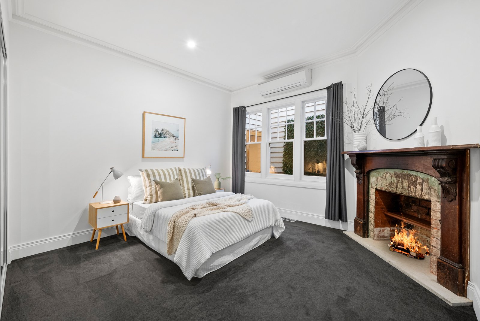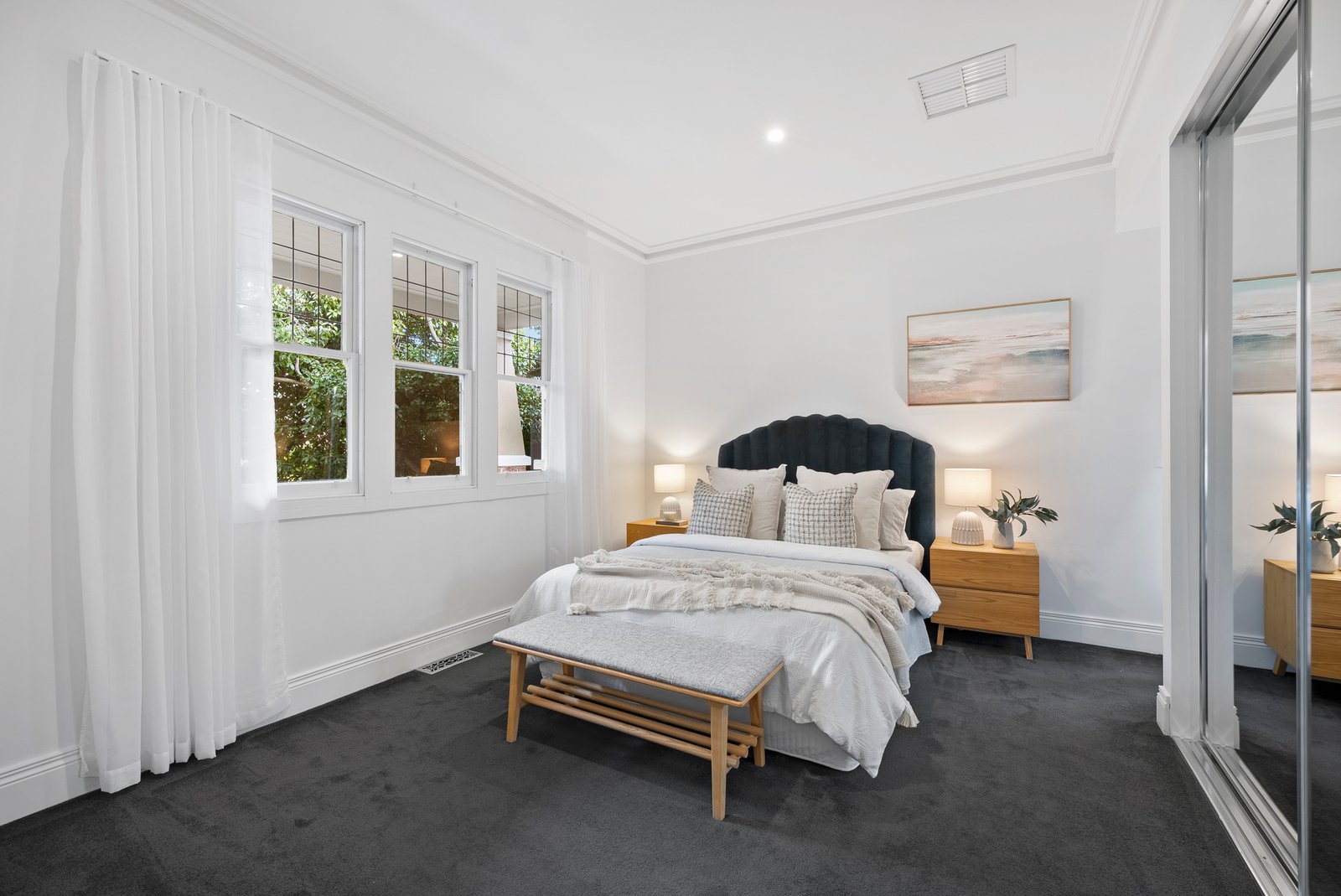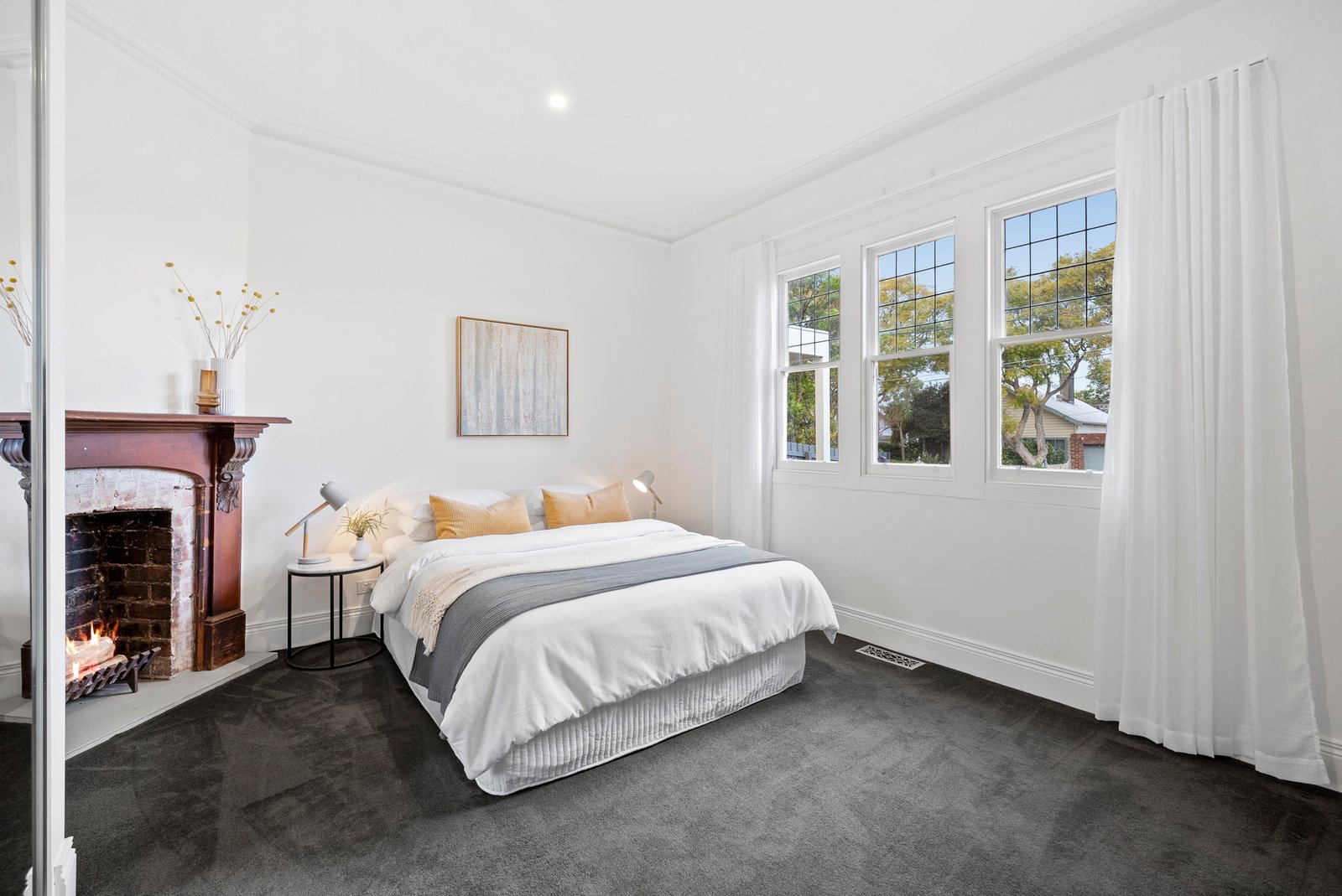 A serene master bedroom enjoys mirrored robes, front garden outlooks and a sleek ensuite with double shower, while two additional bedrooms - each with an original fireplace and mirrored robes - also share leafy outlooks, with one offering split-system air conditioning. A luxurious central bathroom with a deep soaker tub and separate shower adds a touch of everyday indulgence.