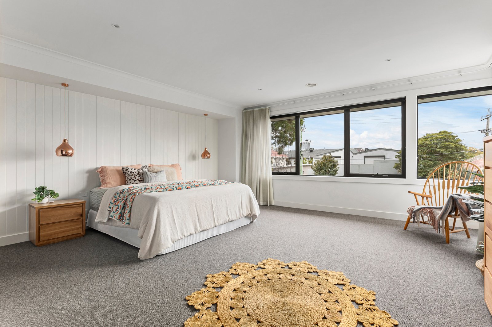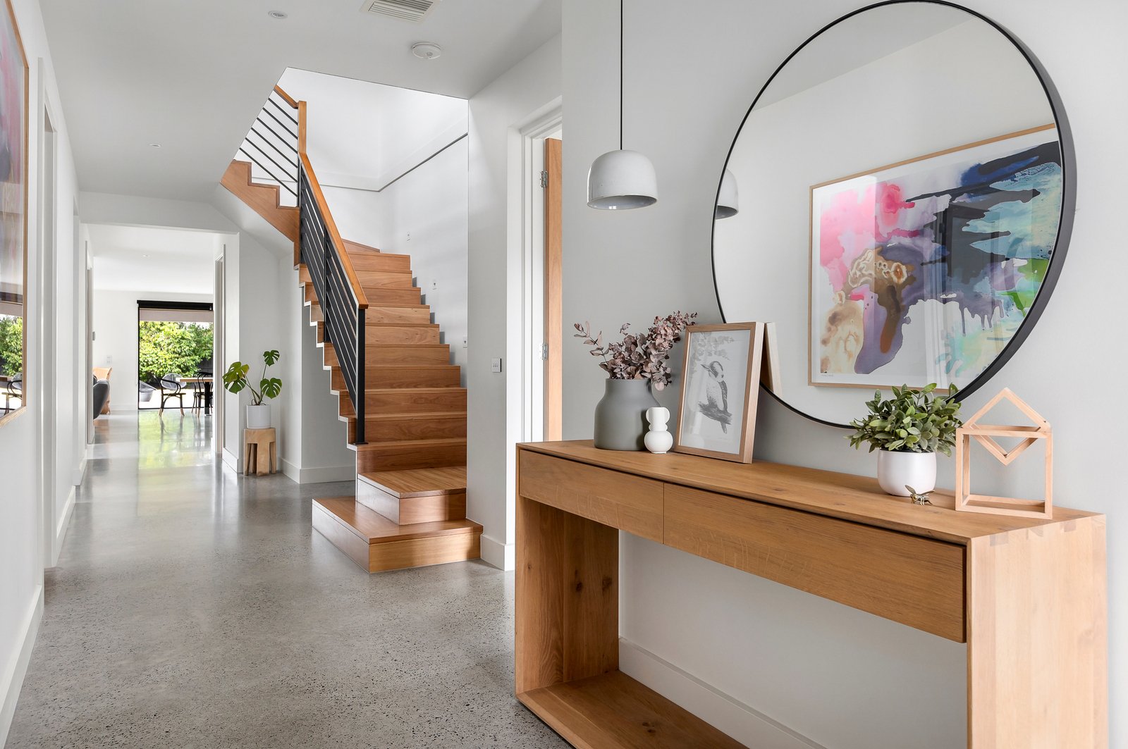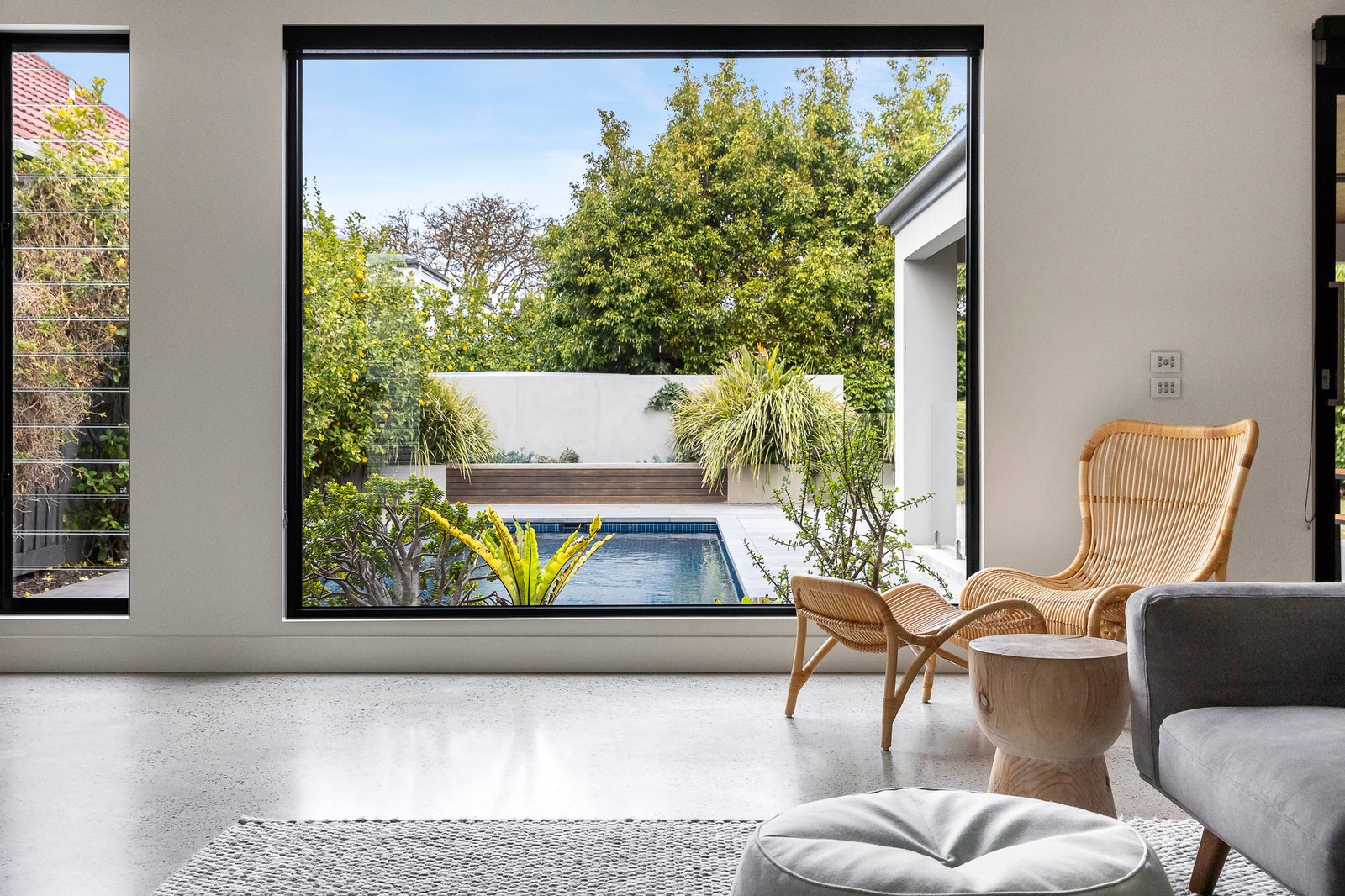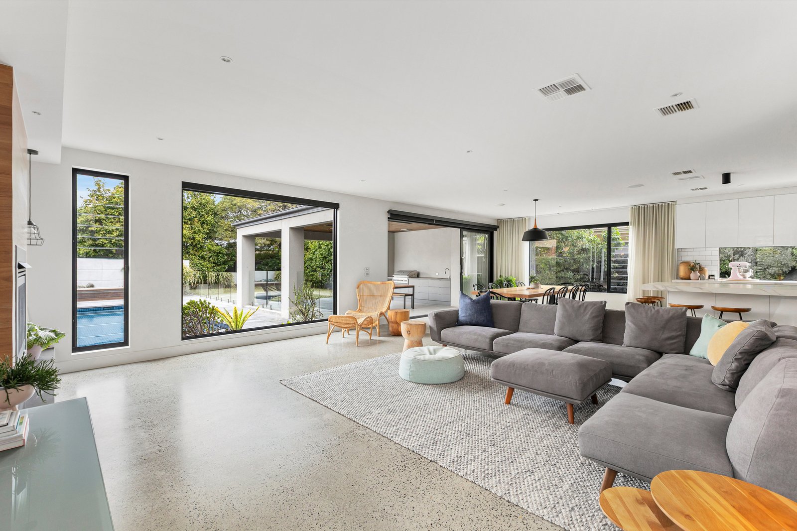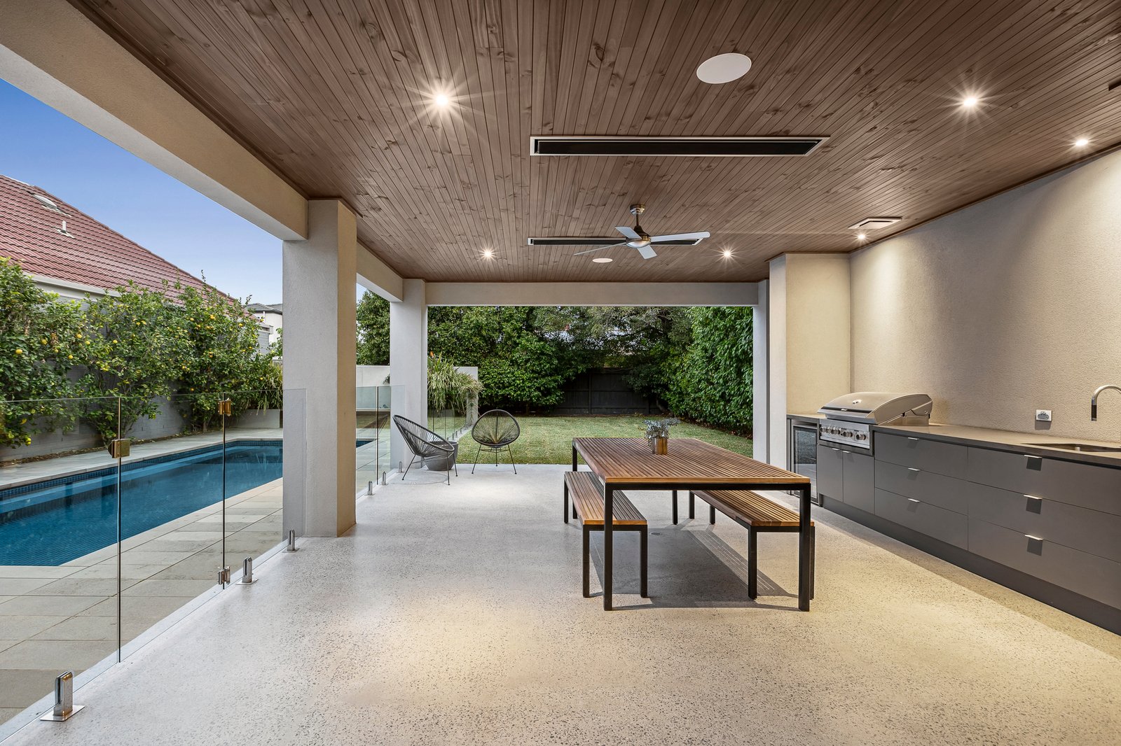 Signature finishes elevate the everyday - polished concrete flooring, solid Blackbutt accents, V-groove panelling, wool loop-pile carpets, pendant lighting, and floor-to-ceiling sheers with blockouts. Climate comfort is assured with zoned ducted heating and cooling, while 20 solar panels, solar hot water and pool heating ensure energy efficiency and sustainability.