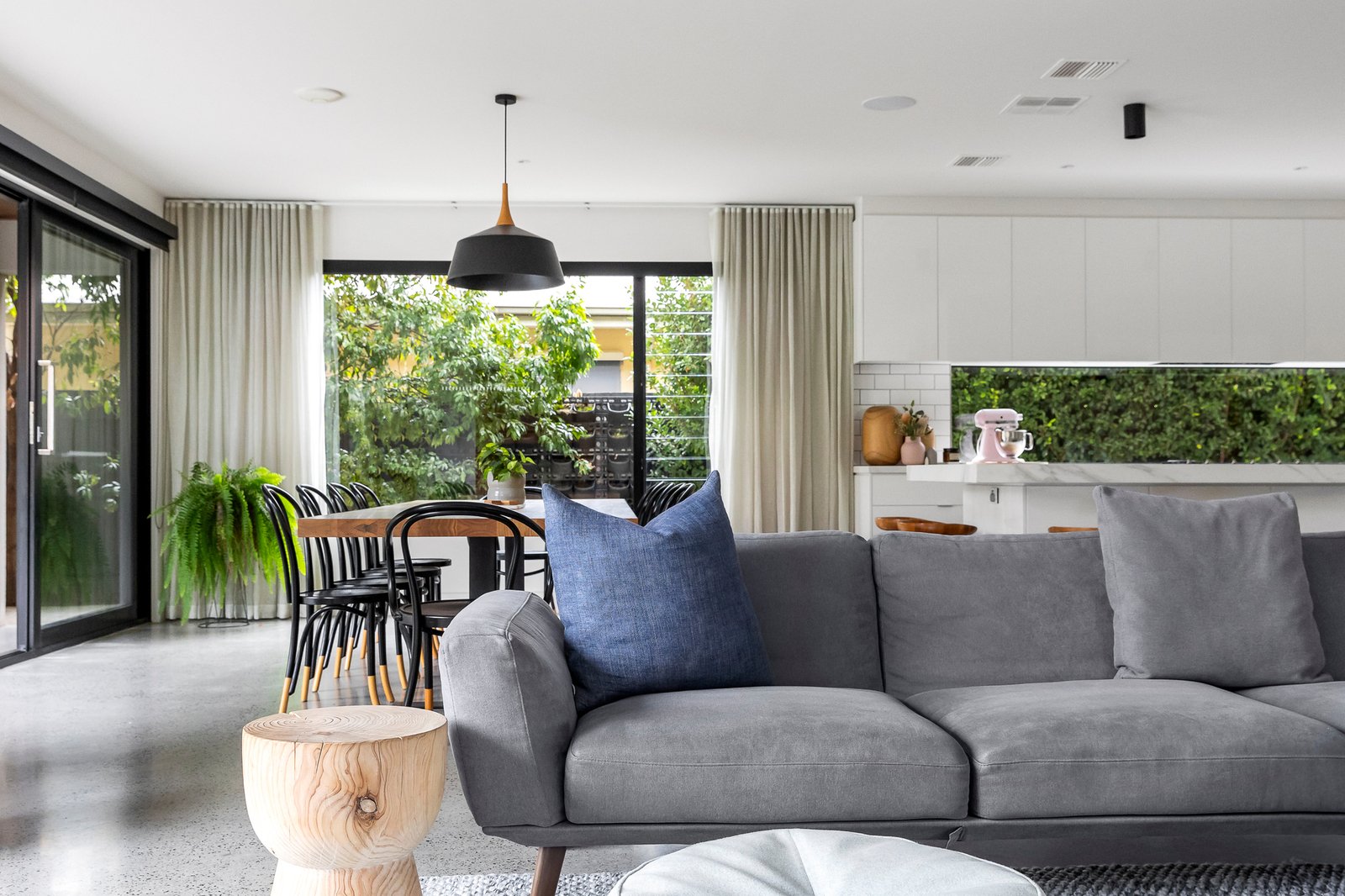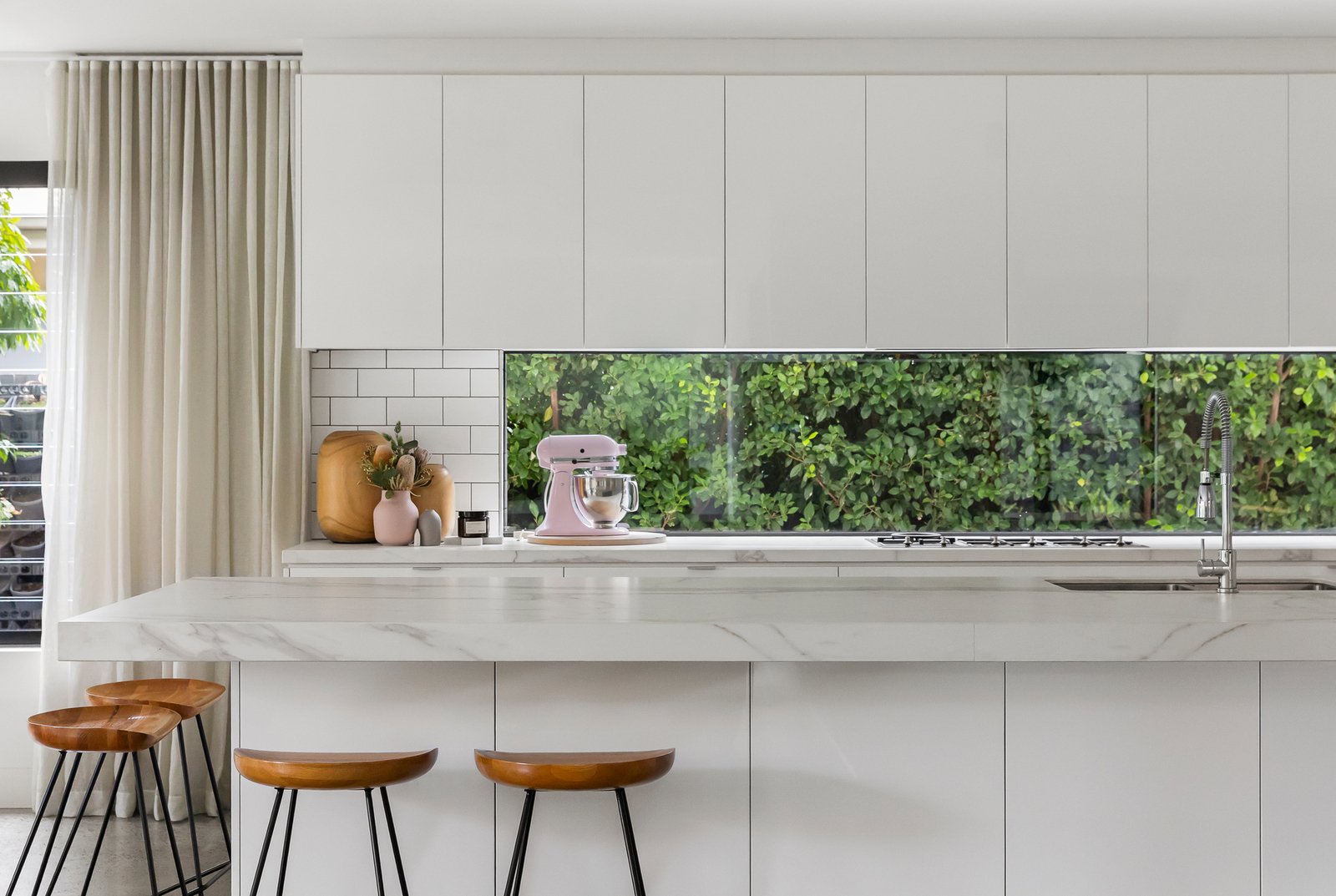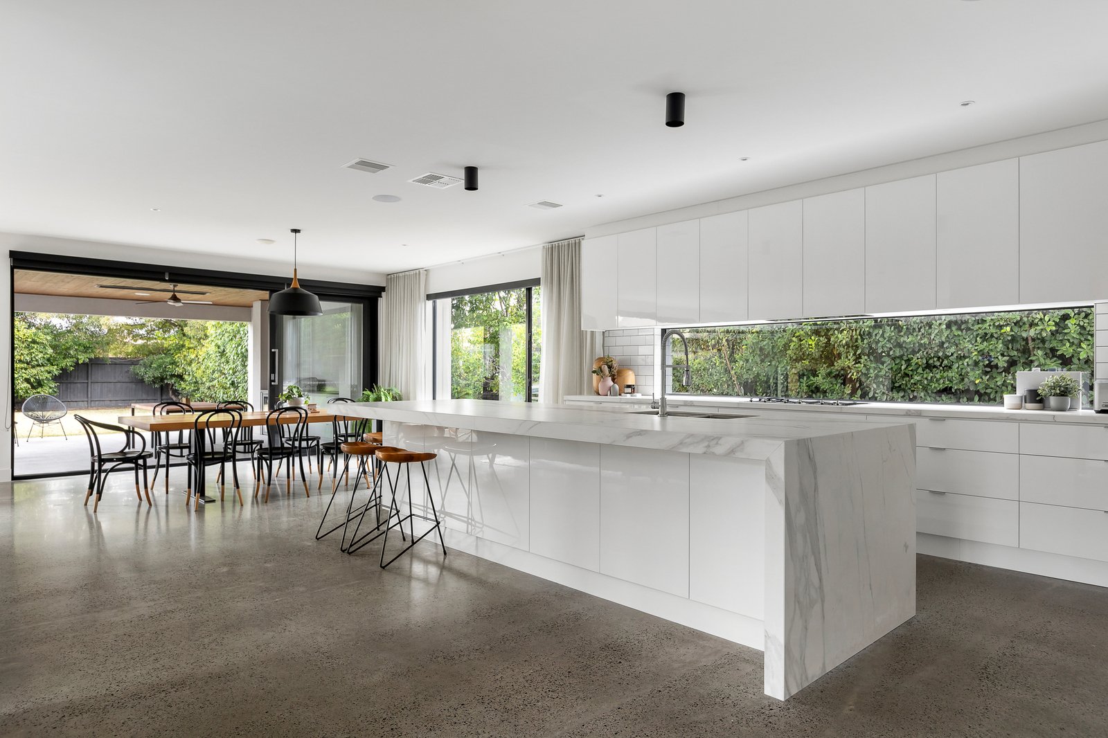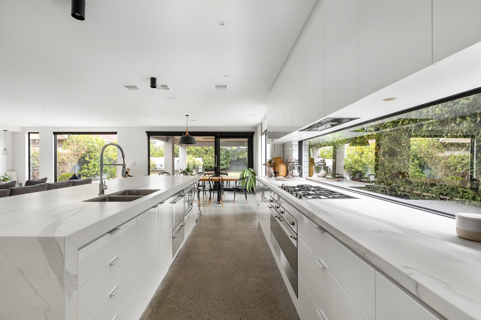 At the heart of the home, a gourmet kitchen balances contemporary design with family practicality. A striking Neolith porcelain island, lush garden-view splashback, premium Smeg appliances (including twin ovens) and twin dish-drawers are paired with a butler’s pantry and stone-topped laundry featuring subway tiling and extensive custom joinery.