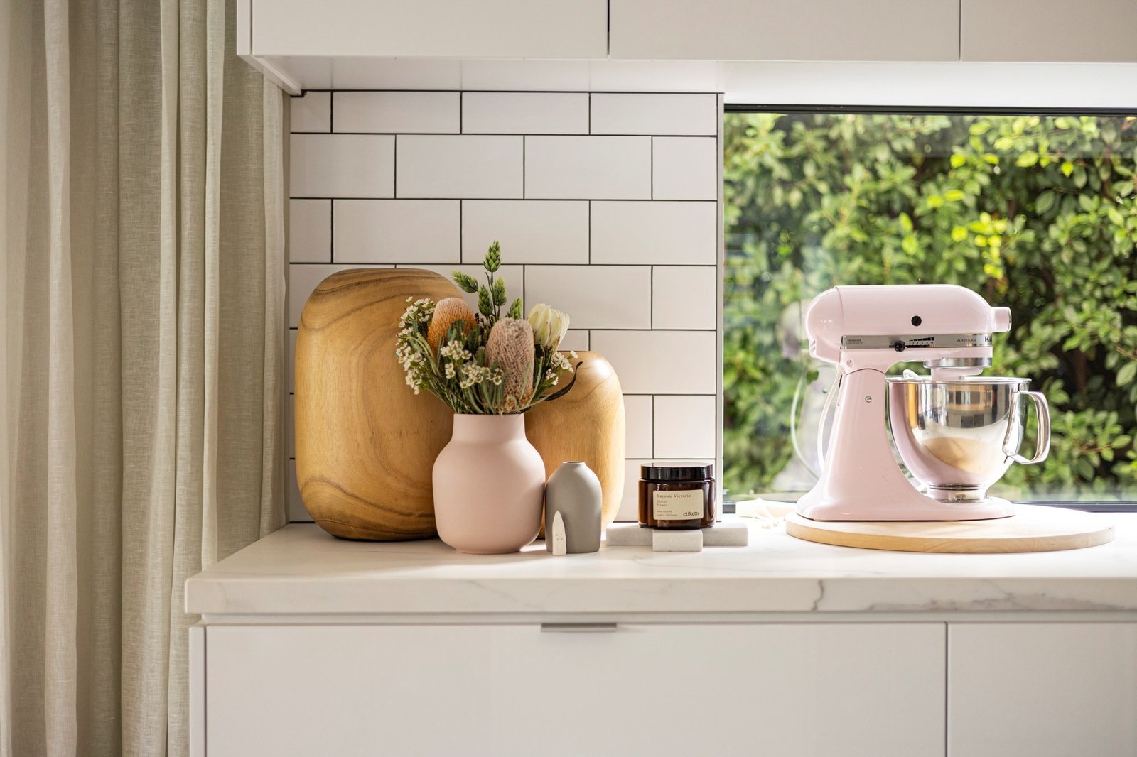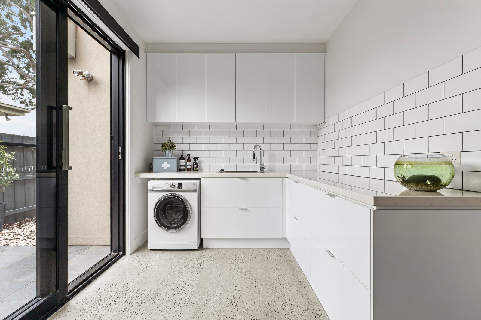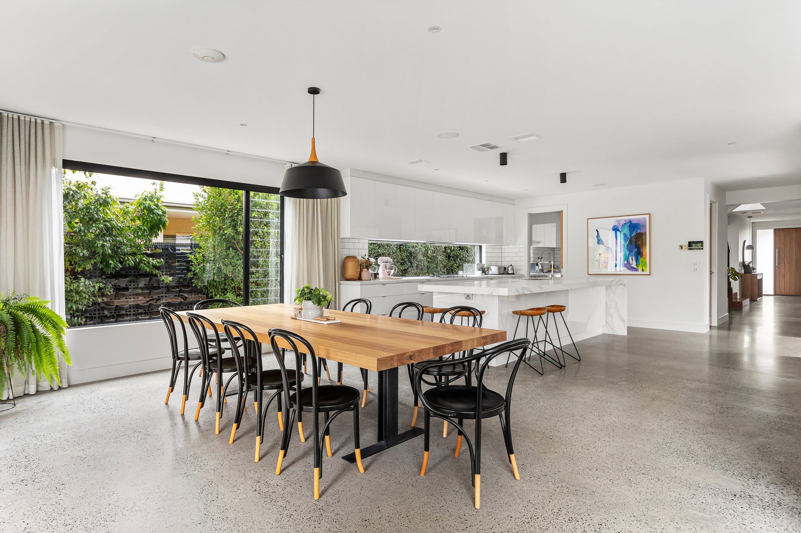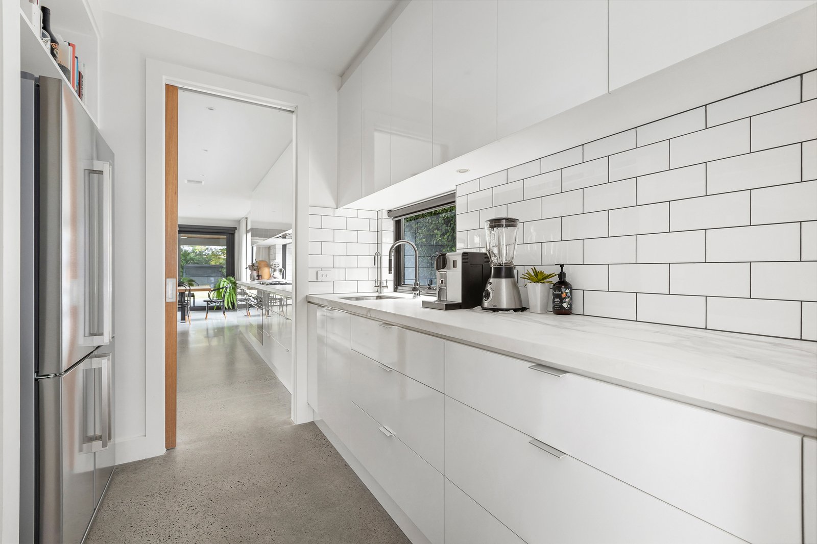 At the heart of the home, a gourmet kitchen balances contemporary design with family practicality. A striking Neolith porcelain island, lush garden-view splashback, premium Smeg appliances (including twin ovens) and twin dish-drawers are paired with a butler’s pantry and stone-topped laundry featuring subway tiling and extensive custom joinery.