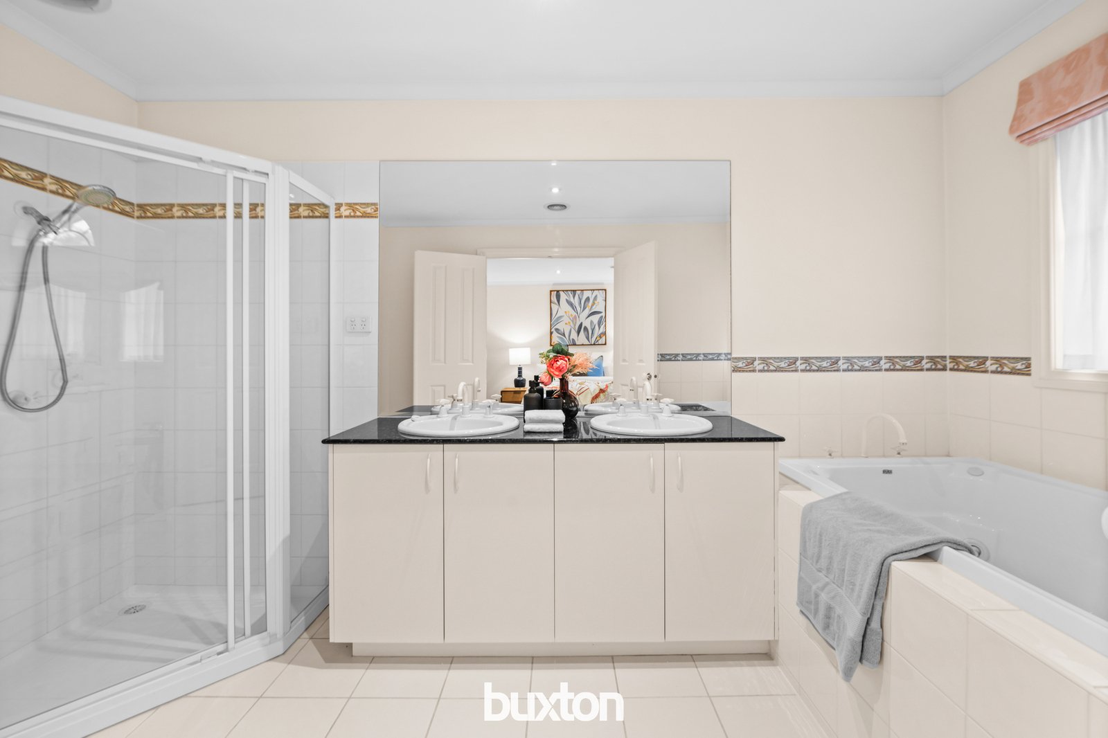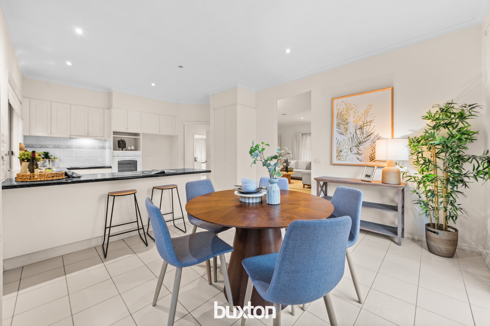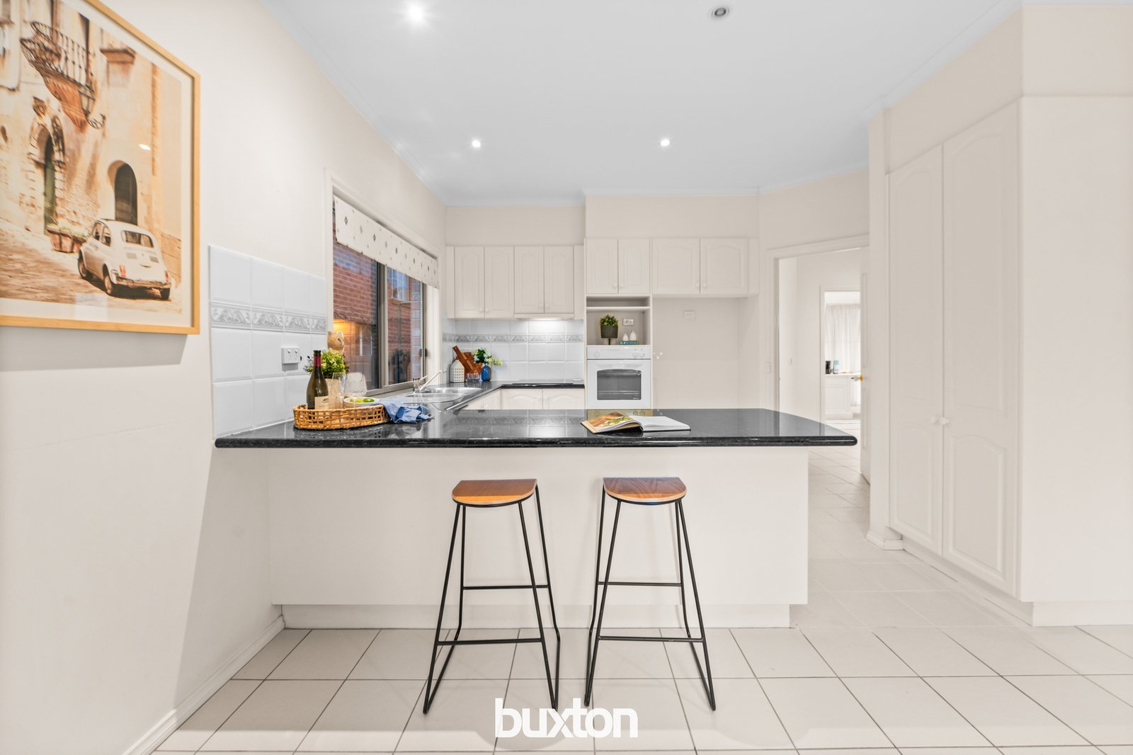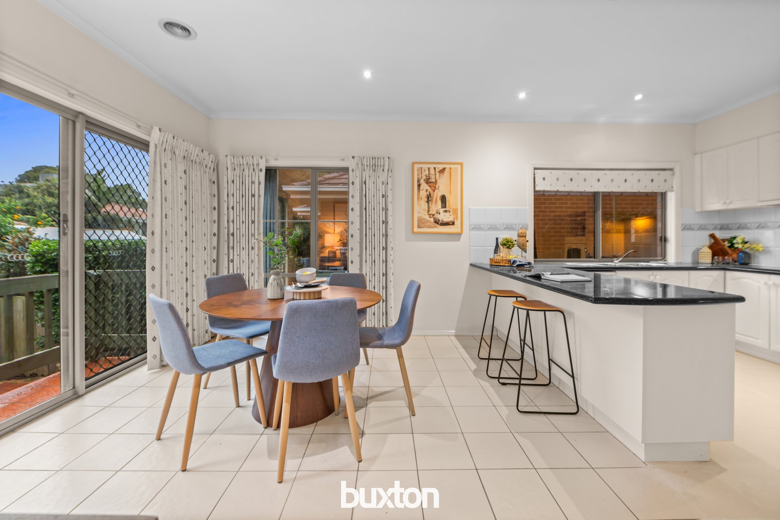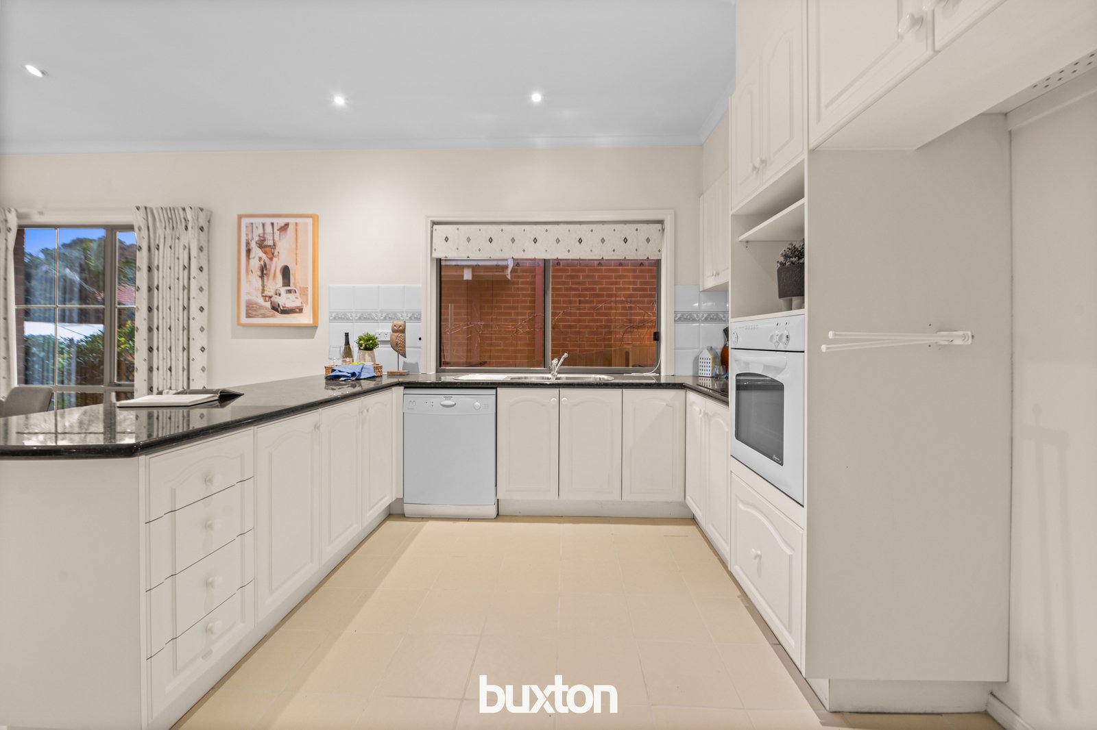 Right alongside you’ll connect with the tiled meals area suited to family meals, and a sunny north facing granite kitchen, enjoying natural flow across to the beautiful brick-paved garden.
