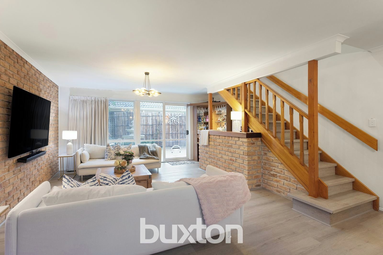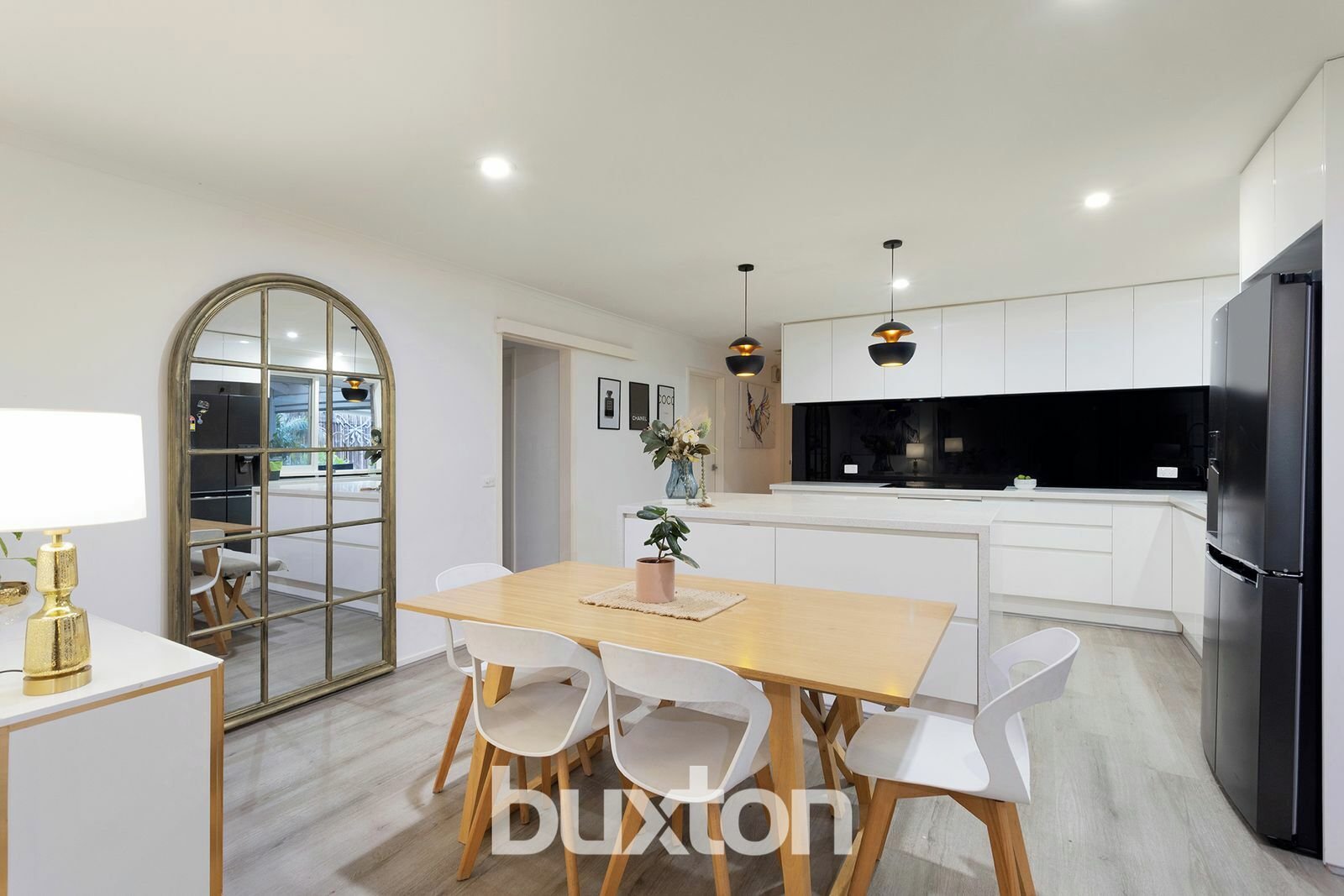 At the heart of the home lies a beautifully updated kitchen, distinguished by its striking pendant lighting, sleek black splashback, electric cooktop, and crisp white cabinetry. This stylish culinary space flows into an open-plan dining area that seamlessly transitions to the covered alfresco, complete with built-in BBQ and outdoor blinds — the perfect setting for refined outdoor dining and year-round entertaining.