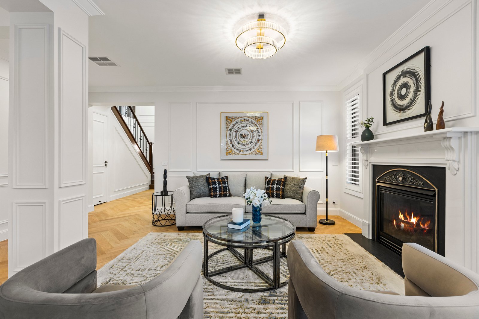 Venturing further into the home, an expansive open plan domain embraces an elegant formal lounge with plantation shutters and a gas log fire, accompanied by a spacious dining area and family room.
