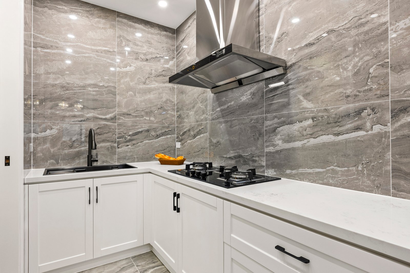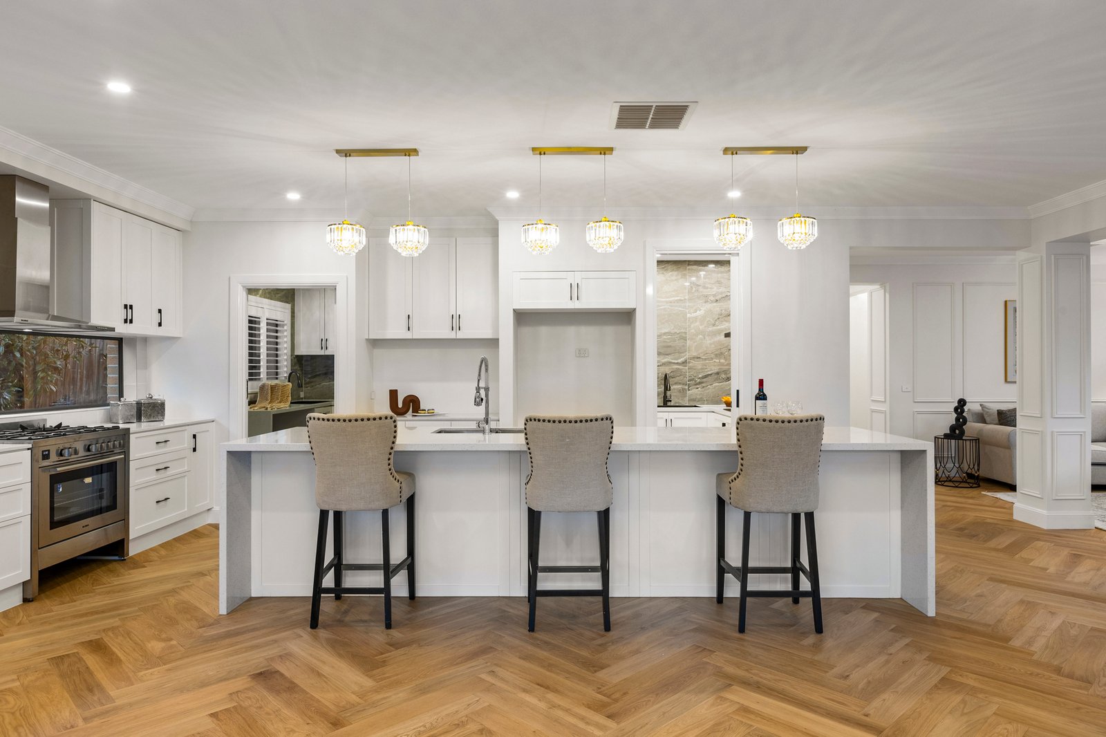 Overlooking this space, the indulgent kitchen showcases waterfall stone benches, an island breakfast bench, Blanco oven/gas stove, semi-integrated Blanco dishwasher plus a butler’s kitchen with walk-in pantry and Fotile gas stove.