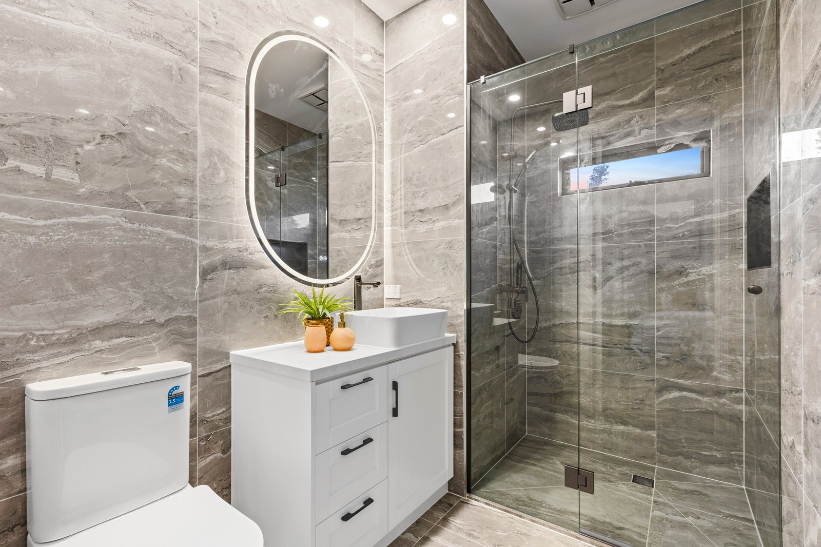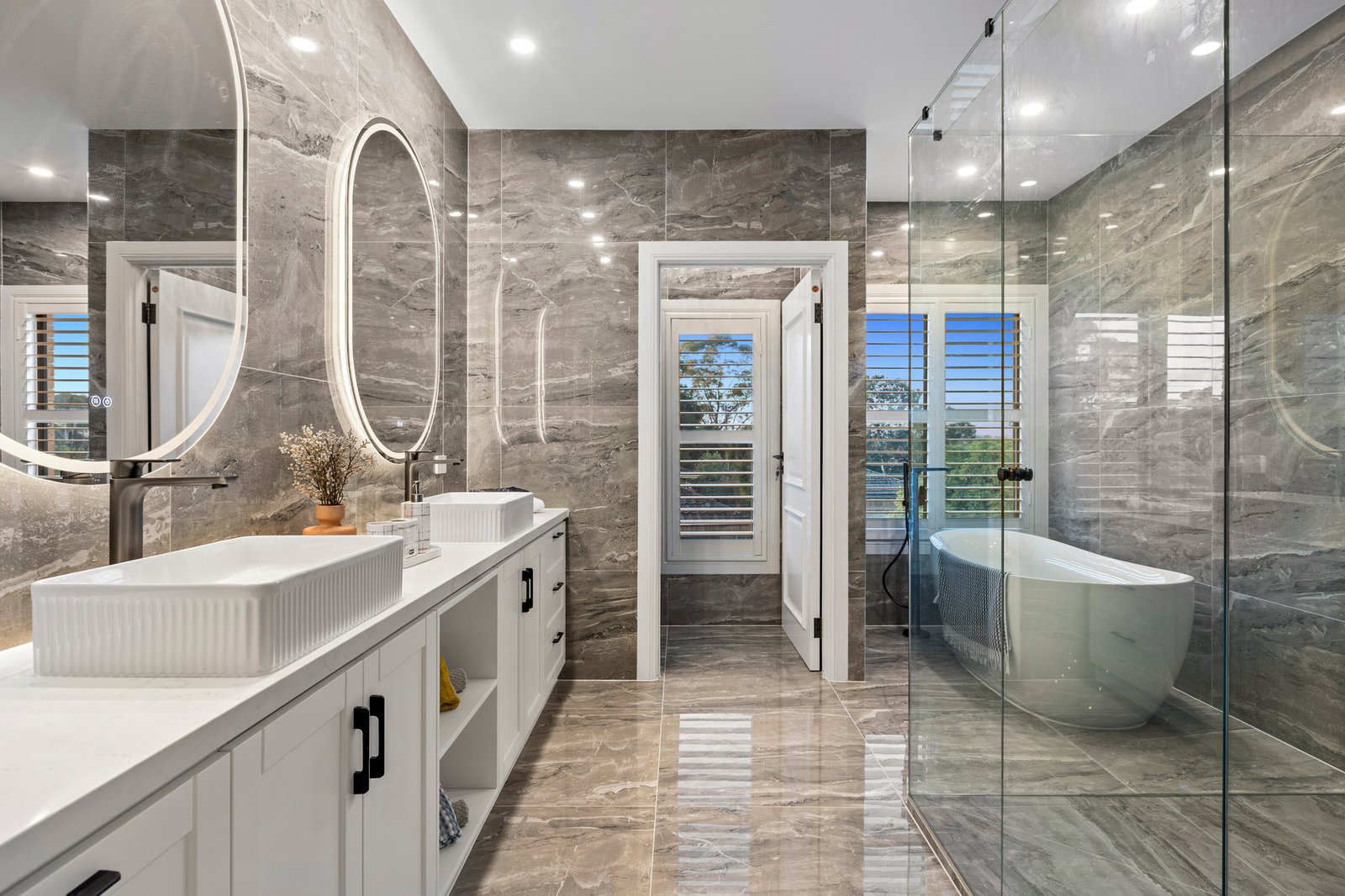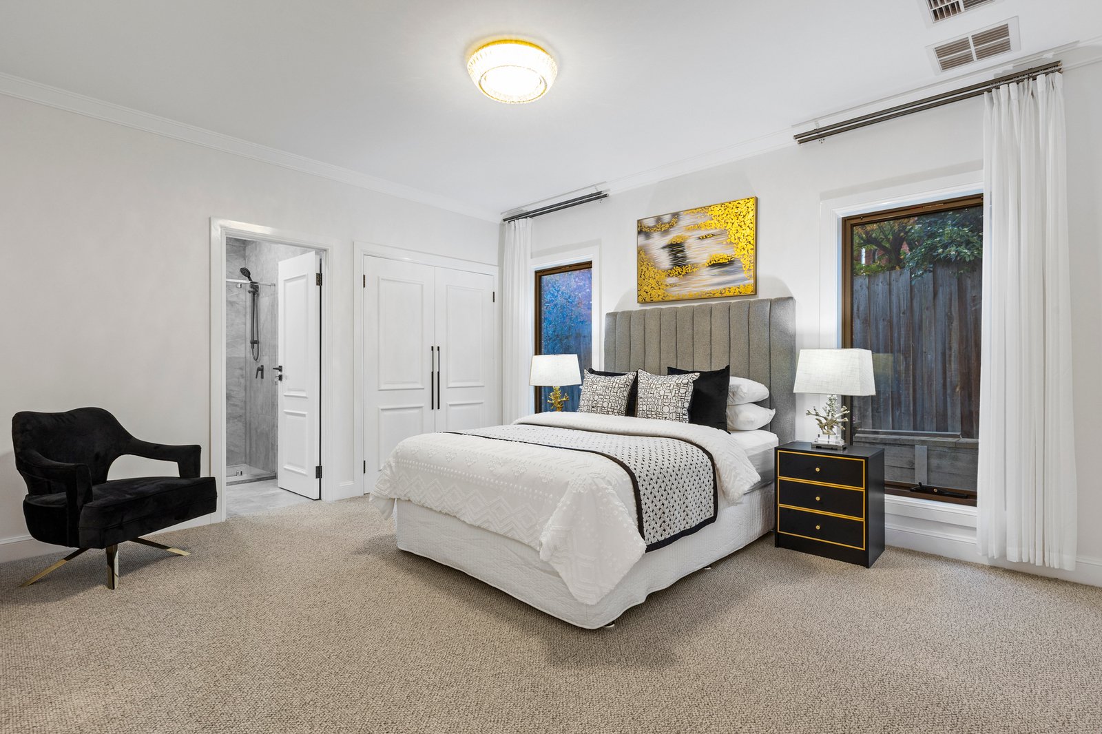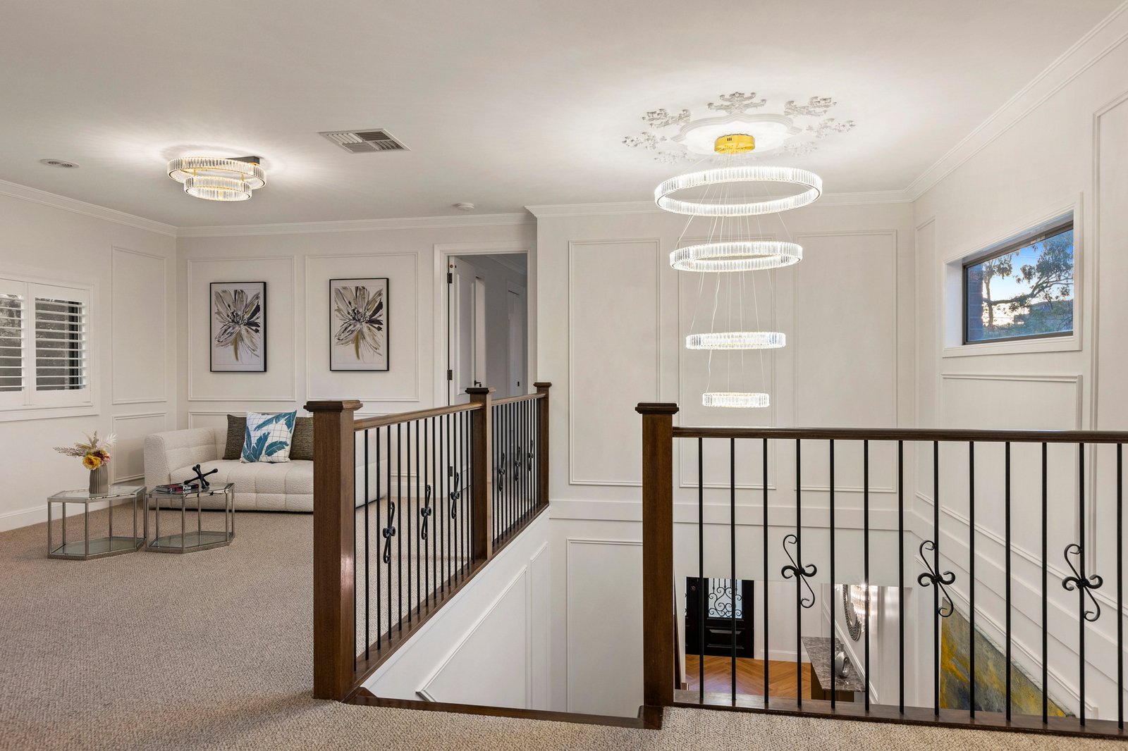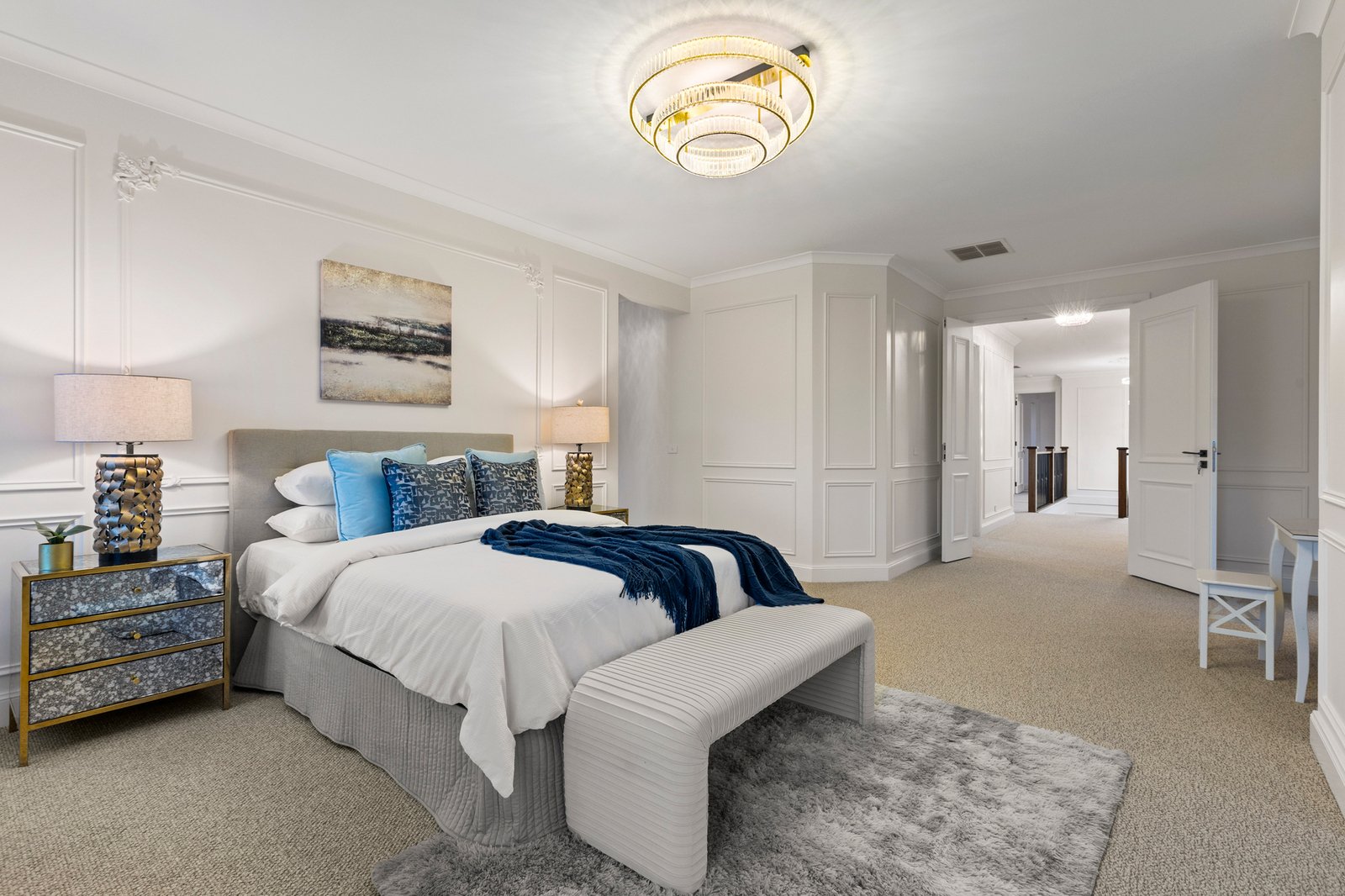 At the top of the staircase a carpeted retreat greets you and guides you through to the remaining four bedrooms, all with walk-in-robes and ensuites, including the master bedroom where you’ll find Dandenong Ranges views, a study/parents’ retreat plus an opulent ensuite with twin vanities, freestanding tub and shower.