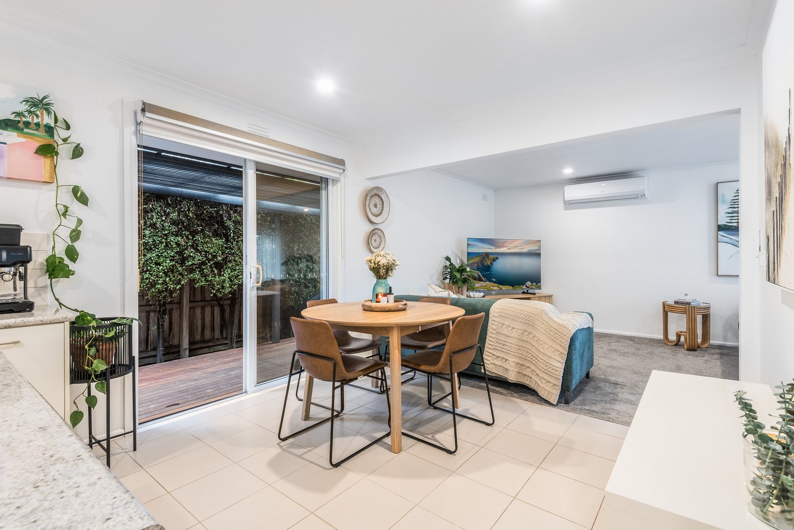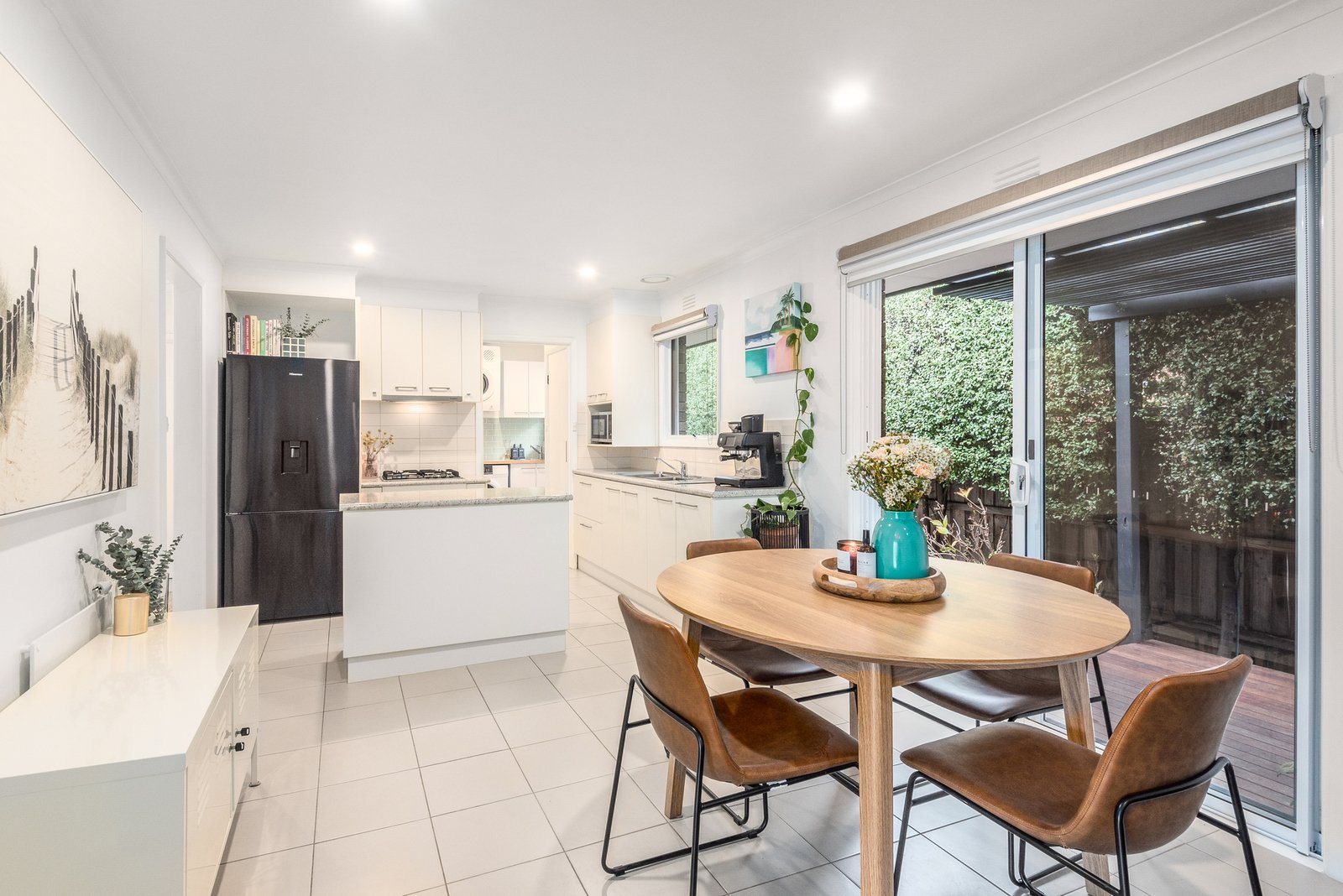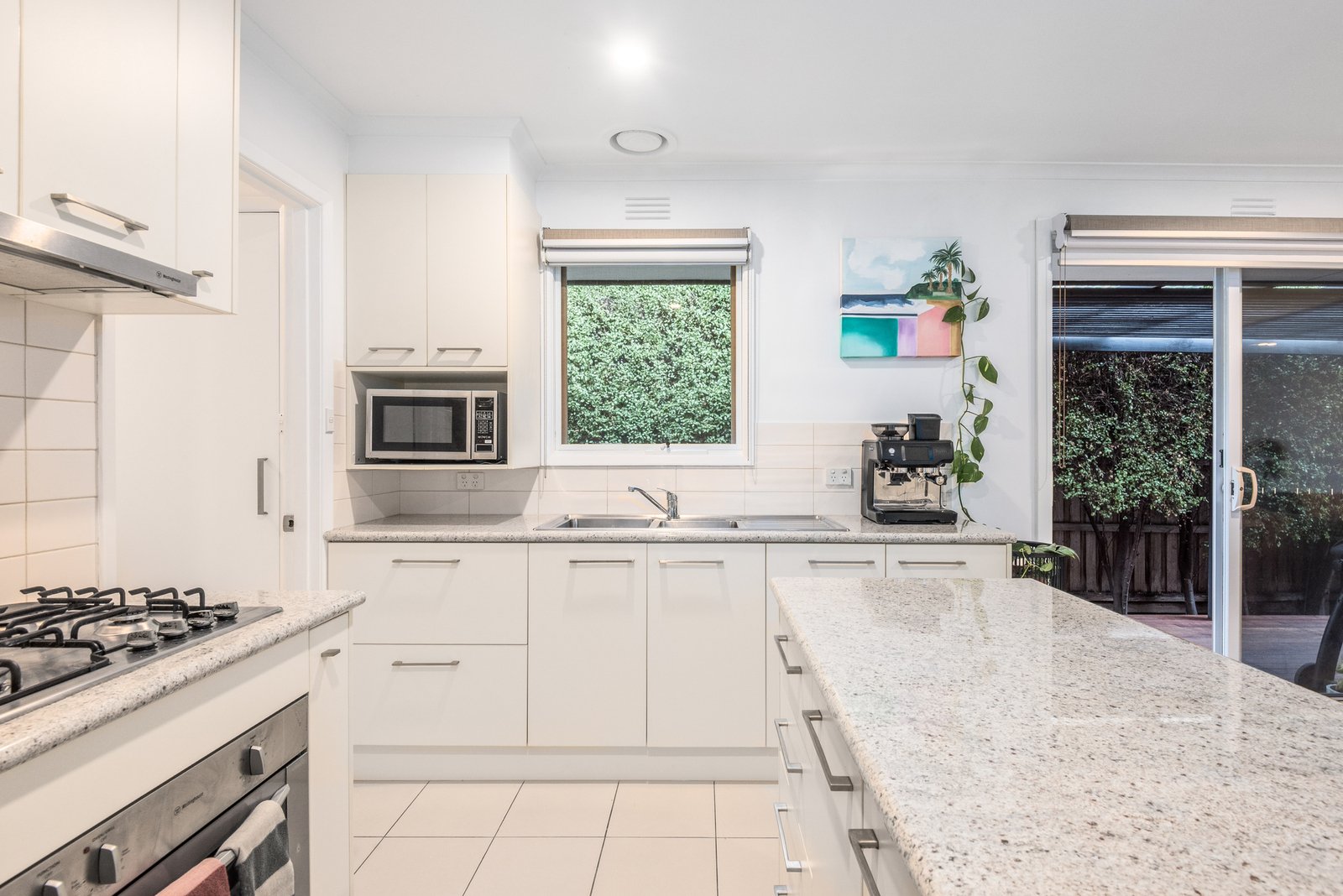 Set back from the road, the home enjoys a private and secluded setting. Entry into an inviting living area showcases light interiors and neutral accents, elegant sheer curtains and split system heating and cooling for year-round comfort. The open plan layout flows effortlessly through to the dining area and well-appointed kitchen, featuring quality Westinghouse appliances including 600mm oven, gas cooktop, and a central island for handy preparation space and casual entertaining.