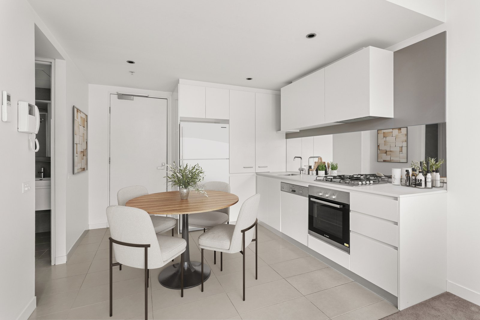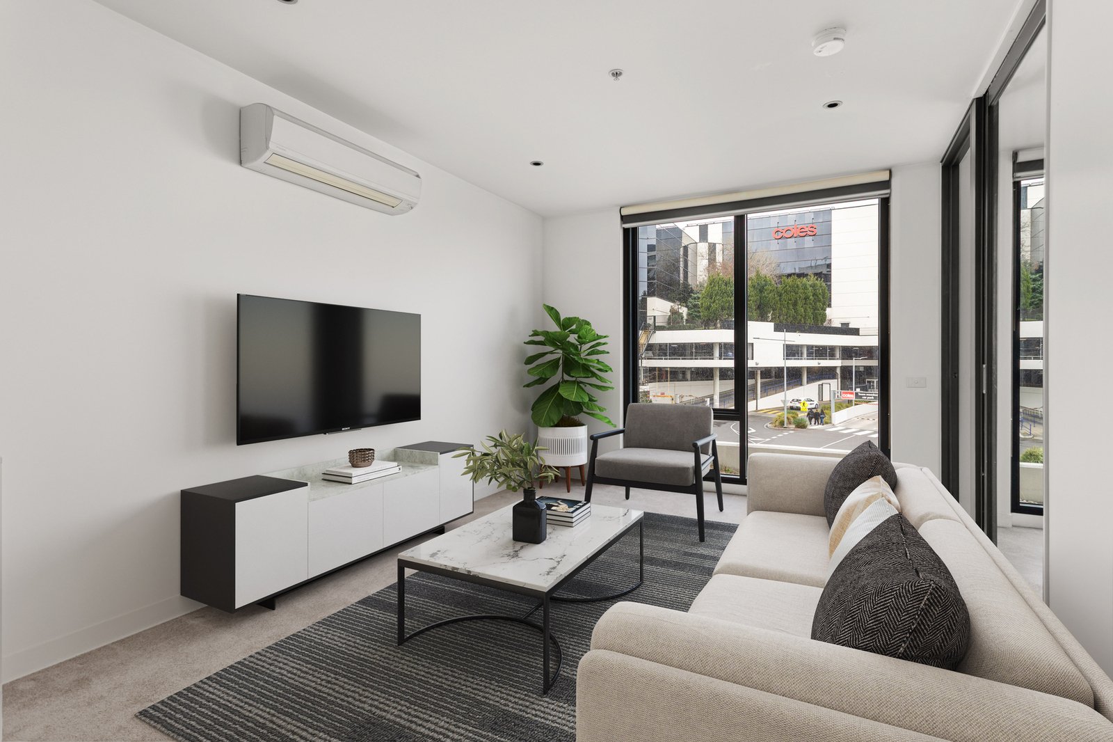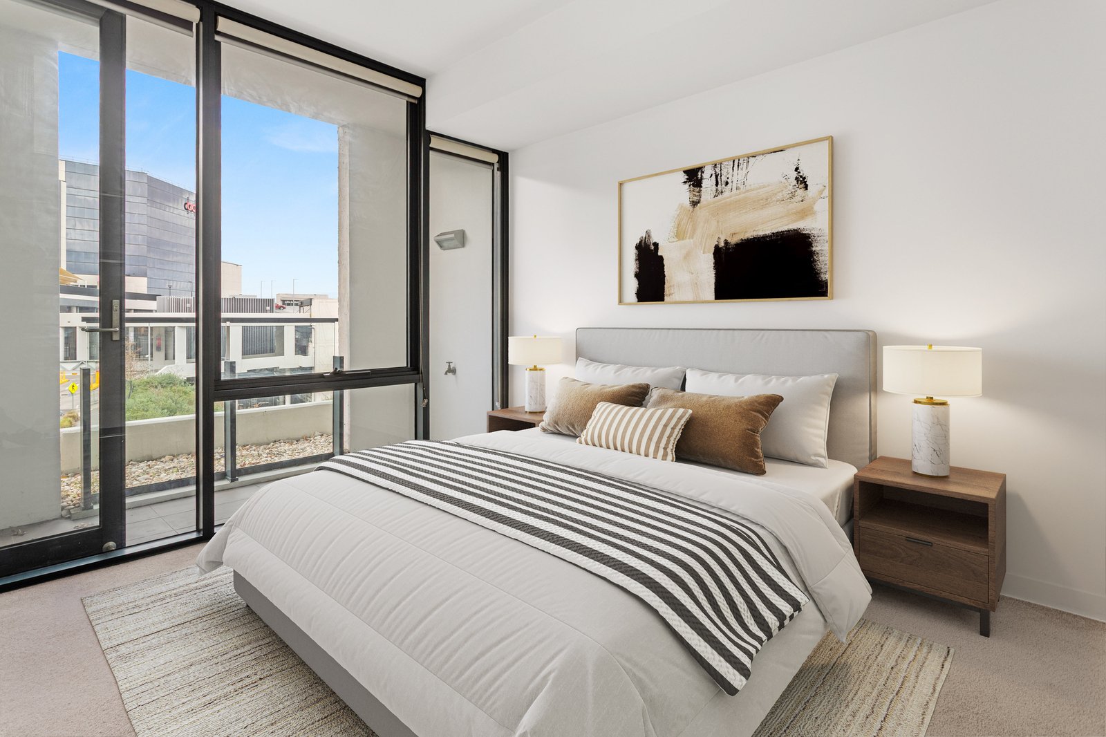 With a wide footprint that’s illuminated by huge windows that catch the morning light, this apartment features a crisp white kitchen with gas cooking, dishwasher and stone topped benches as well as a centrally located bathroom, balcony, RC/AC and video intercom entry.