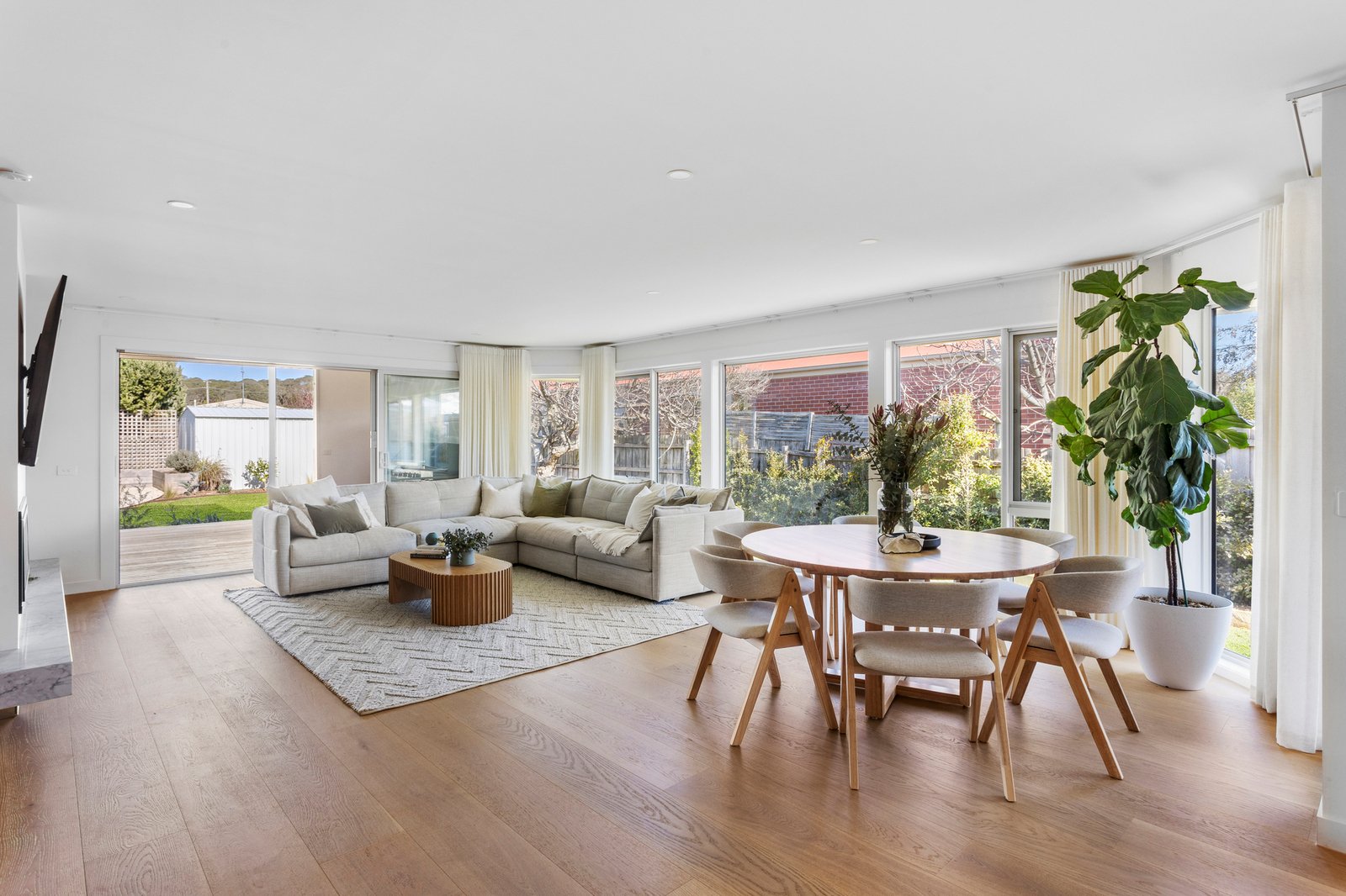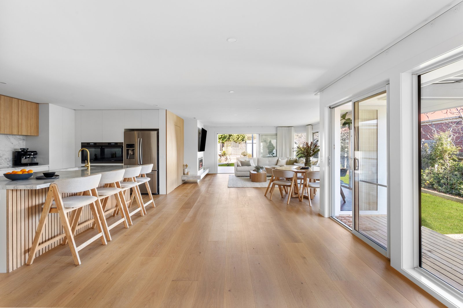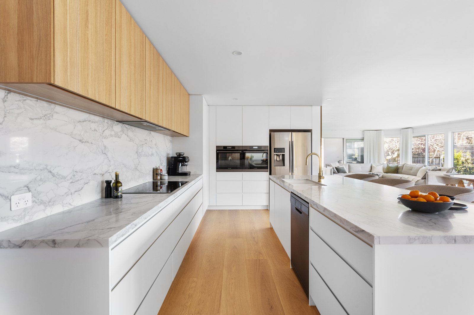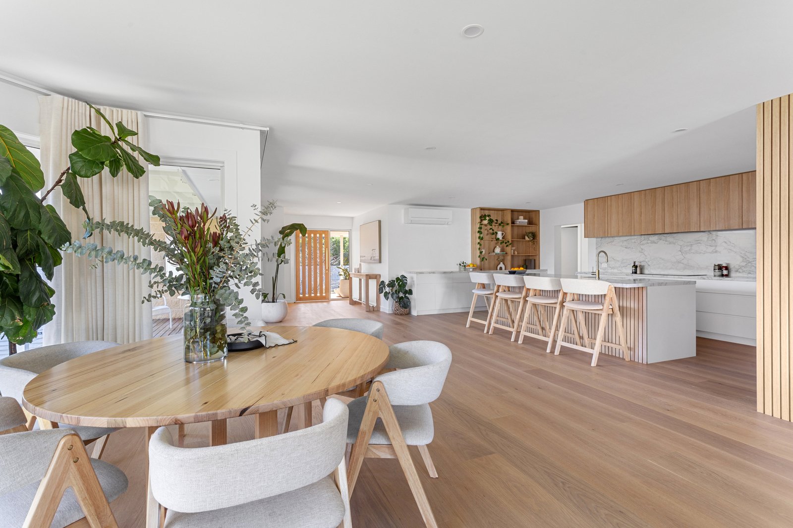 A lavish transformation places the sun front and centre, with open-plan living and dining areas accentuated by high ceilings, wide-board oak floors and softly textured finishes. A gas fire is an ideal focal point in winter, while the sliding glass doors connect to the enormous outdoor entertainment zone, extending the interior to the fire pit, where low-maintenance native landscaping frames relaxed evenings with family and friends. Complementing the entertaining appeal, the stone-finished kitchen delivers on both style and size, fitted with twin Westinghouse ovens, induction cooking, dishwasher and brushed brass fixtures that add subtle polish to a crisp white, coastal aesthetic.