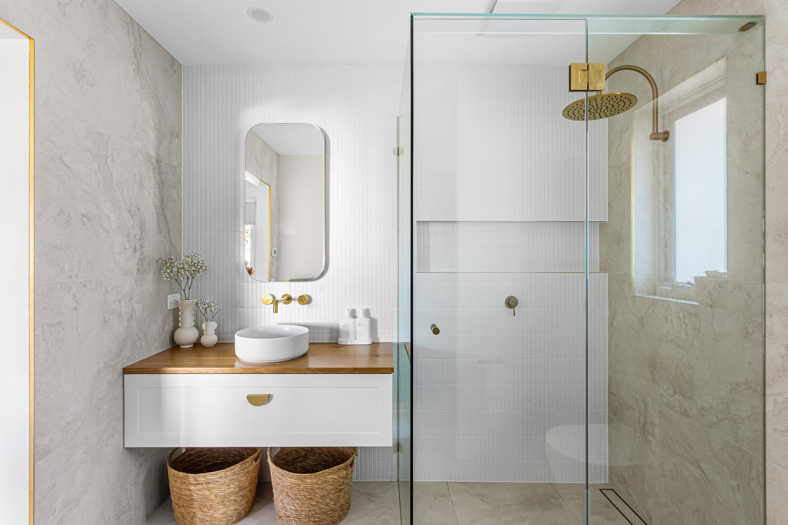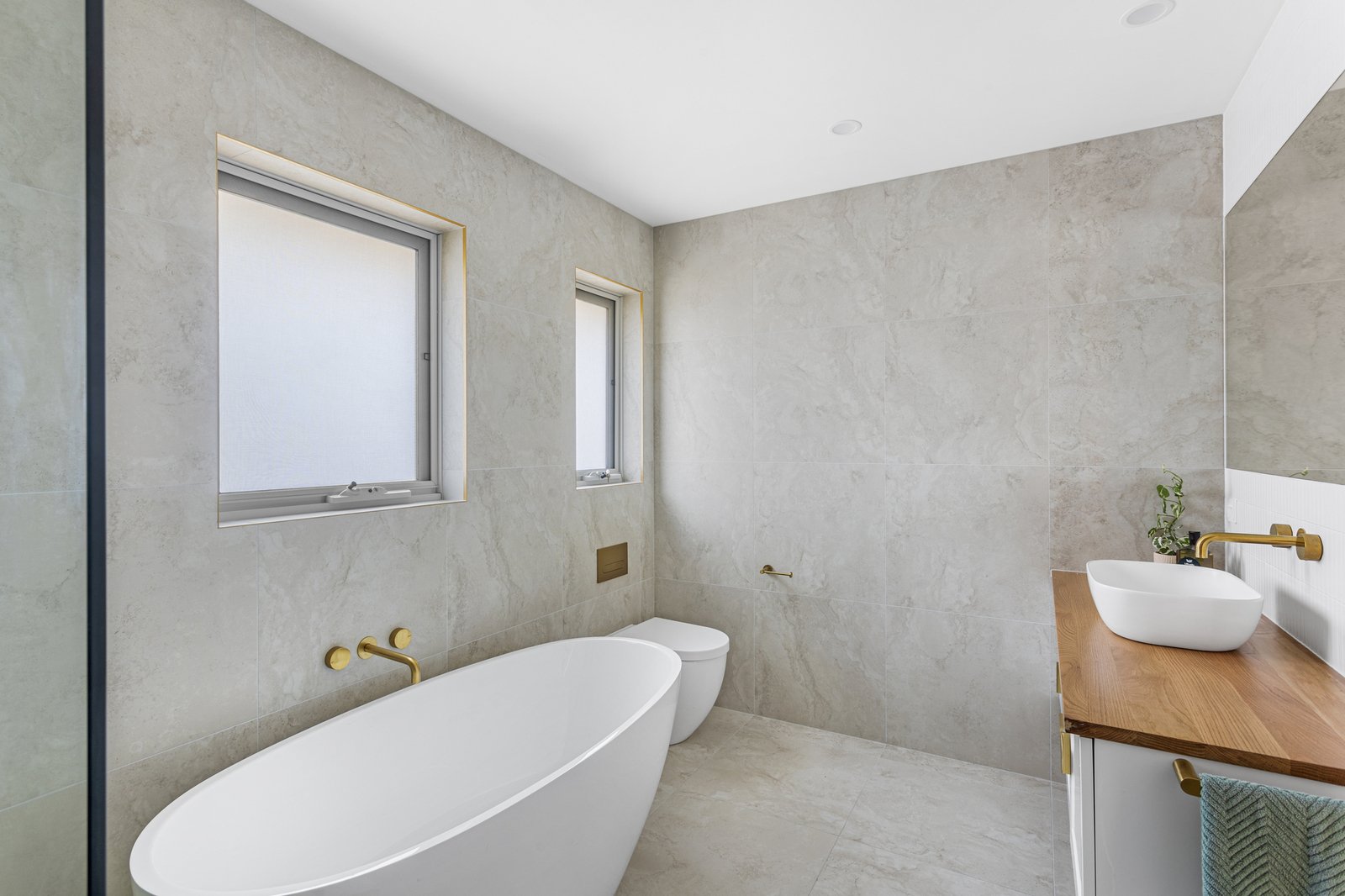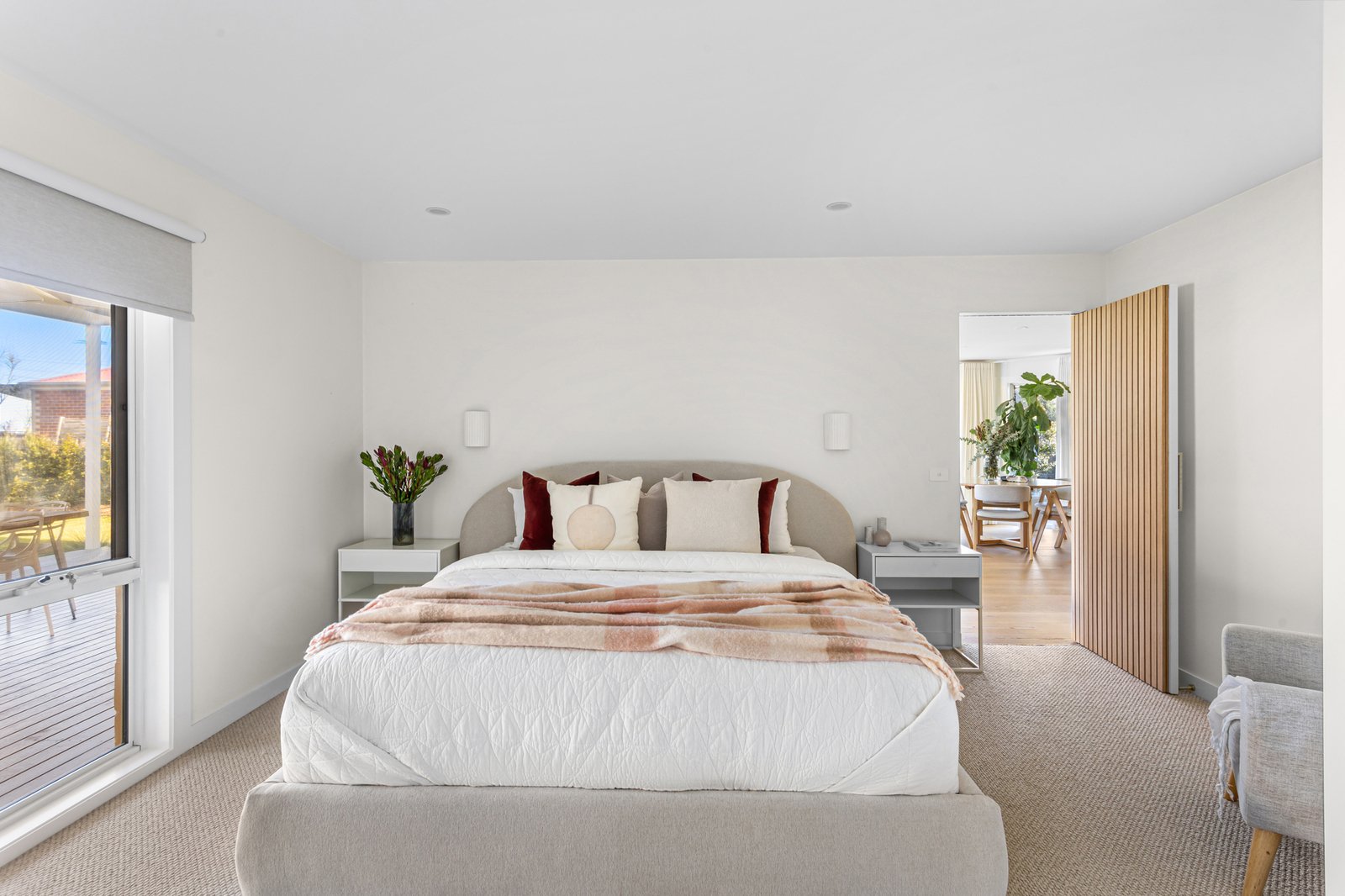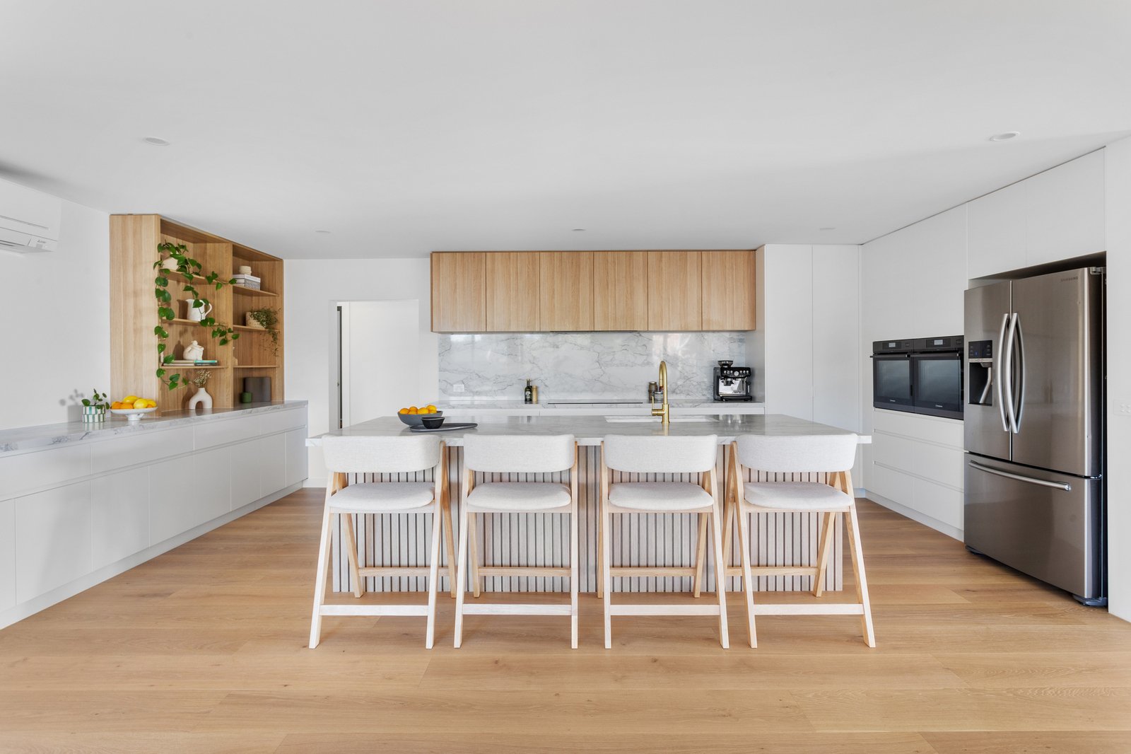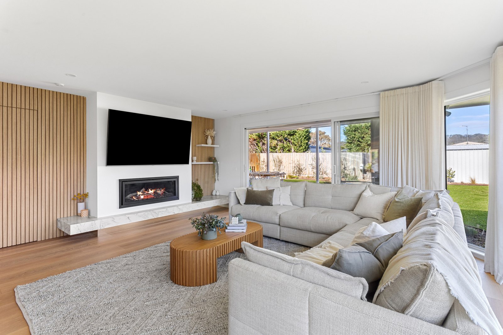 A lavish transformation places the sun front and centre, with open-plan living and dining areas accentuated by high ceilings, wide-board oak floors and softly textured finishes. A gas fire is an ideal focal point in winter, while the sliding glass doors connect to the enormous outdoor entertainment zone, extending the interior to the fire pit, where low-maintenance native landscaping frames relaxed evenings with family and friends. Complementing the entertaining appeal, the stone-finished kitchen delivers on both style and size, fitted with twin Westinghouse ovens, induction cooking, dishwasher and brushed brass fixtures that add subtle polish to a crisp white, coastal aesthetic.