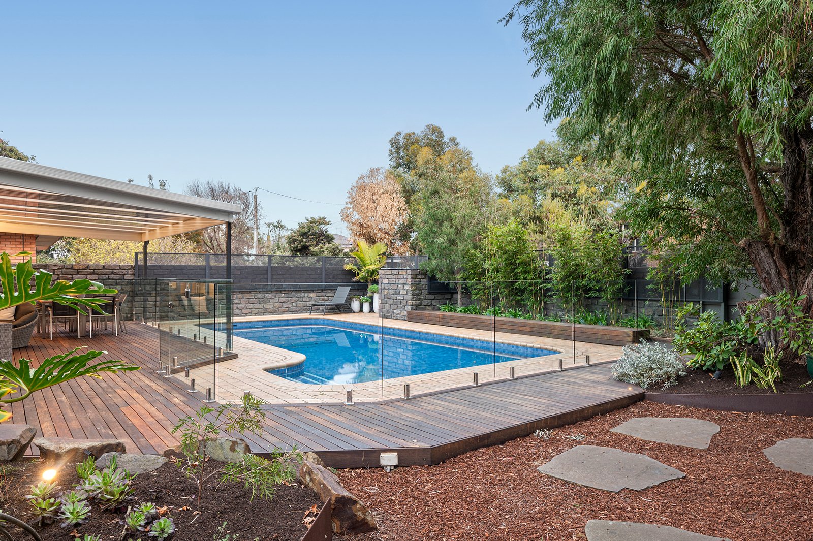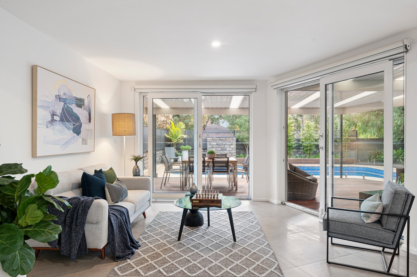 The adjacent sitting room opens to a spectacular wraparound deck via twin sets of glass sliding doors. Here, al fresco living is redefined. Sheltered, serene and substantial, this outdoor haven is ideal for year-round dining and unwinding, with views across the glistening solar-heated pool, while a second deck beneath the canopy of majestic mature trees offers a tranquil spot to start the day or soak in the afternoon sun.