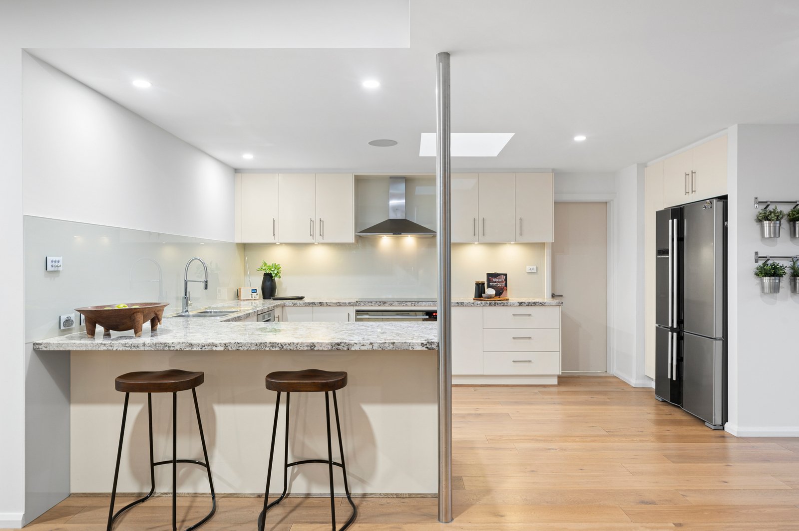 Multiple light-filled living zones create a fluid sense of connection, anchored by a fireside living room where expansive glazing draws in northern light and garden views. The dining area is ideally positioned beside a striking granite-topped kitchen appointed with premium Fisher & Paykel appliances, a Bosch dishwasher, generous storage and a large walk-in pantry - designed for effortless entertaining and daily ease.
