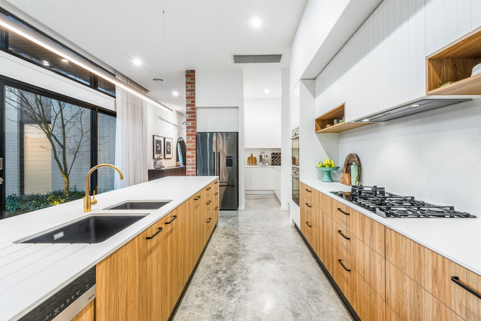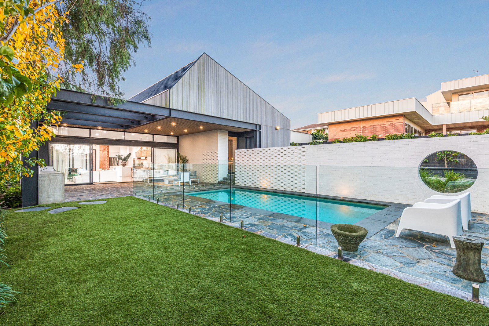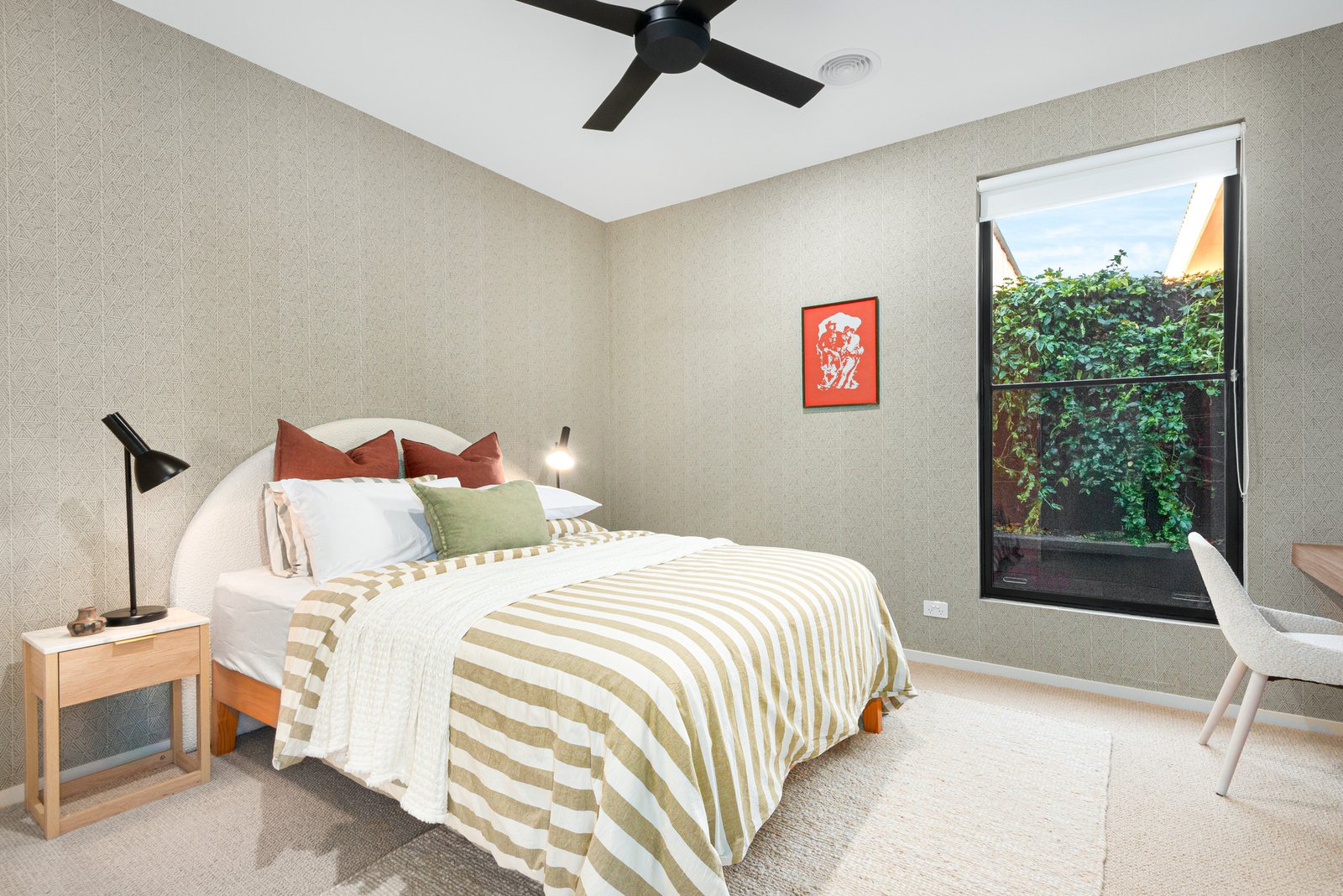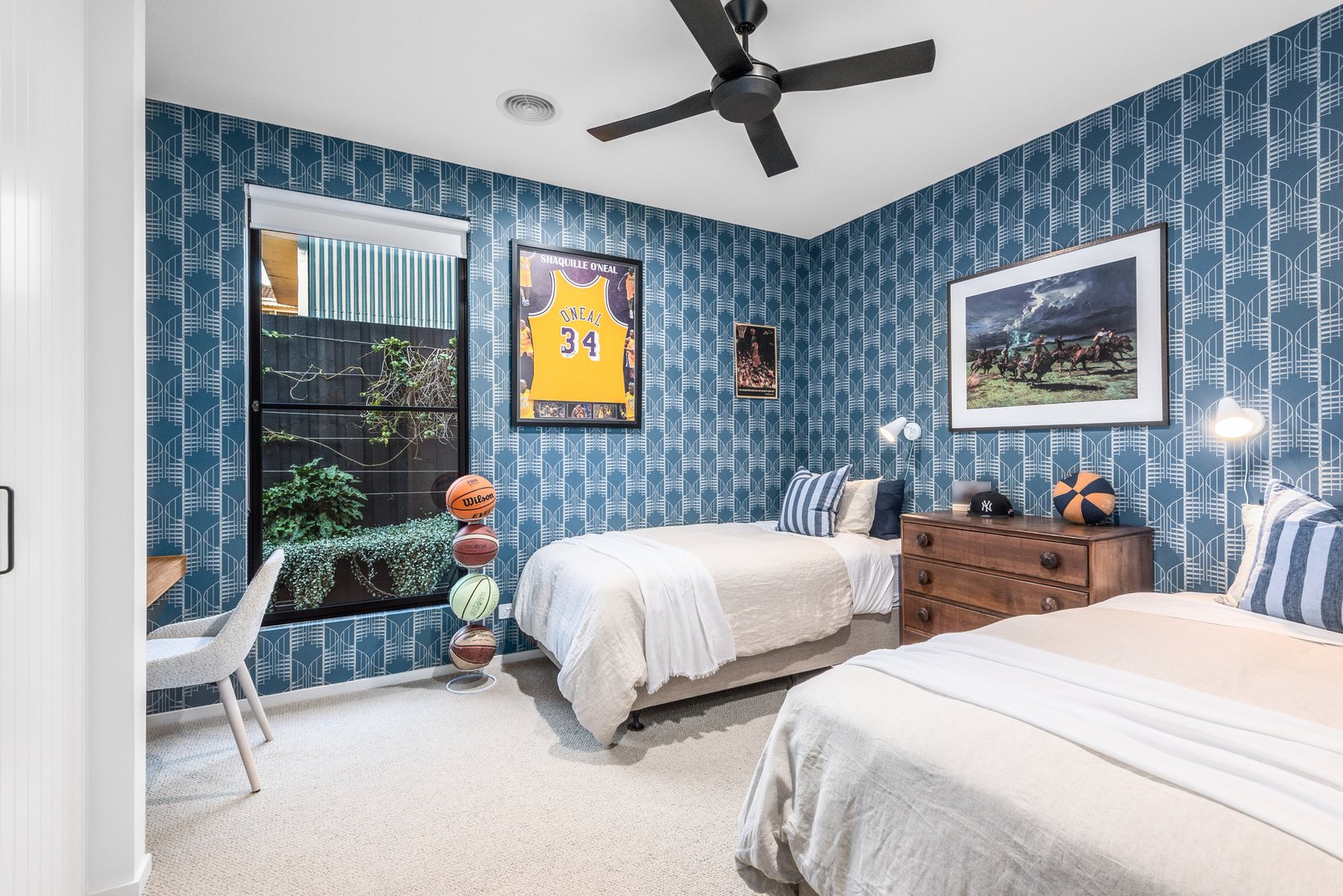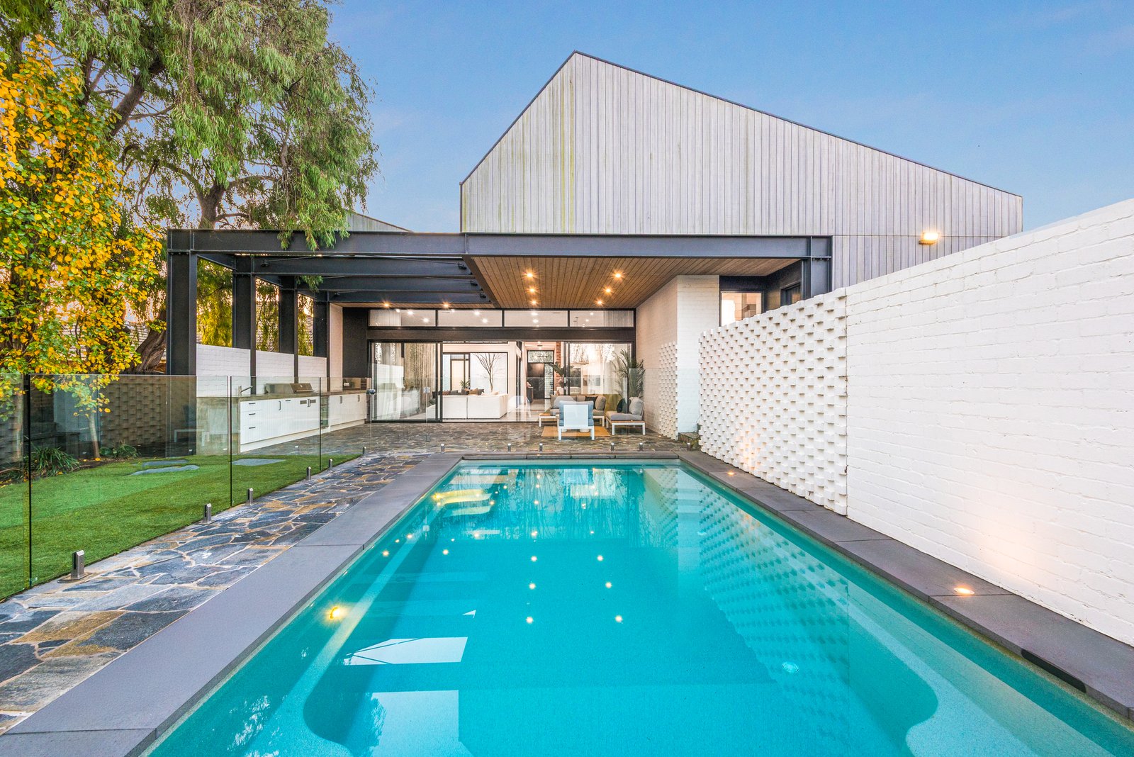The striking contemporary façade features an alluring blend of reclaimed brick and timber finishes, complemented by lush landscaped gardens. On entry, a central hallway takes your eye through the length of the home showcasing 3.4m ceilings, polished concrete floors, an internal brick feature wall, and ambient lighting, creating an impressive introduction to the home. Off the entry, the main bedroom is a luxurious retreat with floor to ceiling sheers, wool carpet, custom bookshelves, direct access to a private courtyard, fully fitted walk-in robes with dresser, and an elegant ensuite with heated floors, walk-in frameless shower, vanity with stone benchtop, and beautiful organic brushed brass tapware. Three additional bedrooms are zoned in a separate wing, all feature built-in robes and desks, serviced by a stylish main bathroom with freestanding bath, heated floors, and a separate powder room.