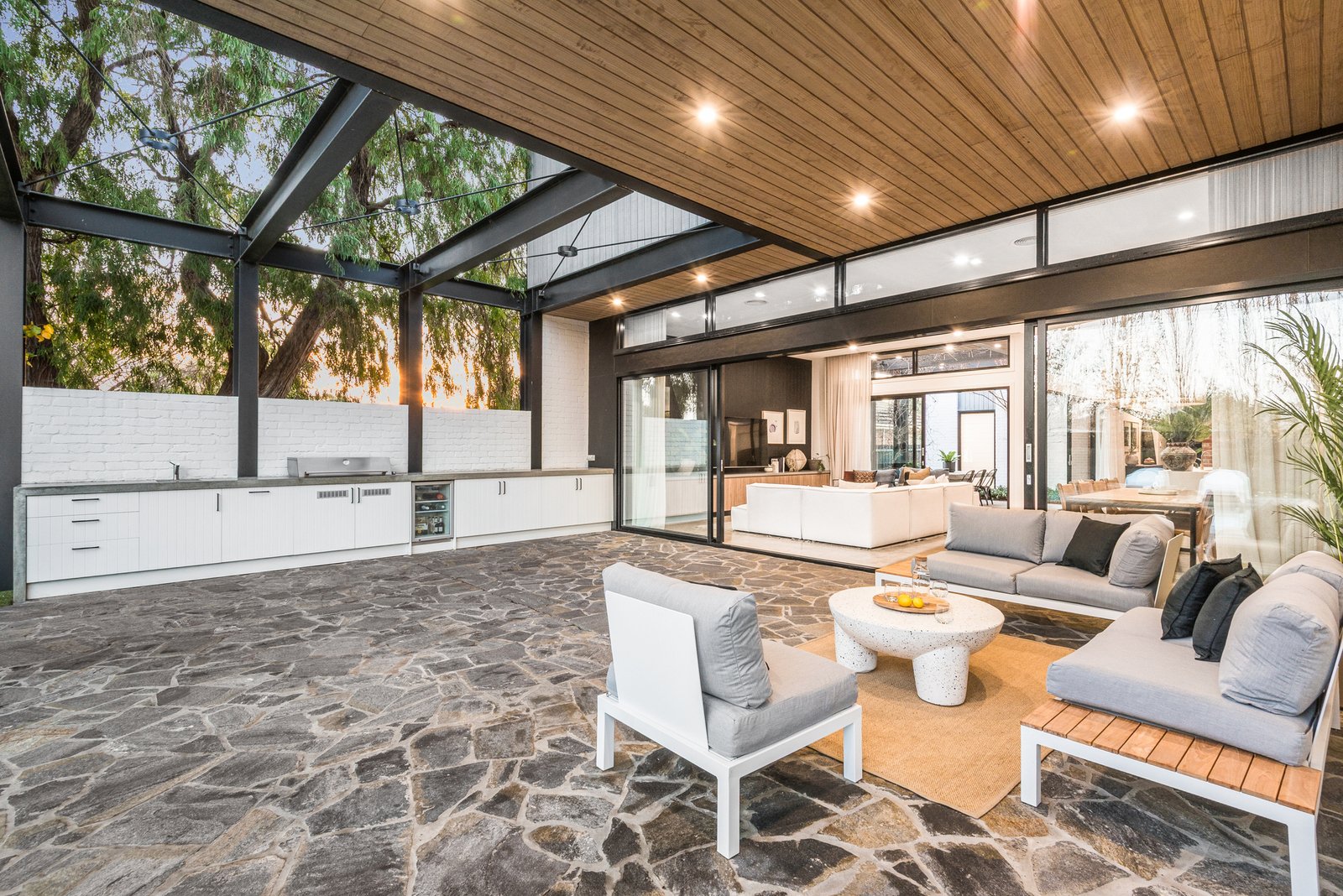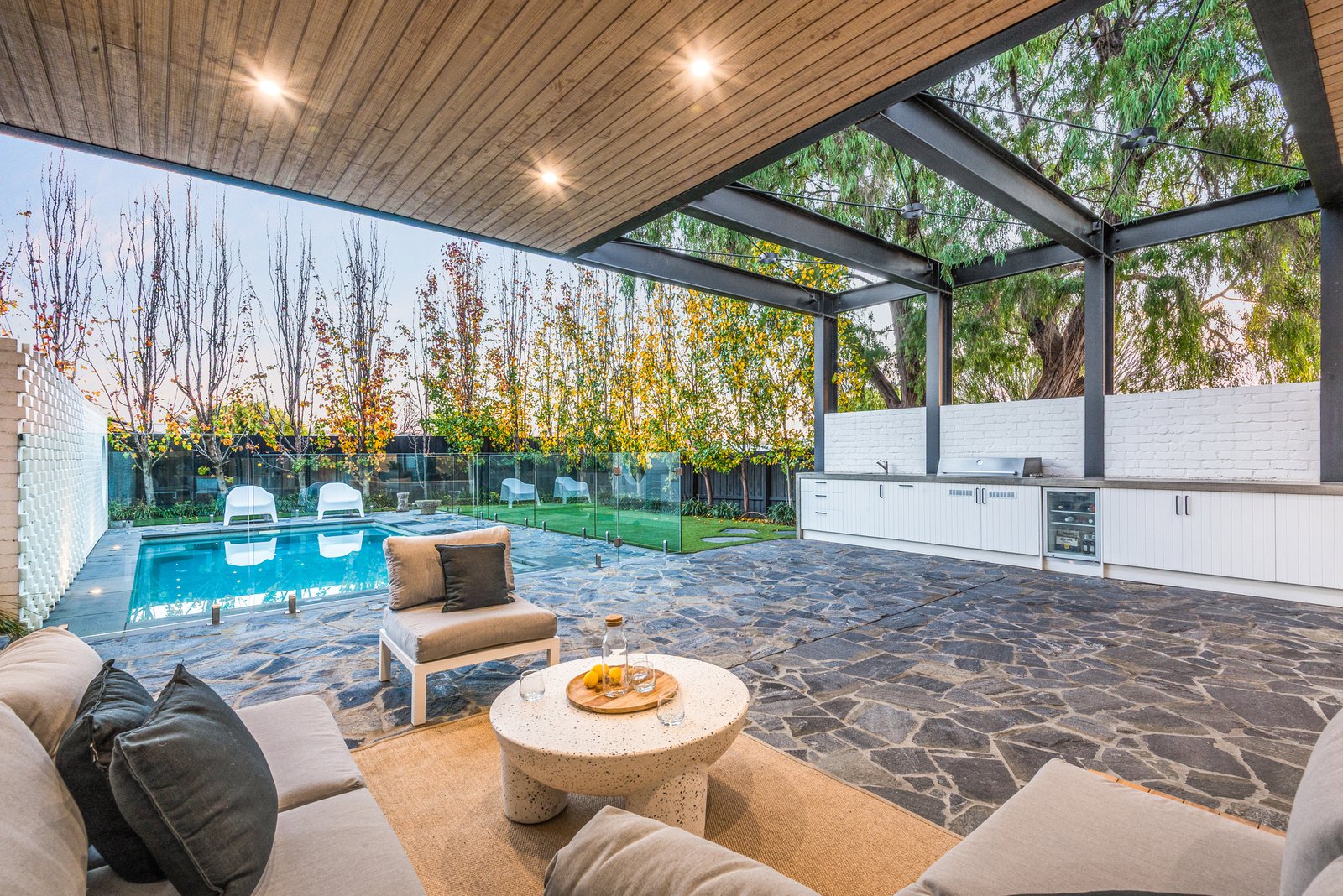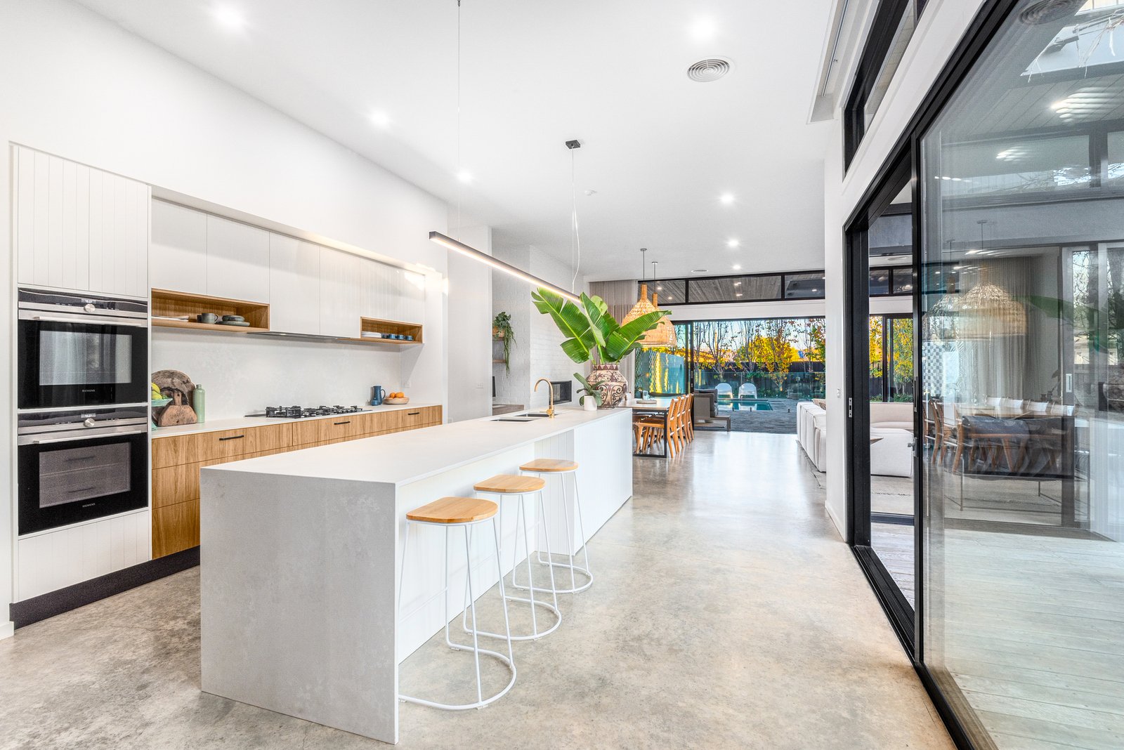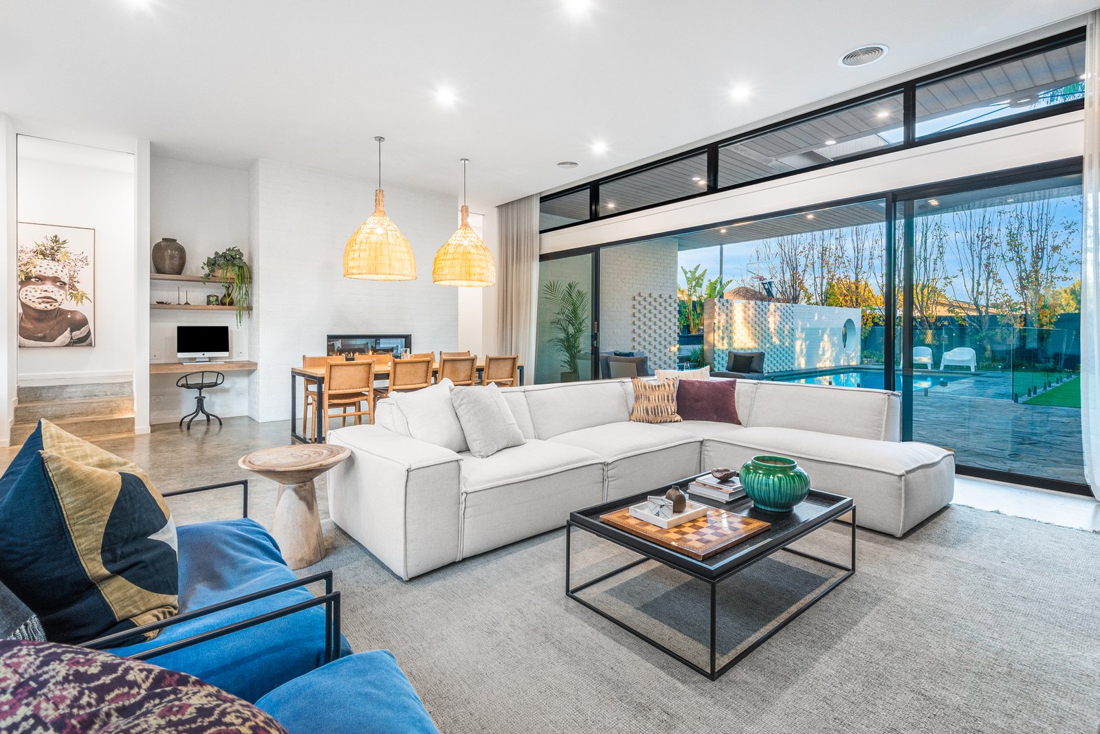 At the heart of the home, the open plan living zone in bathed in natural light, connecting with a north facing entertaining deck, and poolside outdoor living space, with glass stacker doors creating an effortless indoor-outdoor connection. The high-end kitchen features stone benchtops, sleek contemporary cabinetry with soft close drawers, quality Siemens appliances including dual 600mm pyrolytic self-cleaning ovens, 900mm gas cooktop, semi-integrated dishwasher, and large walk-in pantry. Centrally positioned to access the dining area and both outdoor entertaining spaces, entertainers will love the layout of this space. The living area features custom joinery offering both style and function, and a gas log fire creates a cosy atmosphere throughout.