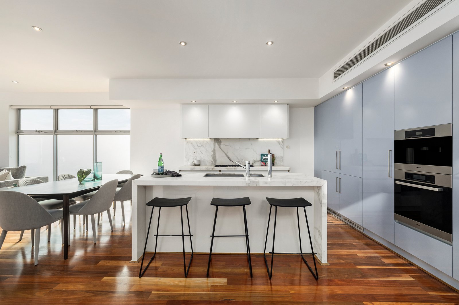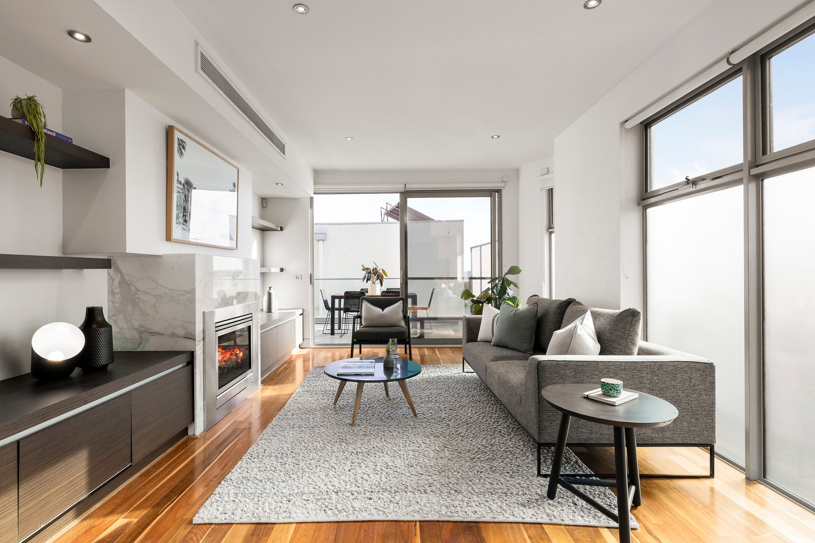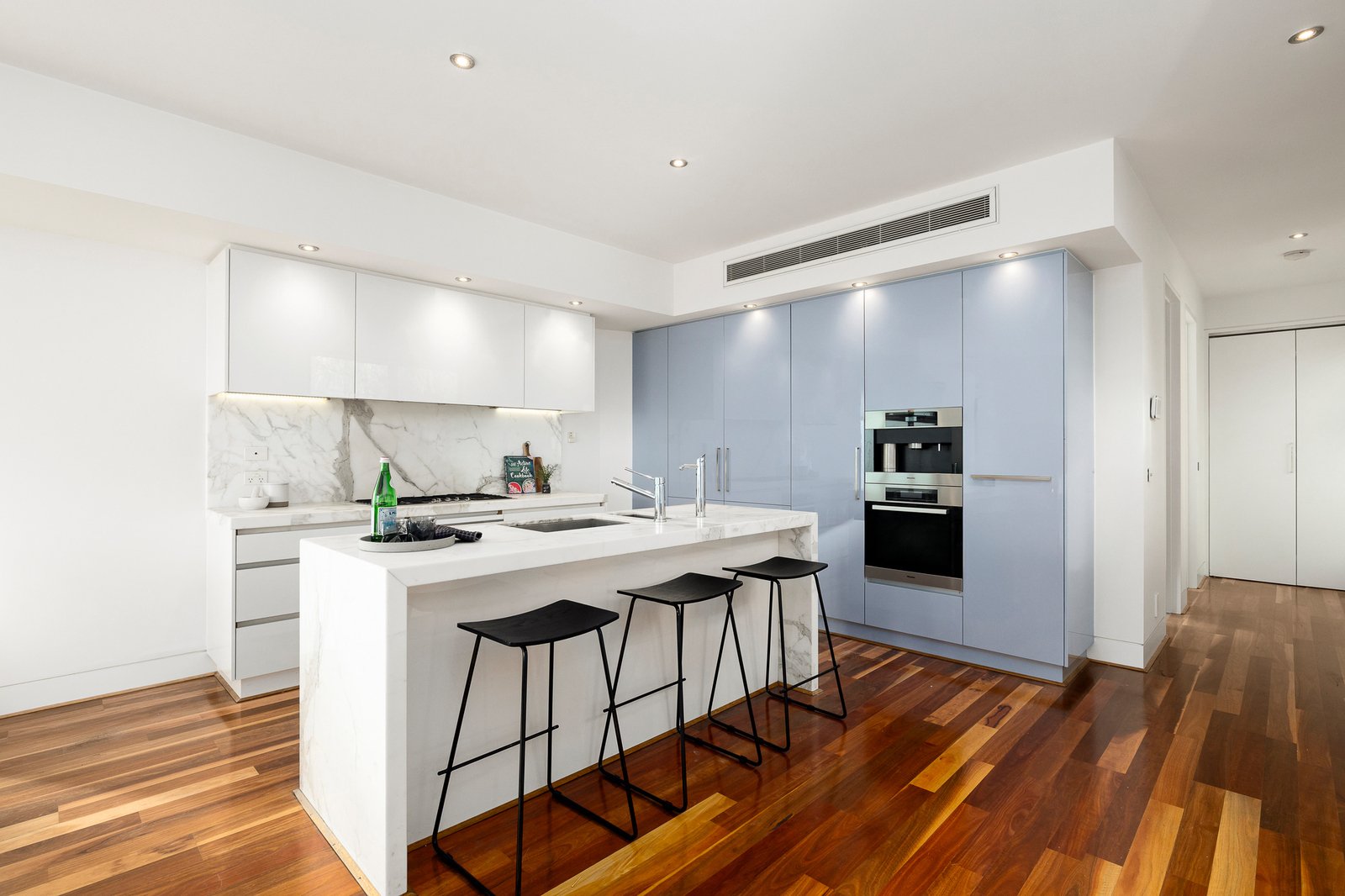 Full of natural light, the layout is tailored for sophisticated living with generous open plan living/dining areas enjoying a brilliant top floor position with gas fireplace, a smart gourmet kitchen featuring marble benchtops, Miele appliances including a plumbed coffee machine, and integrated Liebherr Fridge/freezer, and deep indoor/outdoor entertaining terrace. Two spacious bedrooms with BIRs each enjoy their own private zones, one with nearby bathroom, the main with chic ensuite.