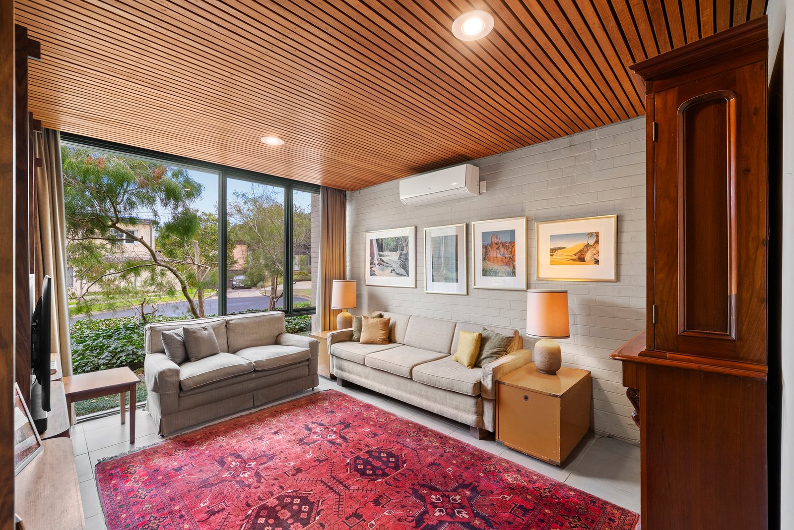Luxuriating in warm northerly sunshine thanks to an entire rear wall of glass, the home’s exquisite interiors are seamlessly connected to its idyllic & incredibly private golf-side surroundings - among its highlights are timber battened ceilings, original leadlight (by Mr Thompson himself) and a sloping skillion roof with clerestory windows.