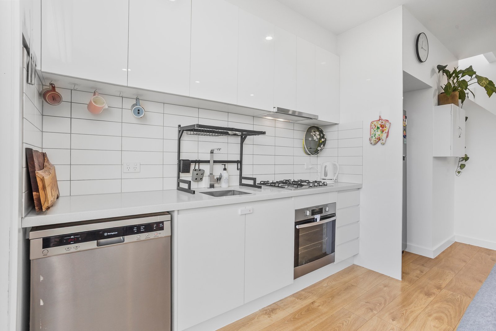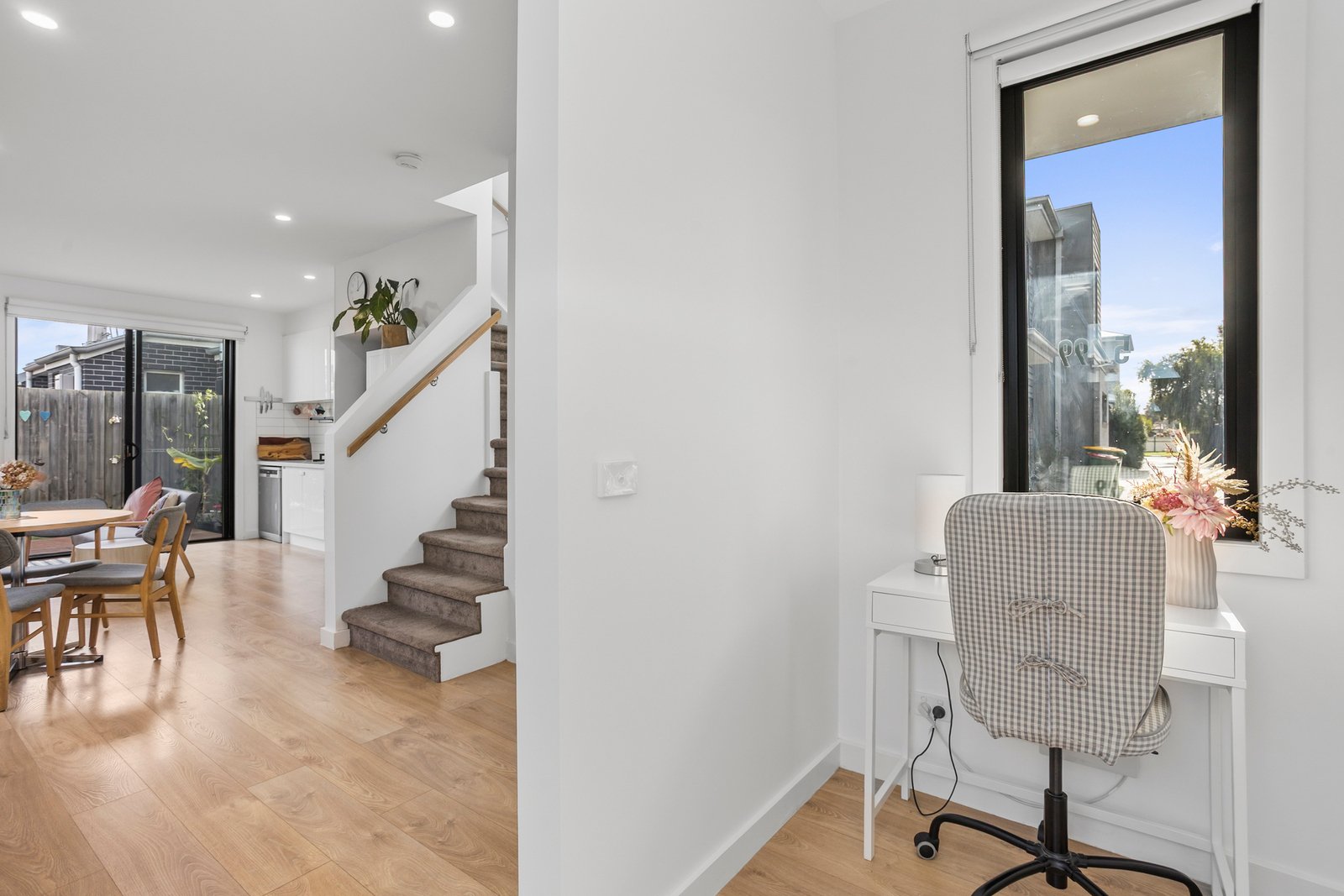 Step inside to a welcoming open-plan living, kitchen and meals area that spills out to a sunny deck and low maintenance courtyard with faux grass - the perfect space for entertaining or simply unwinding. The sleek kitchen features stone benchtops, white subway tiles, white cabinetry, a gas cooktop, electric under-bench oven and dishwasher. Also on the ground floor is a study nook, full laundry, powder room, and secure remote garage with rear access.