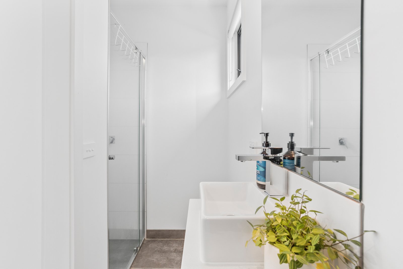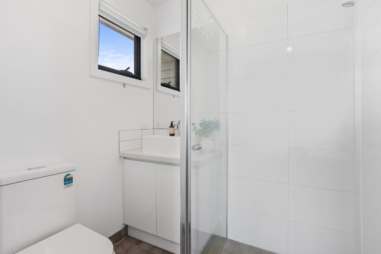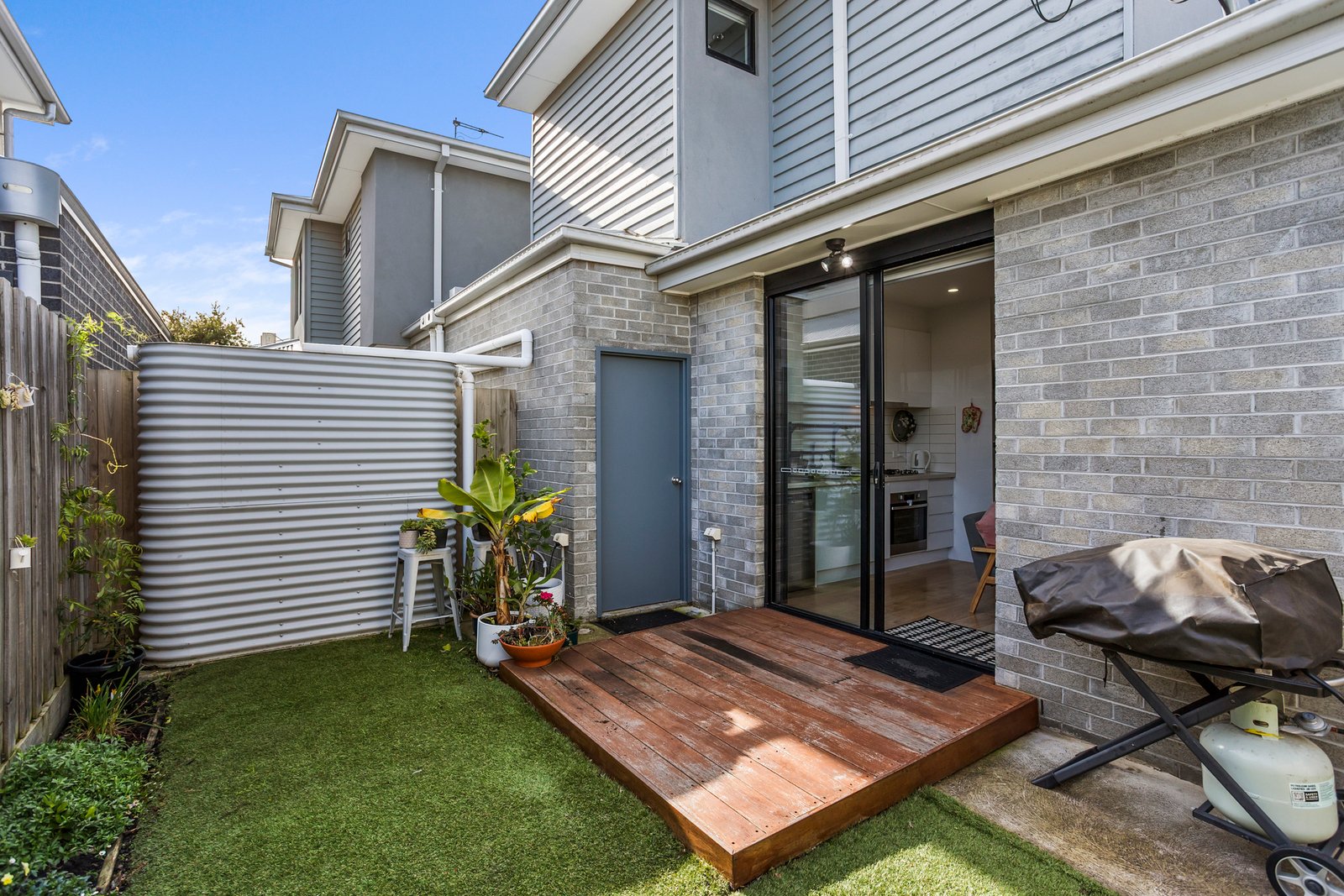 Upstairs, the master bedroom features a walk-in robe and private ensuite, while the second bedroom includes built-in robes and is serviced by a stylish main bathroom. The bathrooms are finished with grey floor tiles, white wall tiles, chrome tapware and modern white cabinetry, adding to the home’s clean and contemporary aesthetic. Timber floorboards add warmth downstairs, while carpet keeps the bedrooms cosy. Split system heating and cooling in the living area and master bedroom ensure year-round comfort, and a rainwater tank supports the home’s low-maintenance, eco-conscious outdoor living.