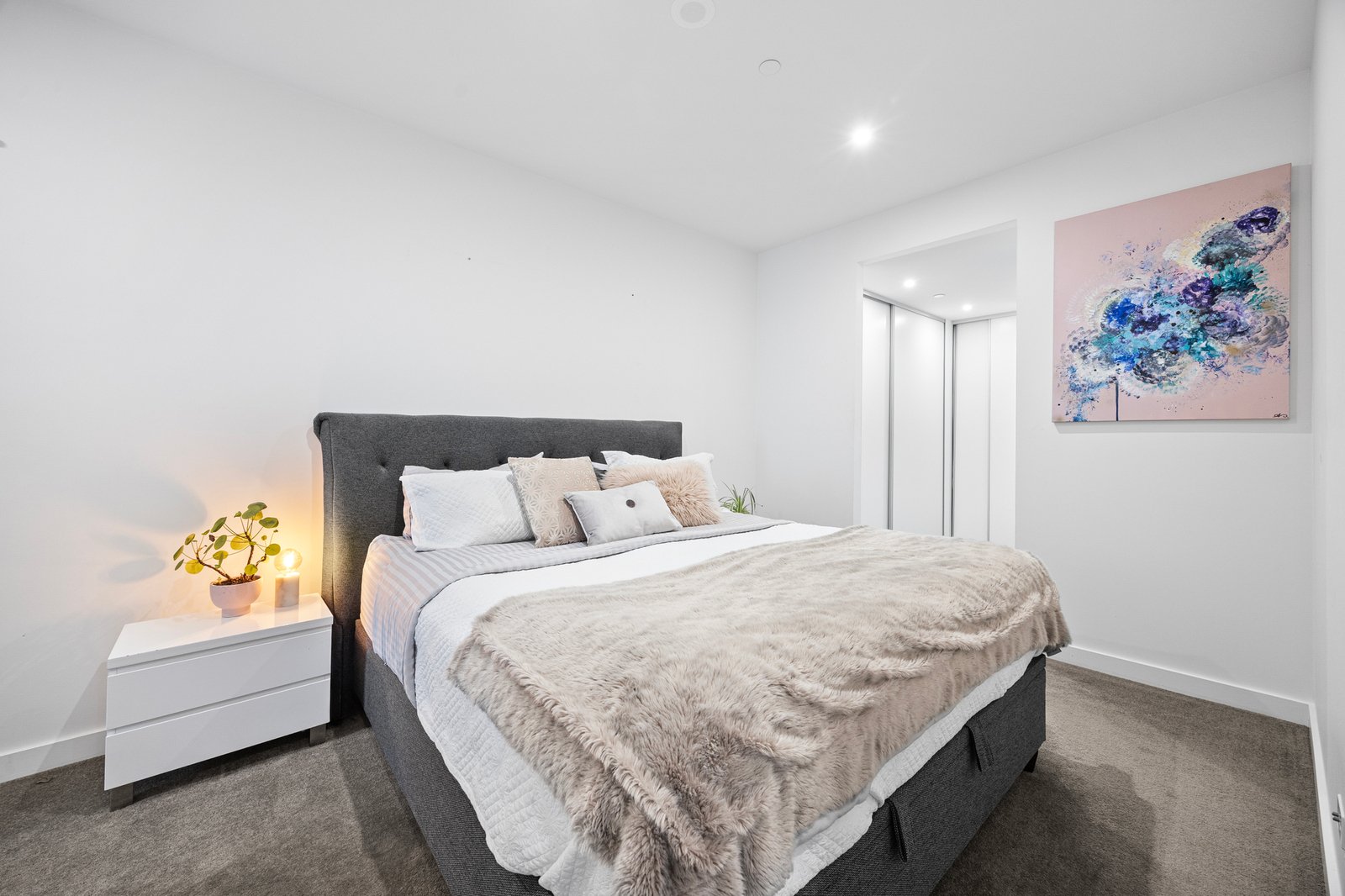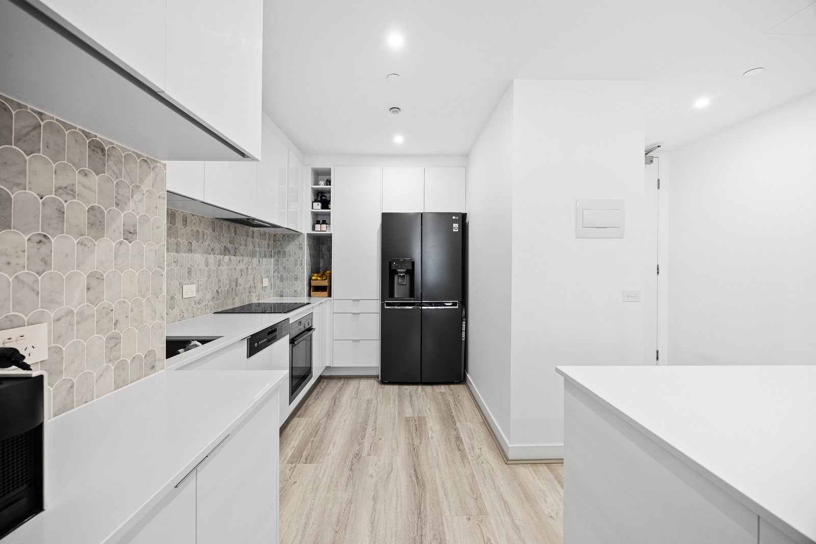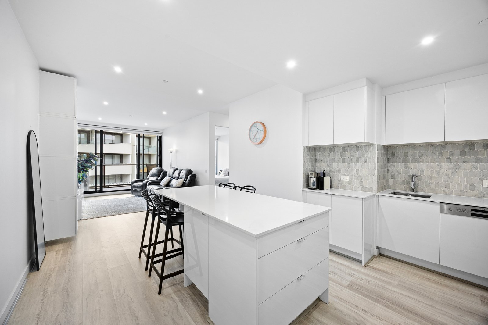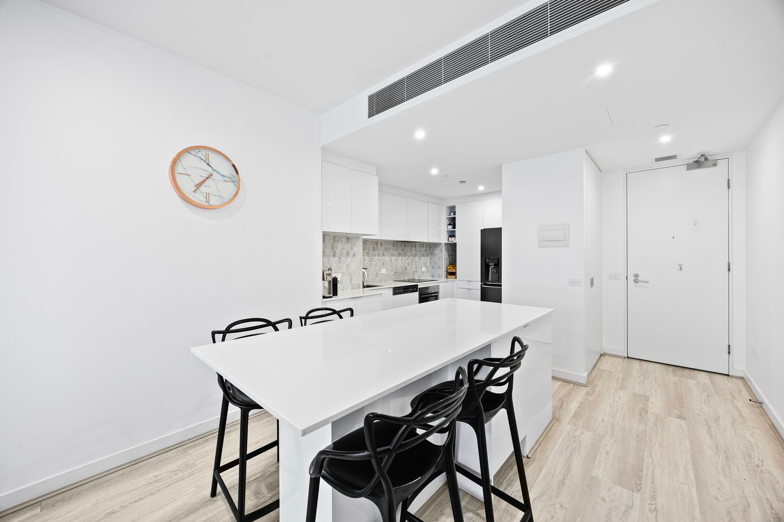 A calming palette of engineered oak flooring, sleek surfaces, glossy cabinetry, and expansive glazing sets a tone of understated luxury throughout the open-plan domain. At its heart, a streamlined kitchen appointed with Neff appliances, stone benchtops and a generous breakfast bar anchors the space - doubling as an inviting dining area for casual meals or elegant entertaining. Glass sliders extend the living area to a broad, full width al fresco balcony, perfectly oriented to capture the glow of sunlight and leafy neighbourhood outlooks.