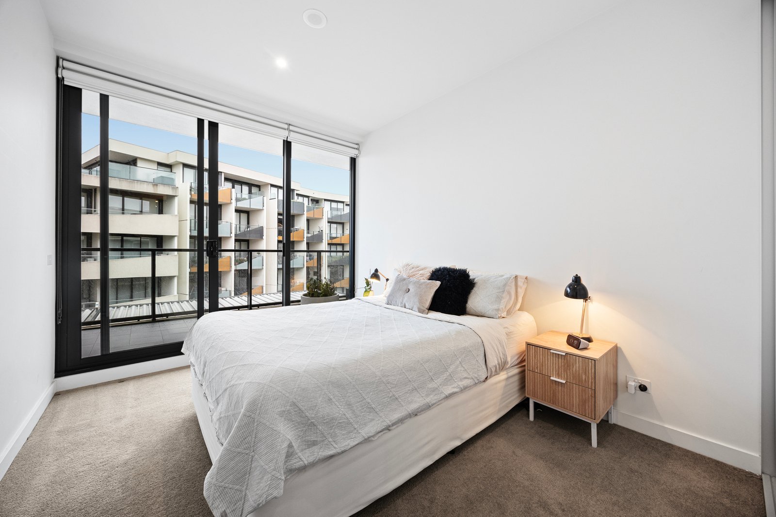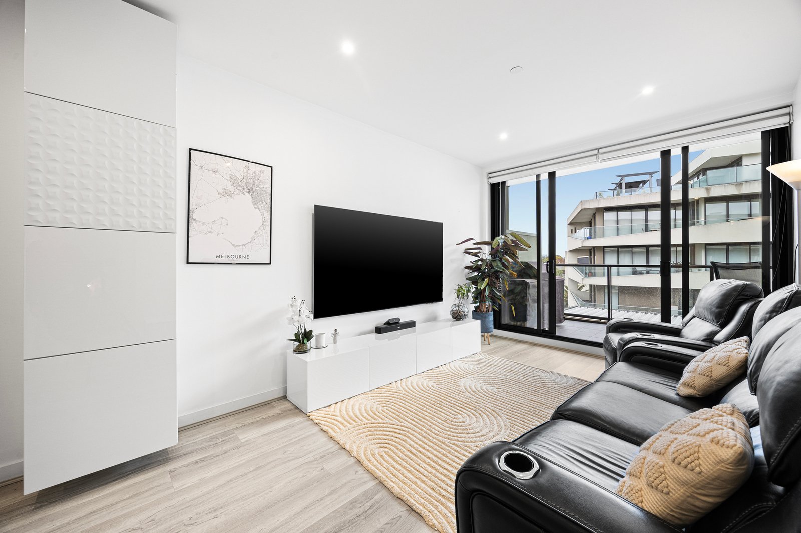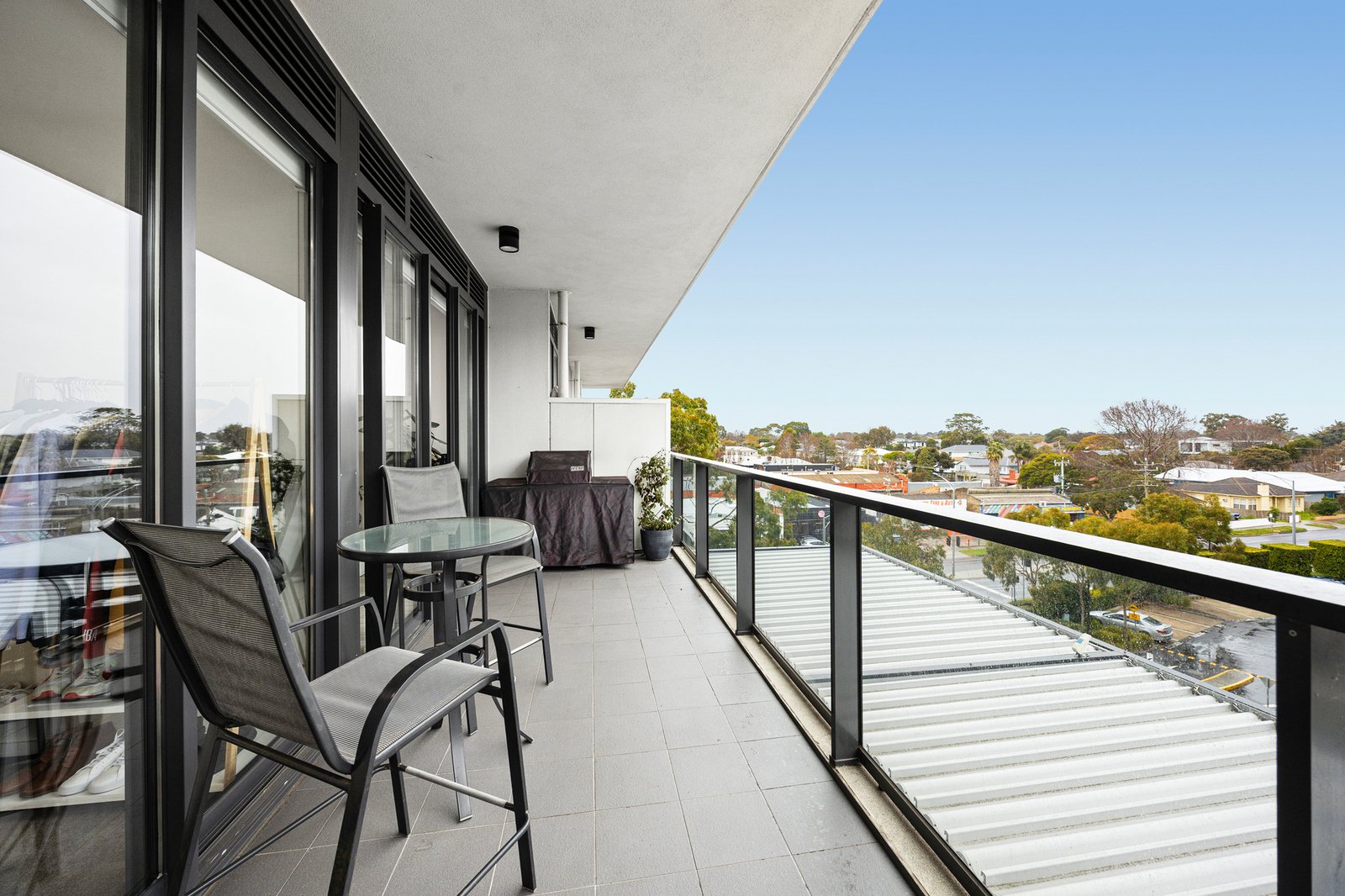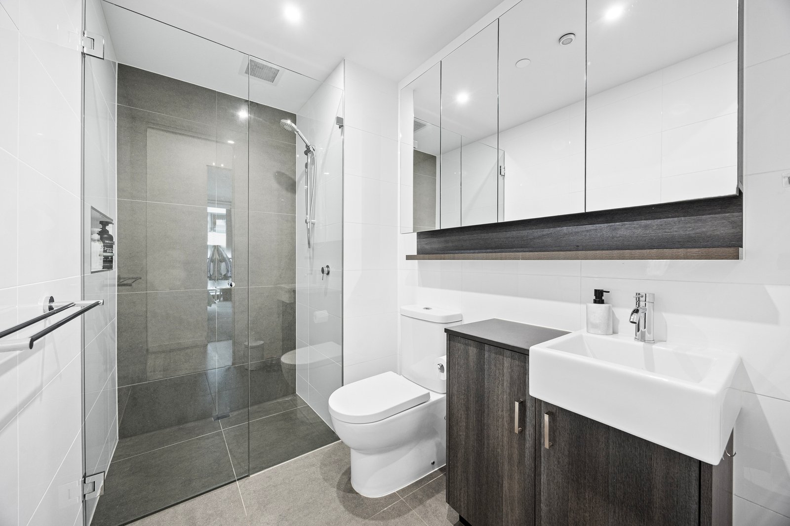 A calming palette of engineered oak flooring, sleek surfaces, glossy cabinetry, and expansive glazing sets a tone of understated luxury throughout the open-plan domain. At its heart, a streamlined kitchen appointed with Neff appliances, stone benchtops and a generous breakfast bar anchors the space - doubling as an inviting dining area for casual meals or elegant entertaining. Glass sliders extend the living area to a broad, full width al fresco balcony, perfectly oriented to capture the glow of sunlight and leafy neighbourhood outlooks.