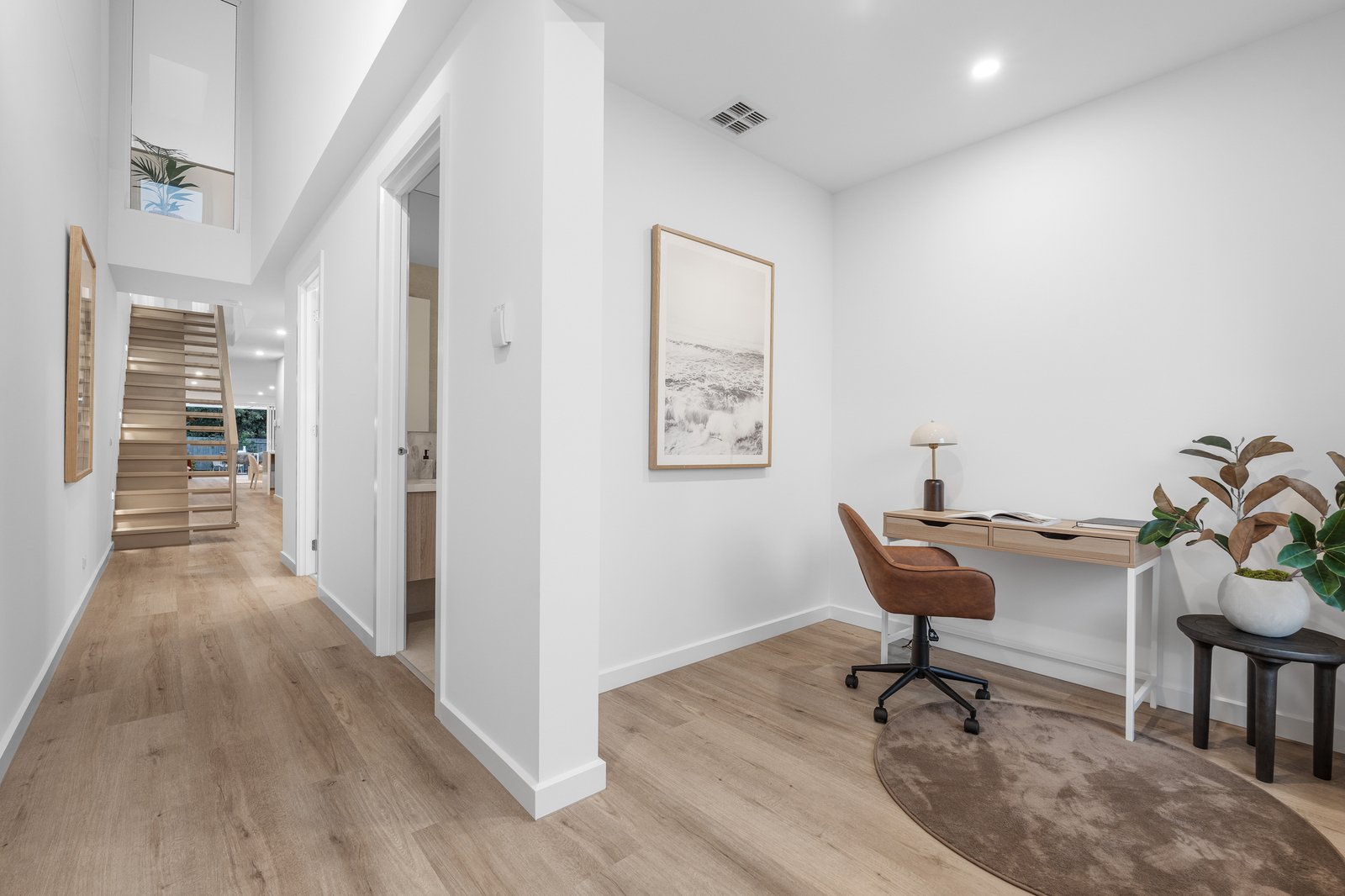 Timber floors and natural light filter through the spacious layout, with a towering entry void leading to a vast open-plan...