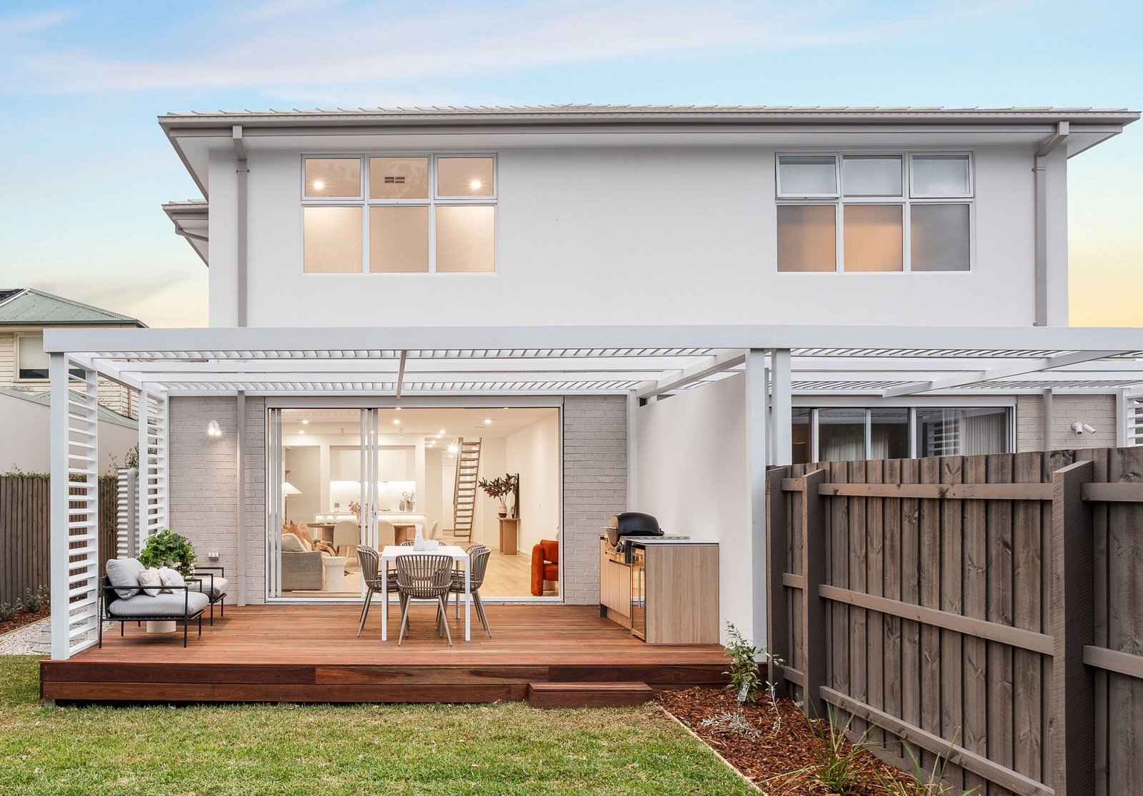 Timber floors and natural light filter through the spacious layout, with a towering entry void leading to a vast open-plan living/dining area unfolding to a private alfresco with built-in BBQ Kitchen. The streamlined kitchen is finished to the highest calibre, complete with Miele appliances, including double Miele ovens, sleek stone surfaces and Butler’s pantry – a culinary enthusiast’s dream.