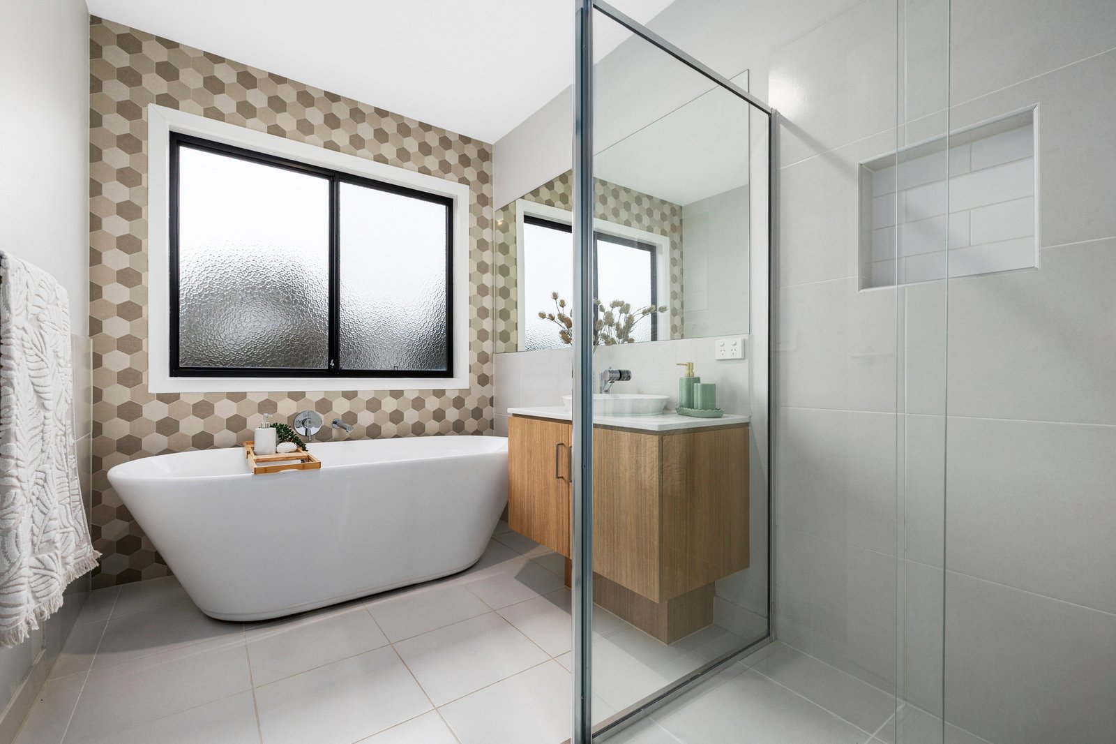 Also on this upper level are two additional double bedrooms (both with robes) sharing the designer family bathroom with freestanding bath plus a handy separate WC – a ground floor powder room continues the convenience and completing a satisfying package are ducted heating/split systems plus a laundry, ample storage and internal entry to the auto garage.