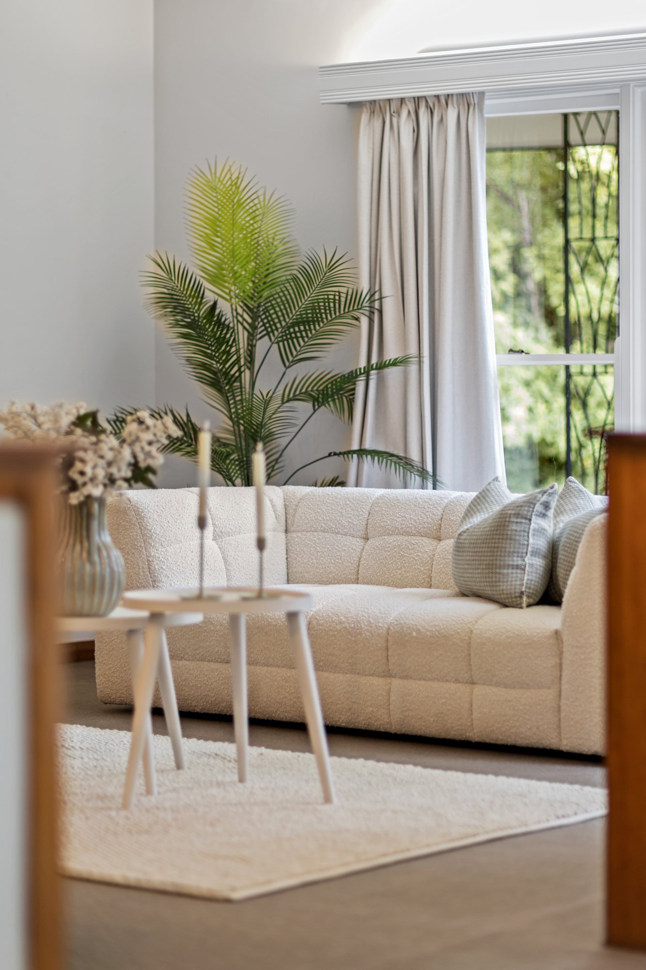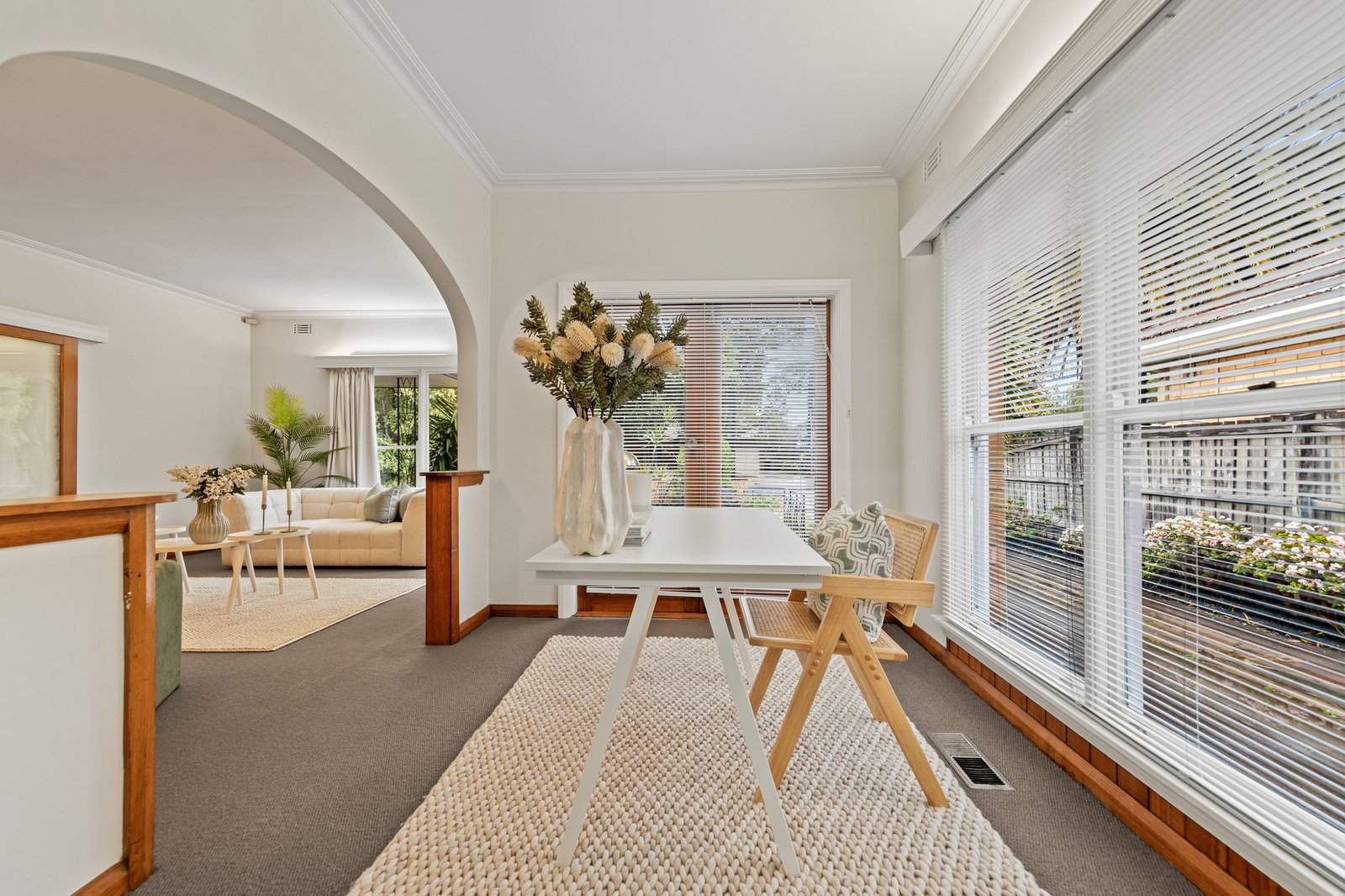 The sunlit living room, complete with a cozy fireplace, flows effortlessly into the dining area which opens directly onto the front yard, ideal for enjoying a relaxed indoor-outdoor living. At the heart of the home is a classic kitchen equipped with a quality oven and dishwasher, alongside a dedicated meals area that makes everyday dining a pleasure.