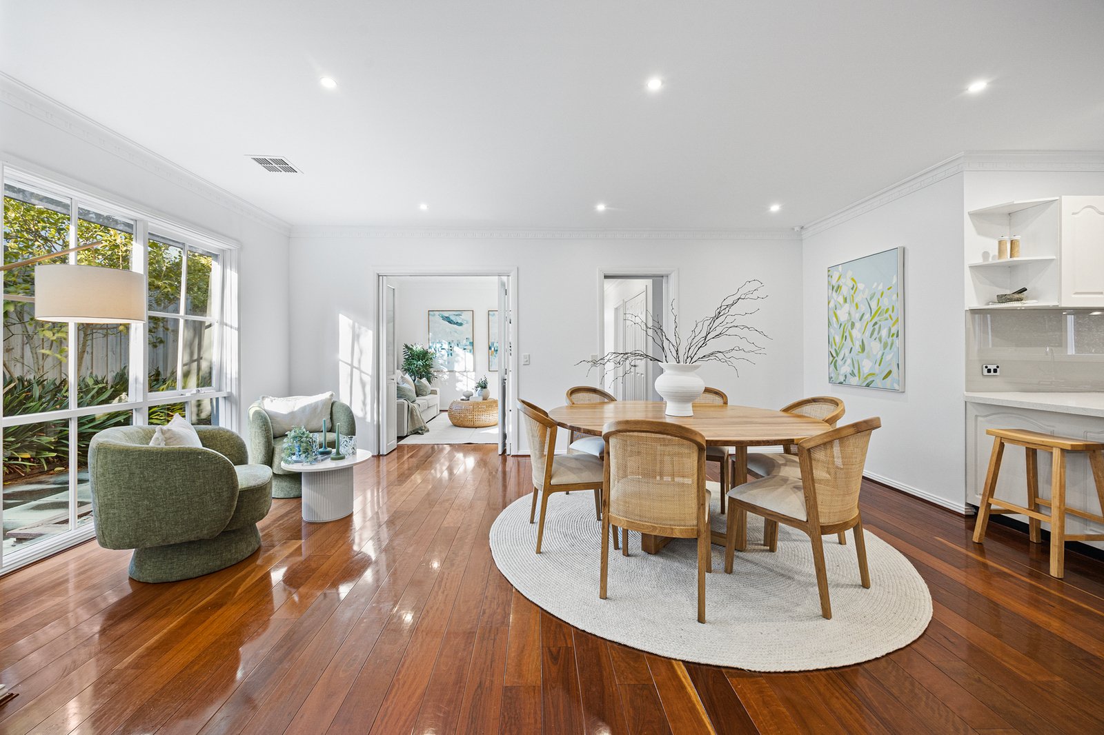 The generous living and dining domain is bathed in northern sun and spills seamlessly onto a broad al fresco terrace. Here, lush plantings offer seclusion and charm, creating a sublime outdoor setting for relaxed dining, morning coffee or balmy summer evenings. Secure front gardens also provide a safe space for children and pets to play.