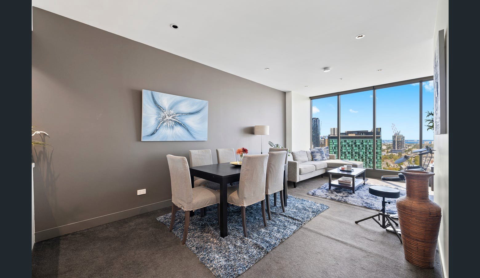 An immediate sense of space and sophistication is apparent upon entry as the light and bright living and dining domain is framed by panoramic vistas across the Yarra River, Port Phillip Bay and Melbourne’s iconic city skyline.