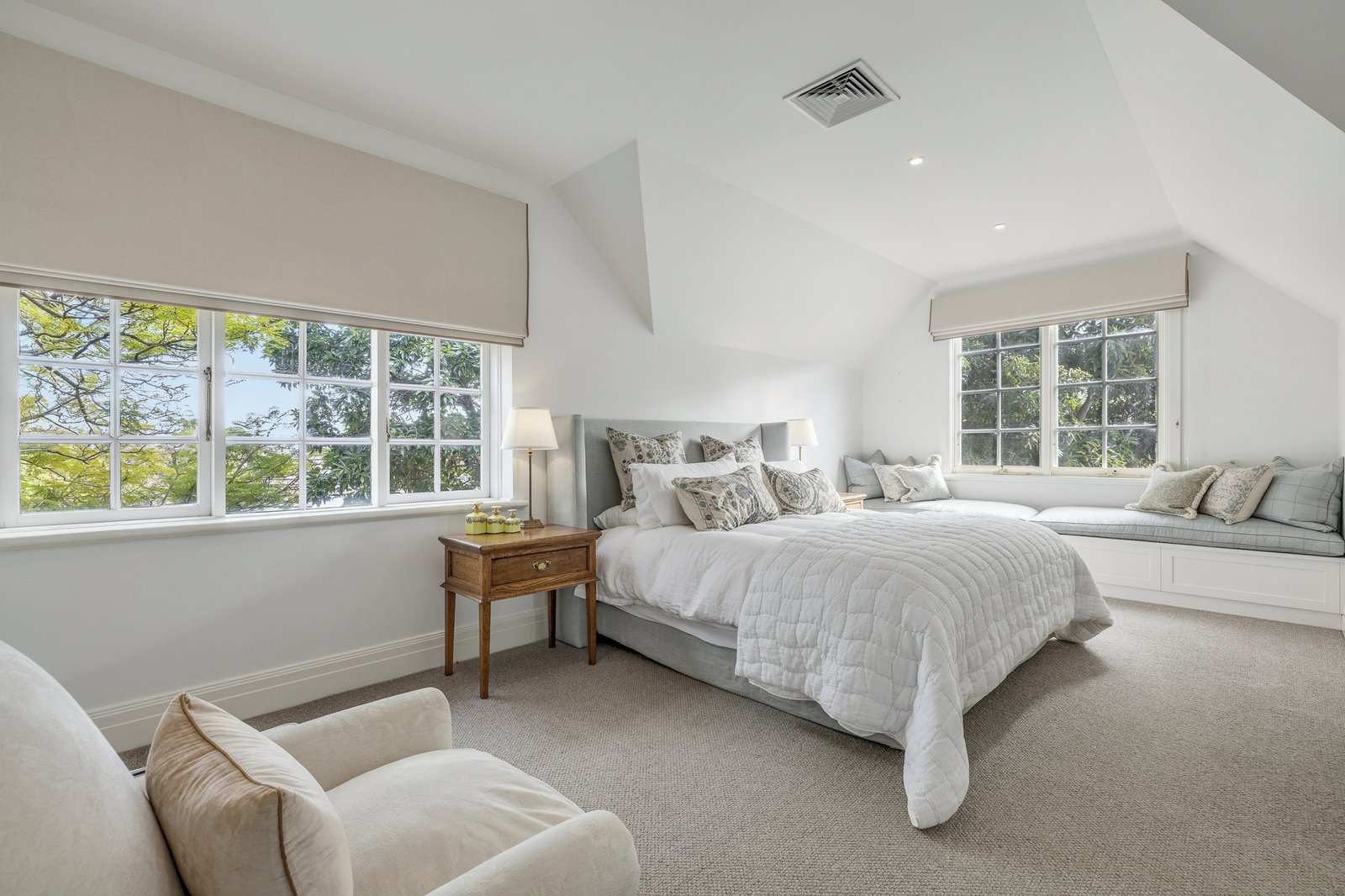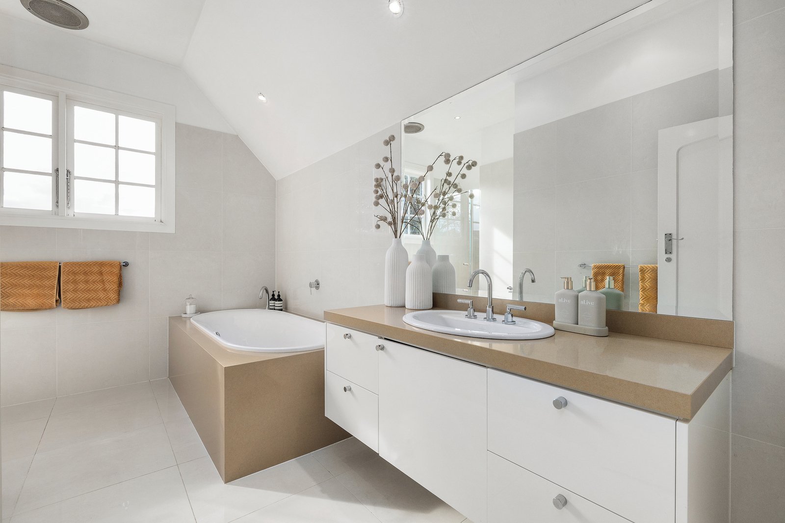 Upstairs, the bedroom level ensures peaceful separation and comfort, with both bathrooms featuring luxurious underfloor heating. The main suite is a sunny sanctuary with a walk-in robe, skylit ensuite, built-in window seat with storage and beautiful northern light. Two further robed bedrooms are complemented by a spacious family bathroom with a stone vanity and full-size bath, while a fourth bedroom offers flexibility as a nursery or study.