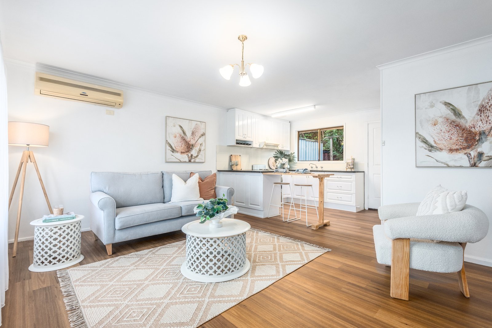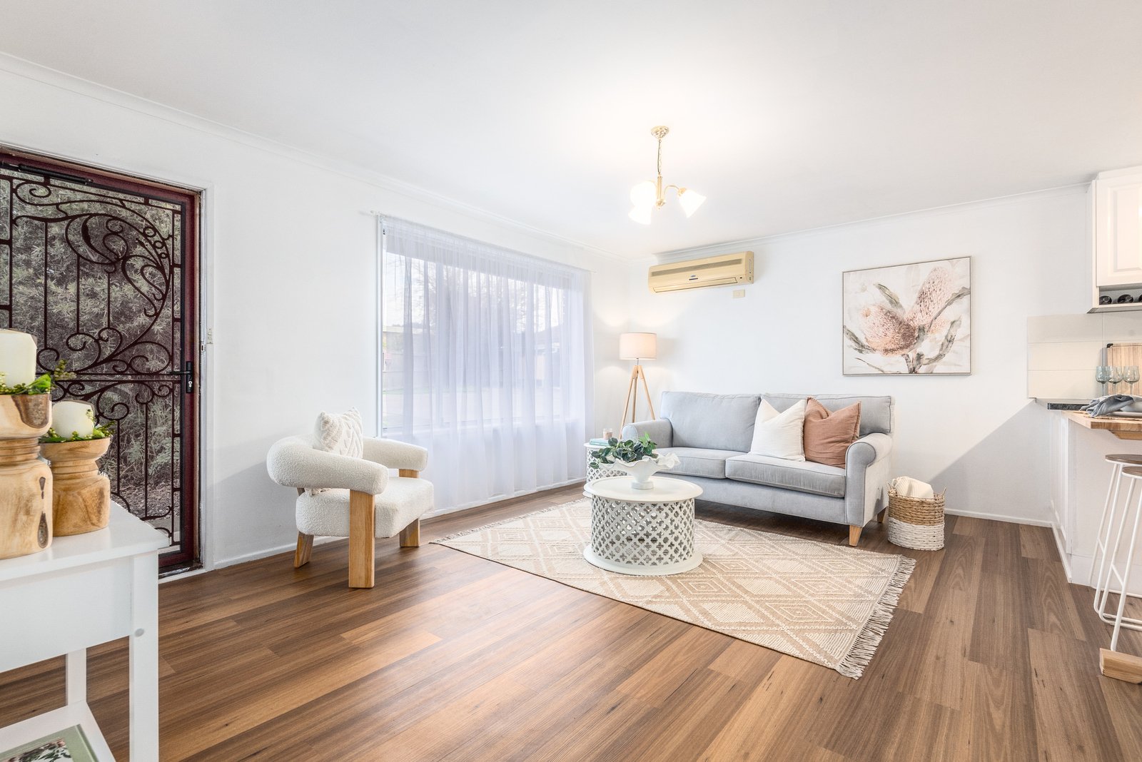 On entry, a welcoming open plan living area features light interiors and modern flooring, with split system cooling and a gas heater for year-round comfort. The elegant kitchen features quality cabinetry, stainless steel 600mm oven and cooktop, excellent storage provisions, breakfast bar seating, and direct access to the rear courtyard for easy indoor-outdoor entertaining.