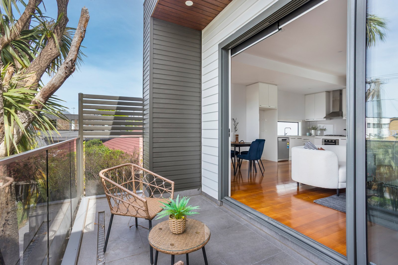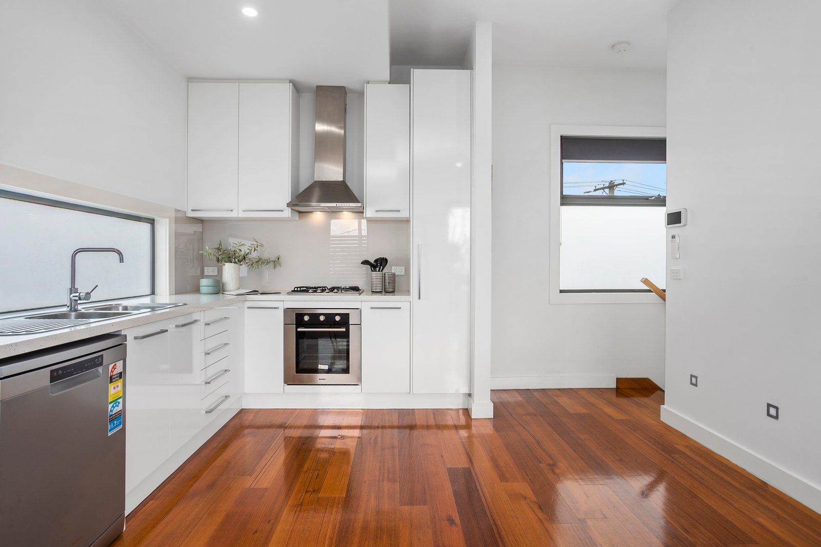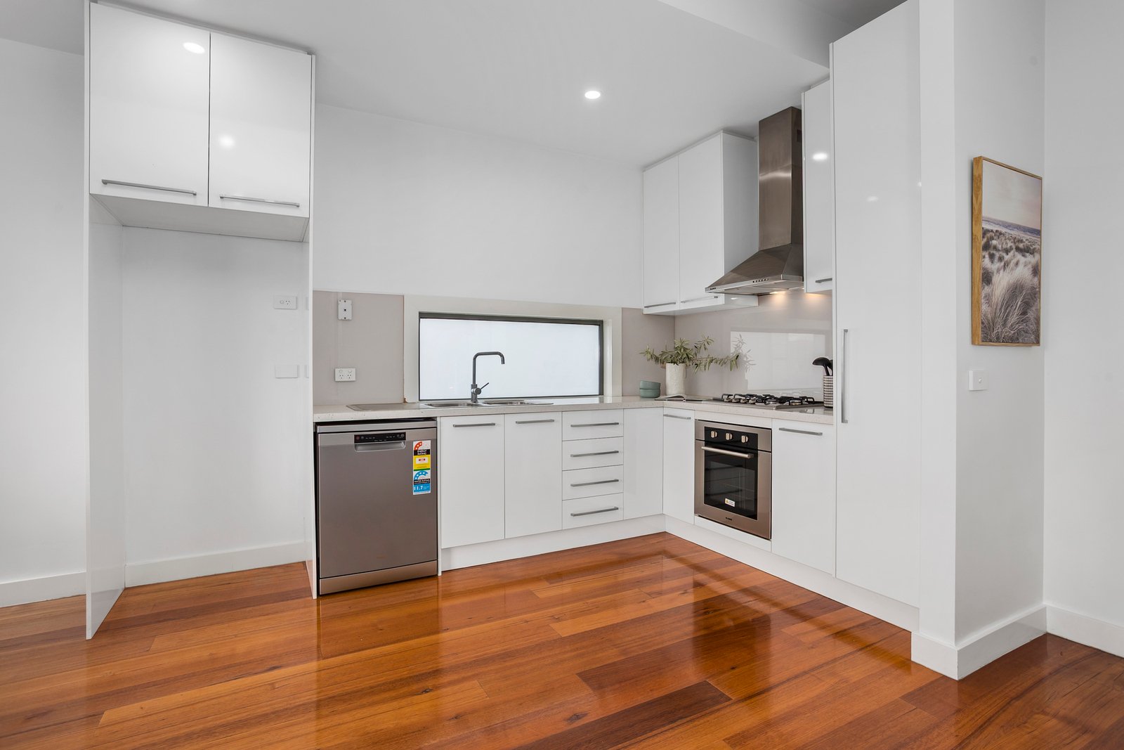 Upstairs, the home truly comes alive with open-plan kitchen, dining, and living spaces bathed in lovely natural light. The modern kitchen showcases white cabinetry, Blanco appliances including dishwasher, electric under-bench oven, gas cooktop, and stylish frosted glass splashback, making it a pleasure to prepare meals. Step out onto the balcony and soak in the neighbourhood atmosphere - the perfect spot for morning coffee or evening unwinding.