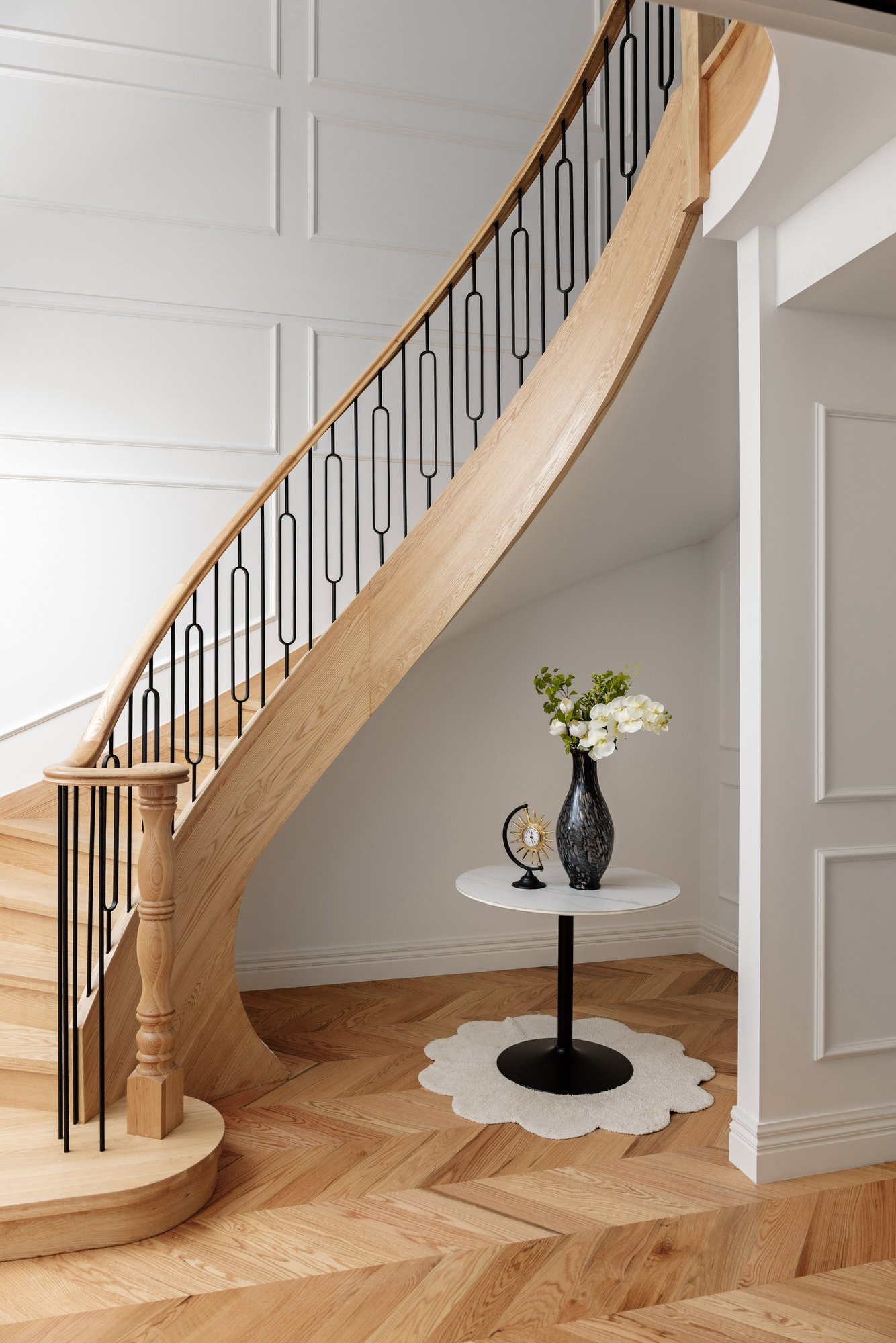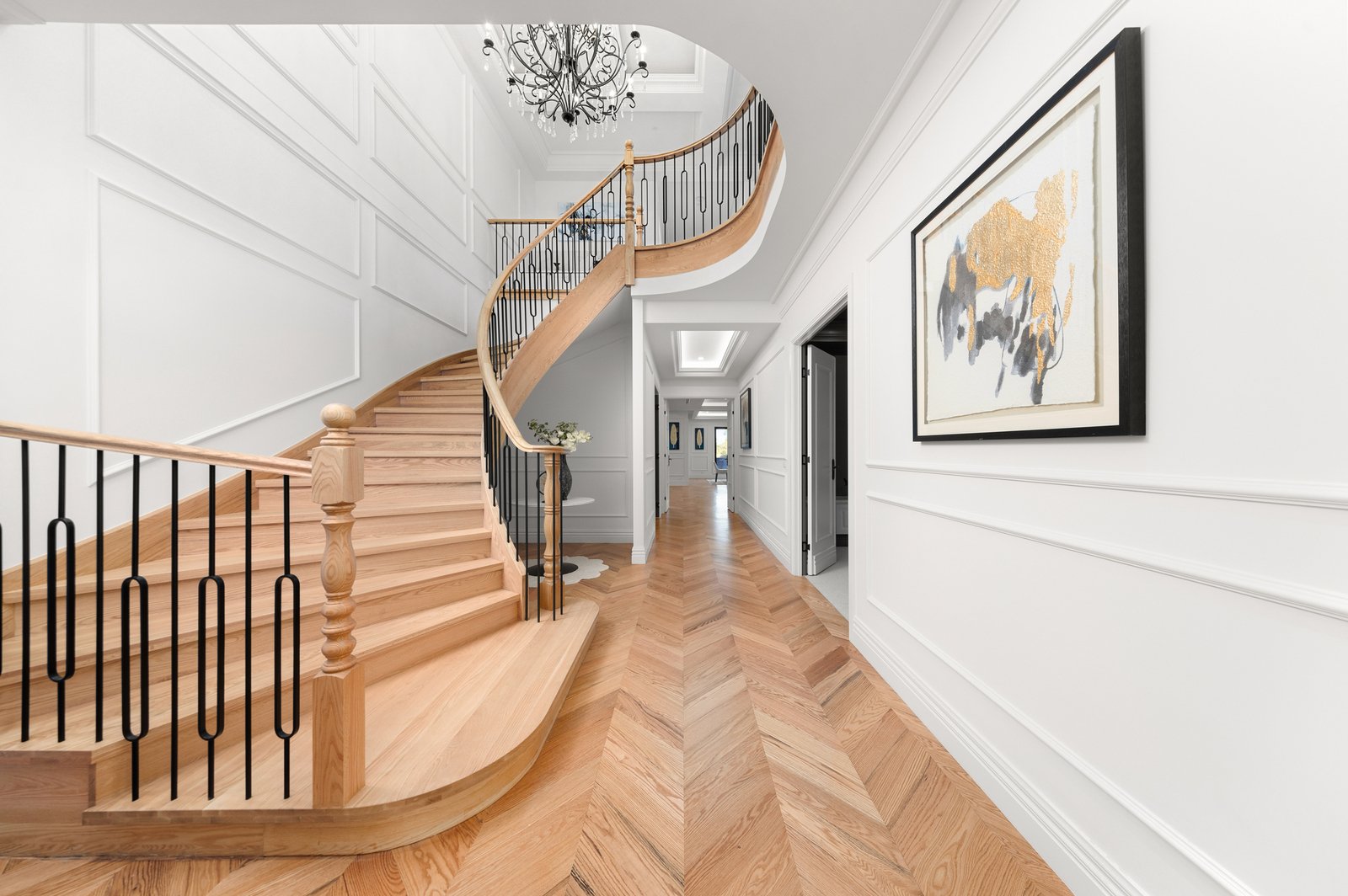 Set beyond automated wrought-iron gates and manicured gardens, the striking façade framed by classical columns and black steel-framed windows makes a commanding impression. Step inside and the opulence continues—a soaring double-height void, sweeping oak staircase, ornate cornices, and chevron parquetry flooring establish a tone of sophistication rarely seen at this scale.